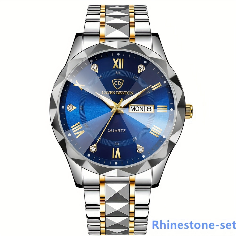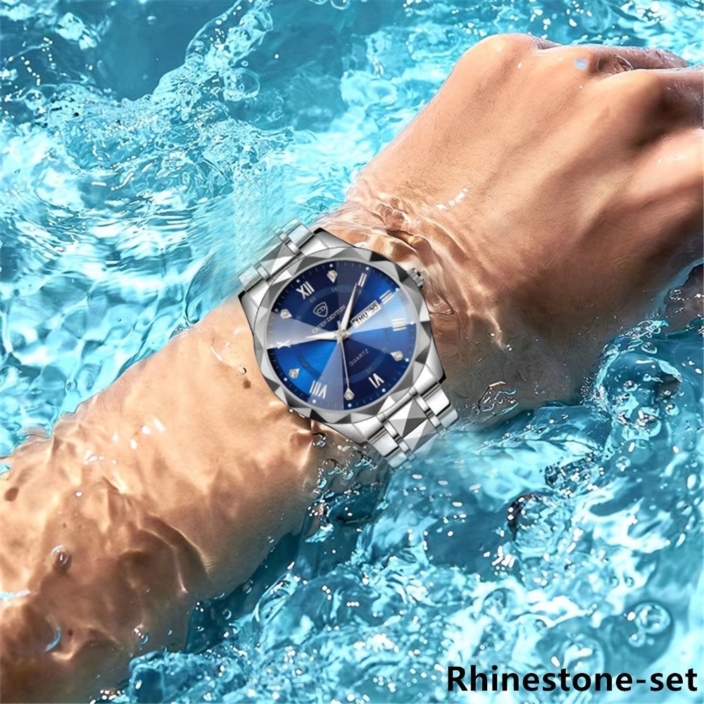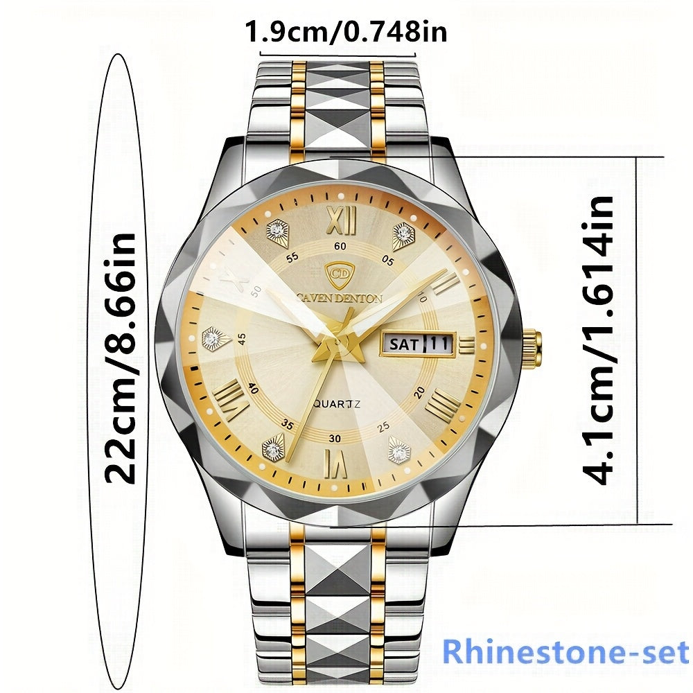 Նորաձև տղամարդու քվարցային ժամացույց ադամանդե ցուցատախտակով, IPX7 ջրակայունությամբ, կրկնակի օրացույցով, լուսավոր պողպատե ժապավենով, գործնական ժամացույց