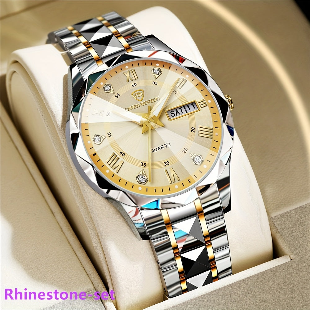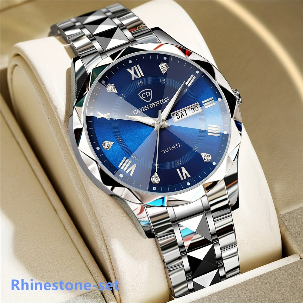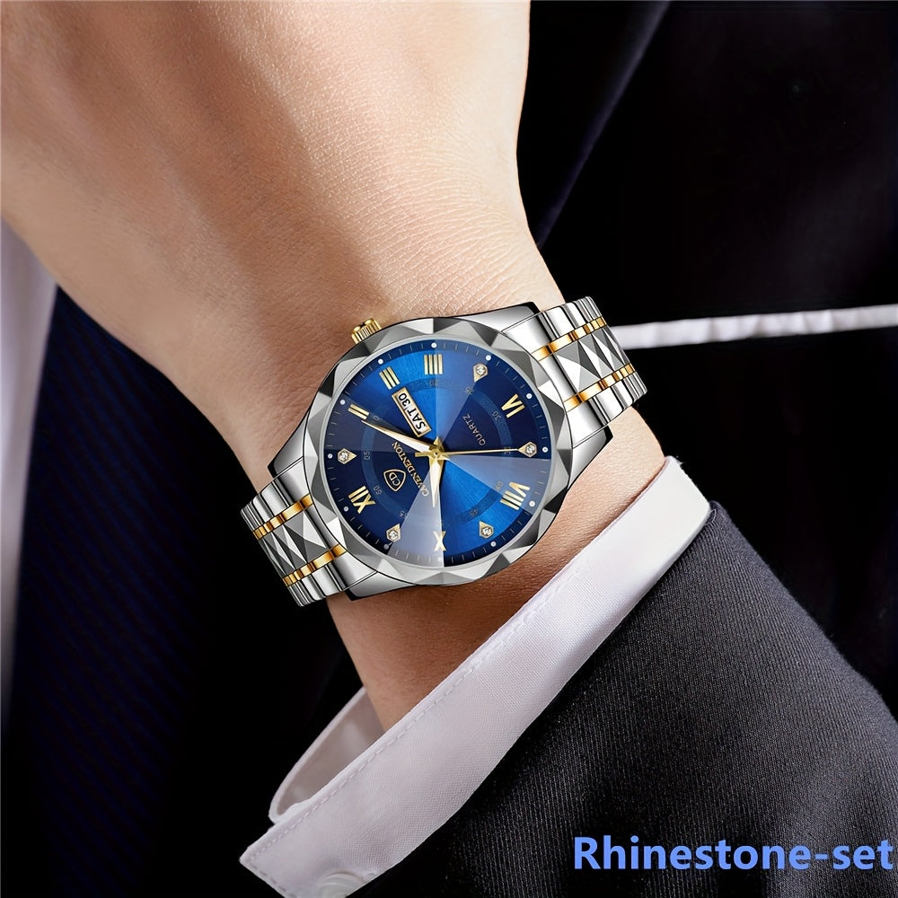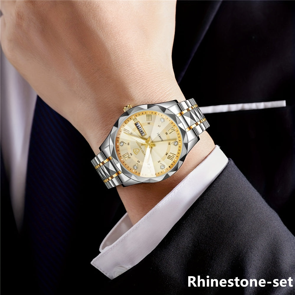 Նորաձև տղամարդու քվարցային ժամացույց ադամանդե ցուցատախտակով, IPX7 ջրակայունությամբ, կրկնակի օրացույցով, լուսավոր պողպատե ժապավենով, գործնական ժամացույց