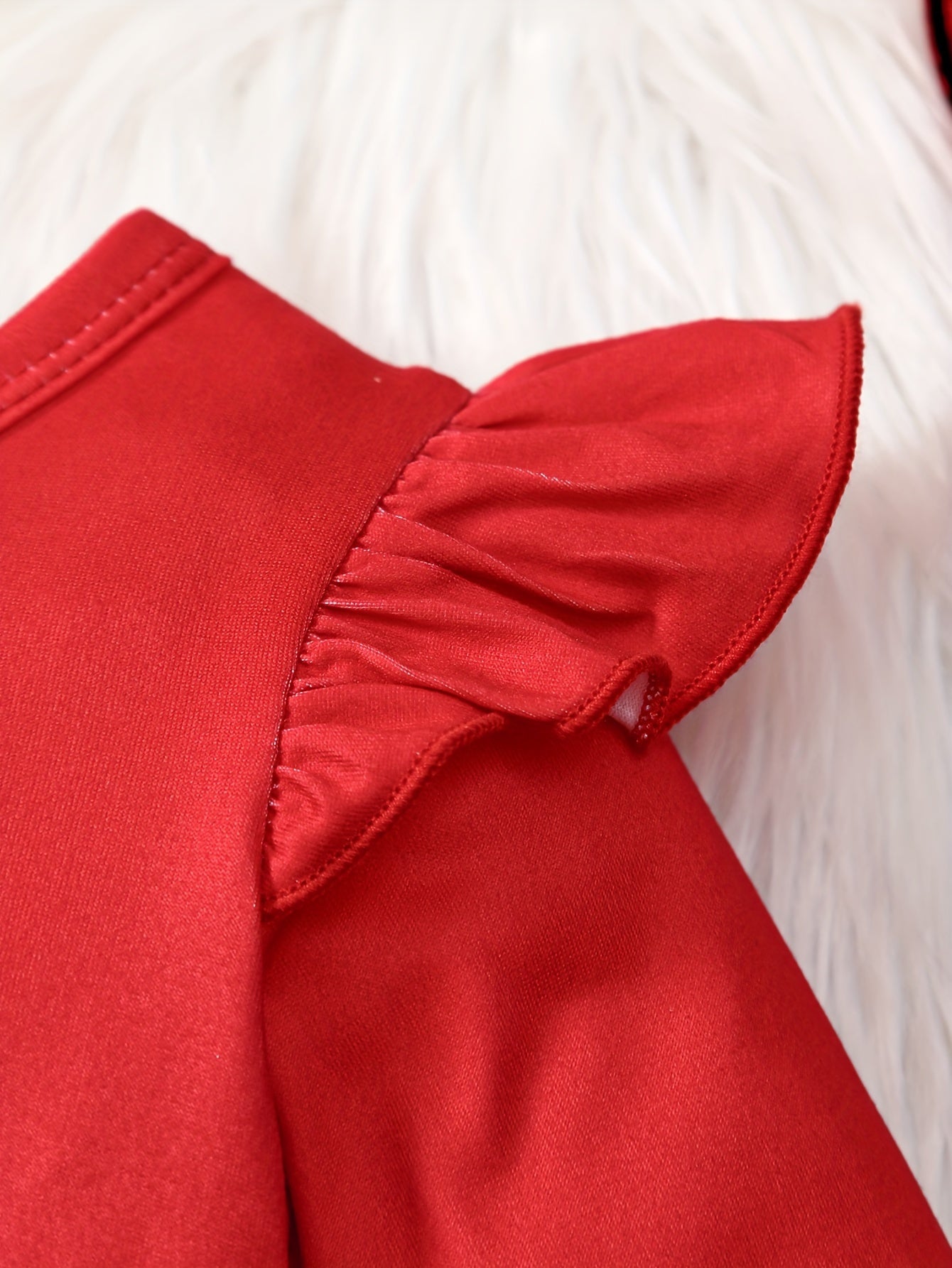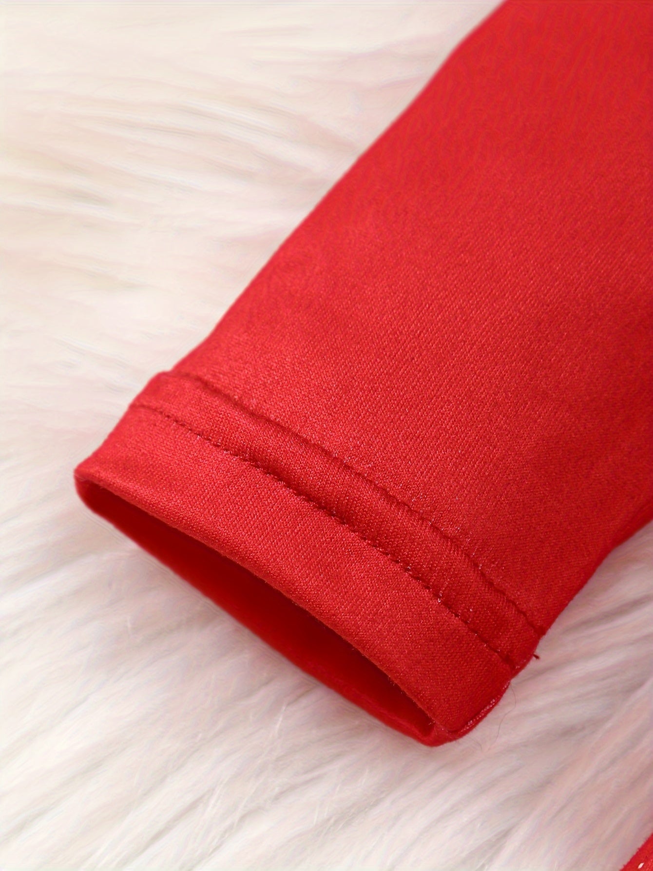 Տոնական երկար թևքերով, ծալքավոր զարդանախշերով զգեստ՝ Ձմեռ պապի և ձնեմարդու նախշերով, պոլիեսթերի խառնուրդով և թեթևակի ձգվող, գարուն/աշուն ամենօրյա տրիկոտաժե գործվածքից։