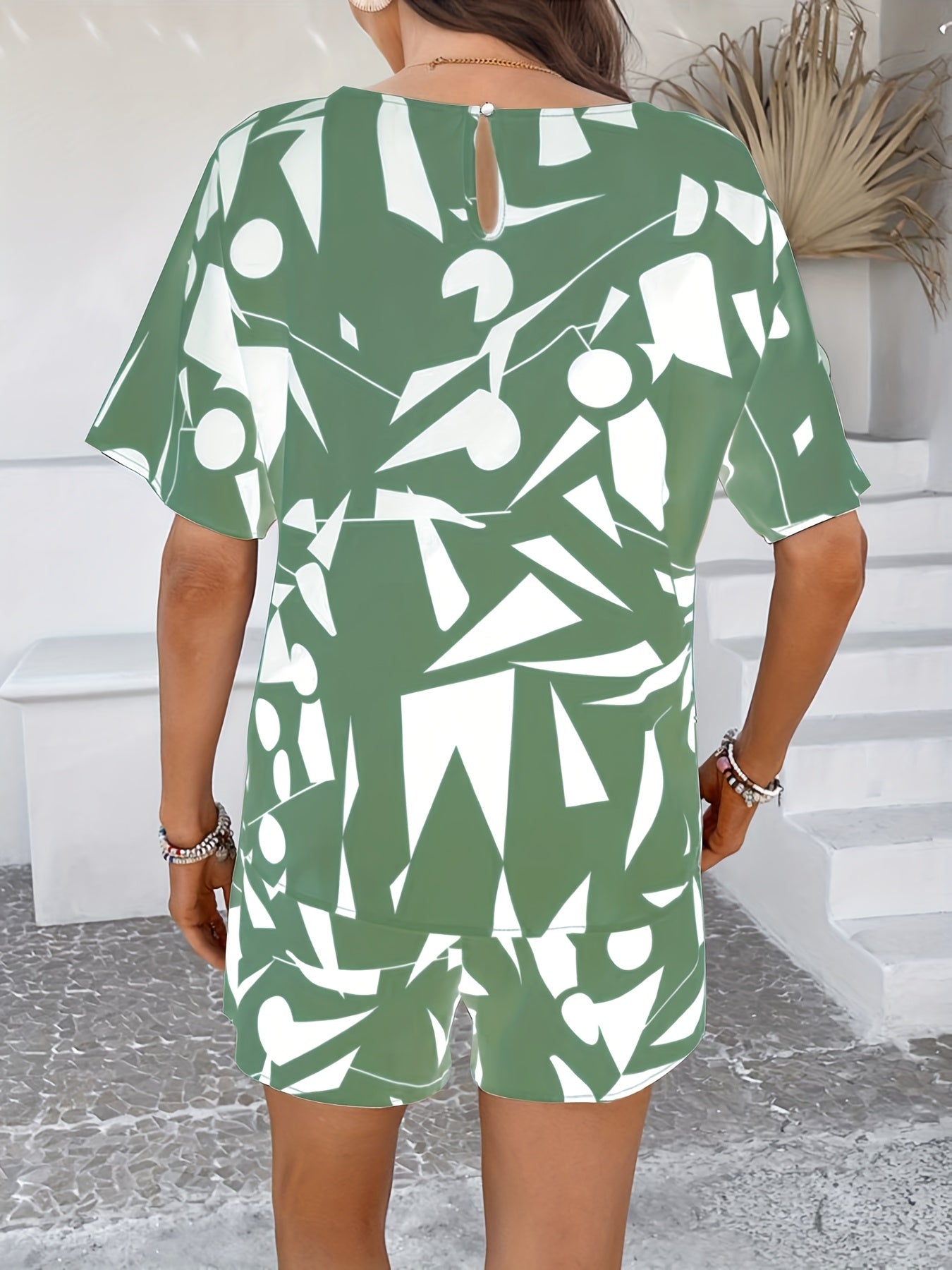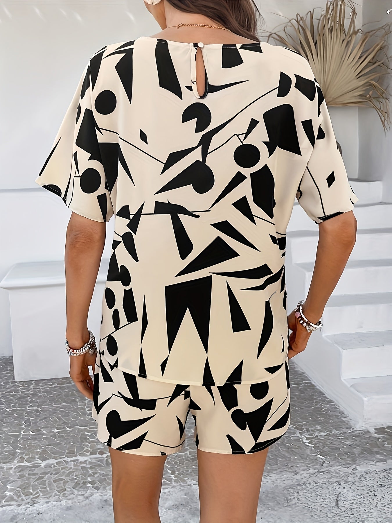 Geo Print Casual Shorts հավաքածու, Crew Neck Batwing կարճ թև առանցքային անցքով վերնաշապիկ և առջևի հանգույցներով շորտեր, կանացի հագուստ