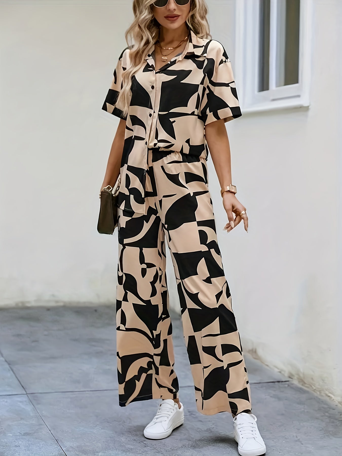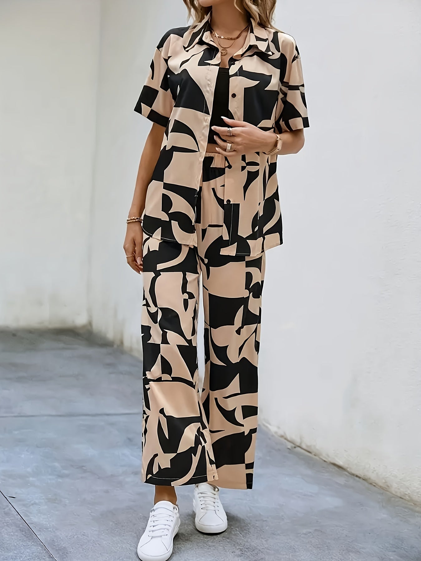 Երկրաչափական նախշերով կոճակներով կարճ թևքով վերնաշապիկ և լայն տաբատ, գարնանային և ամռան համար նորաձև վերնաշապիկների հավաքածու