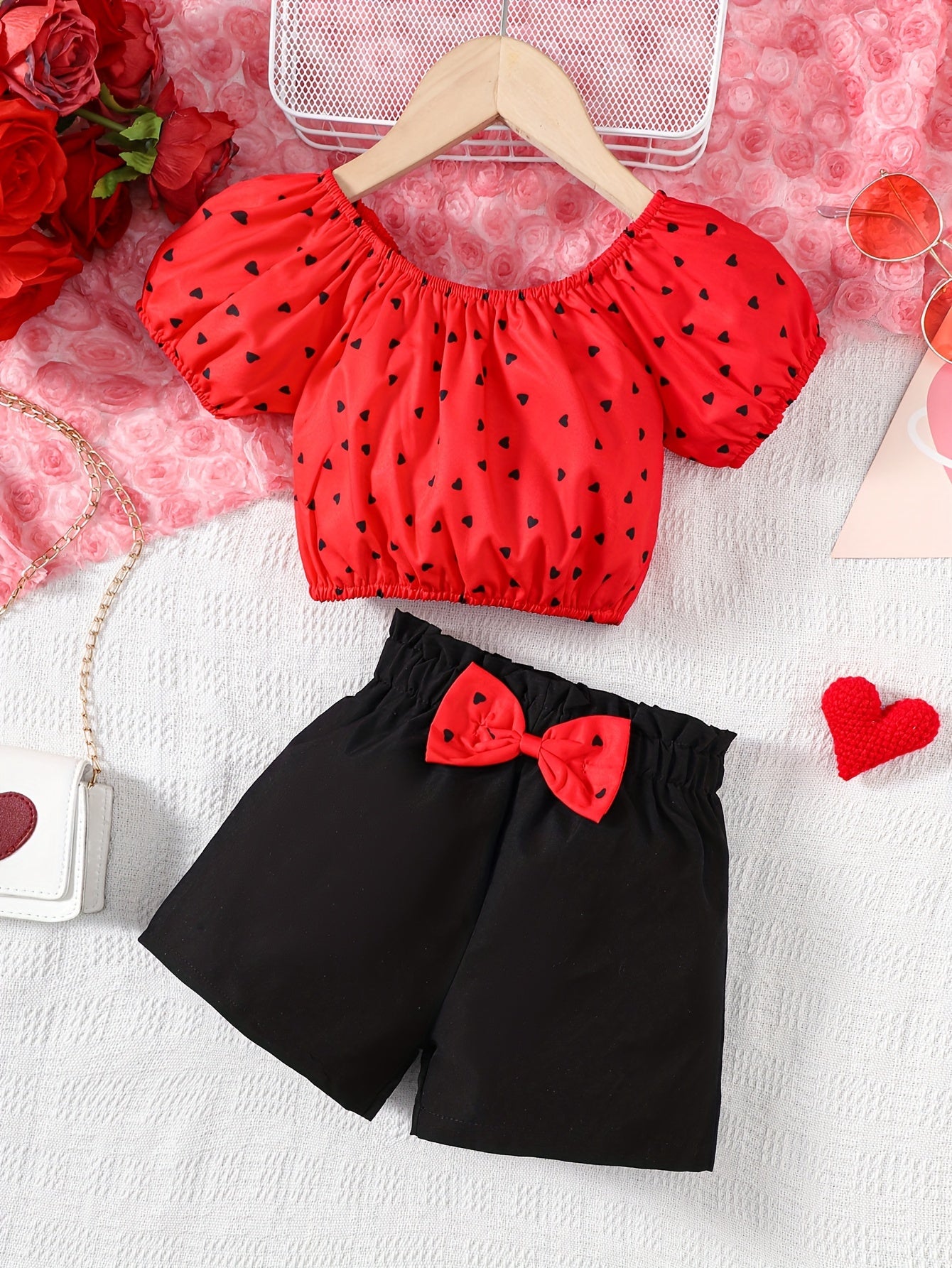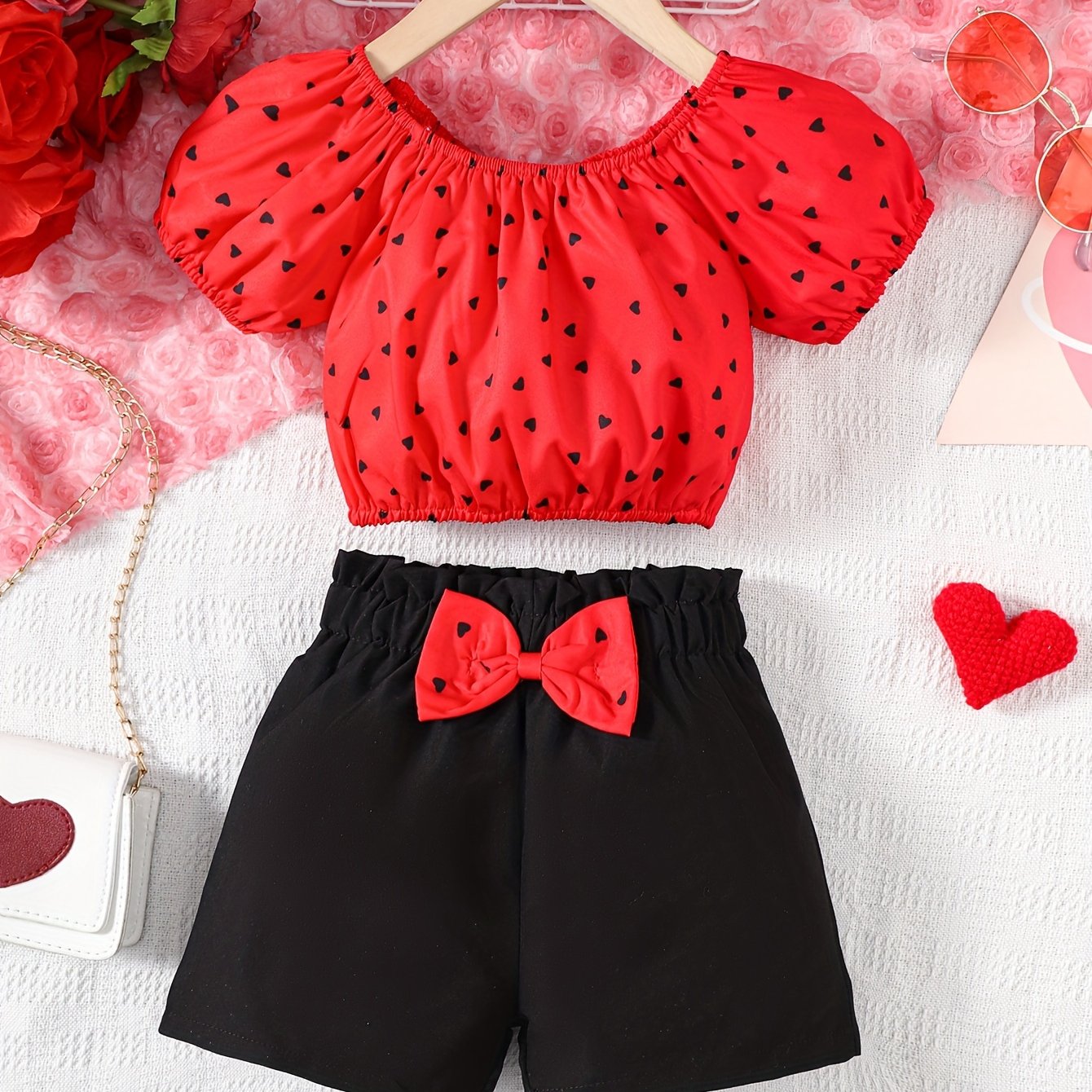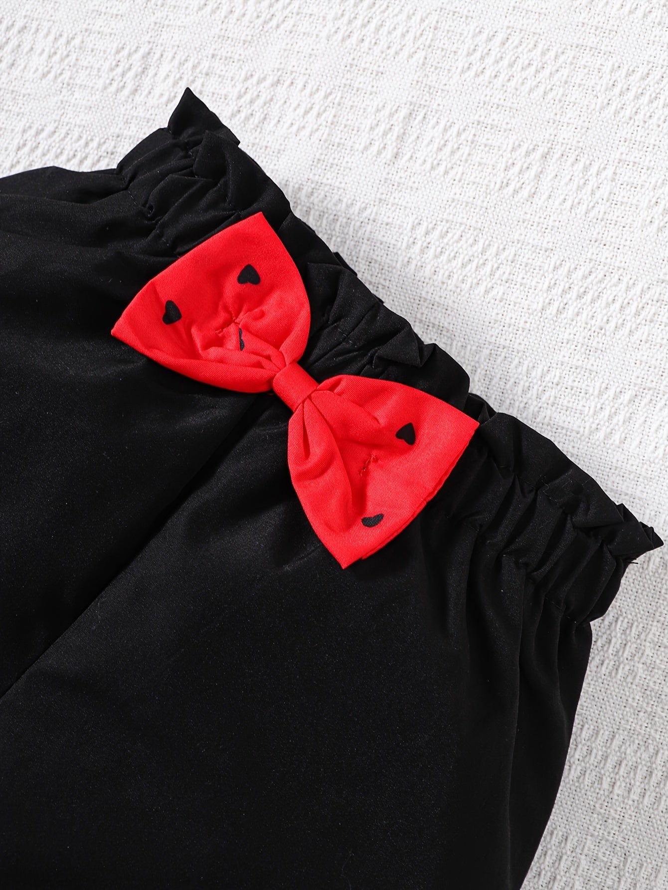 Աղջիկների 2 հատ հանդերձանքի հավաքածու, էլեգանտ կարճաթև վերնաշապիկ՝ սրտի ձևանմուշով և աղեղով, սովորական սև շորտեր, պոլիեսթեր 100%, ոչ ձգվող, հյուսված, գարուն/ամառ/աշուն, 4-7 տարեկան, բացօթյա համար