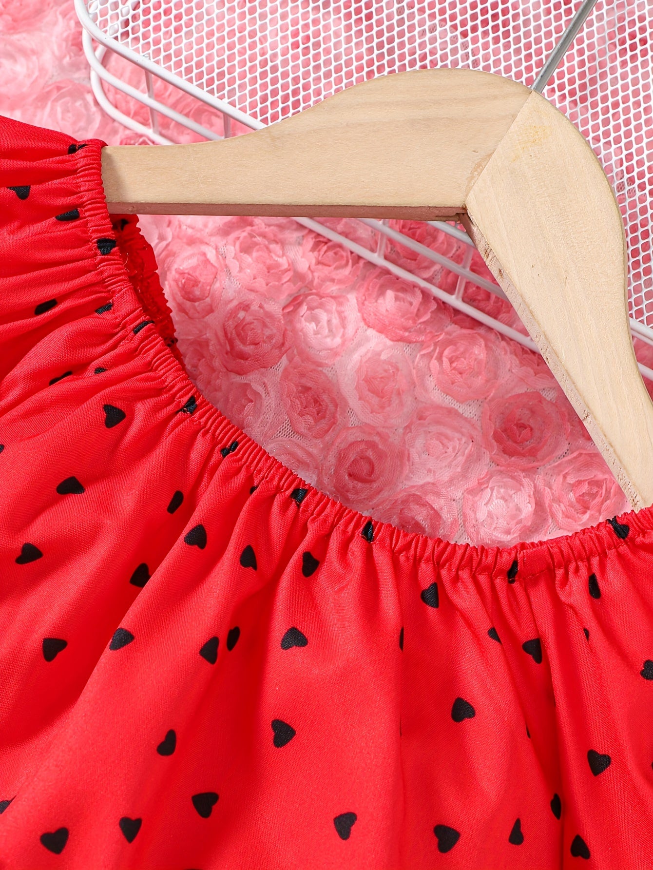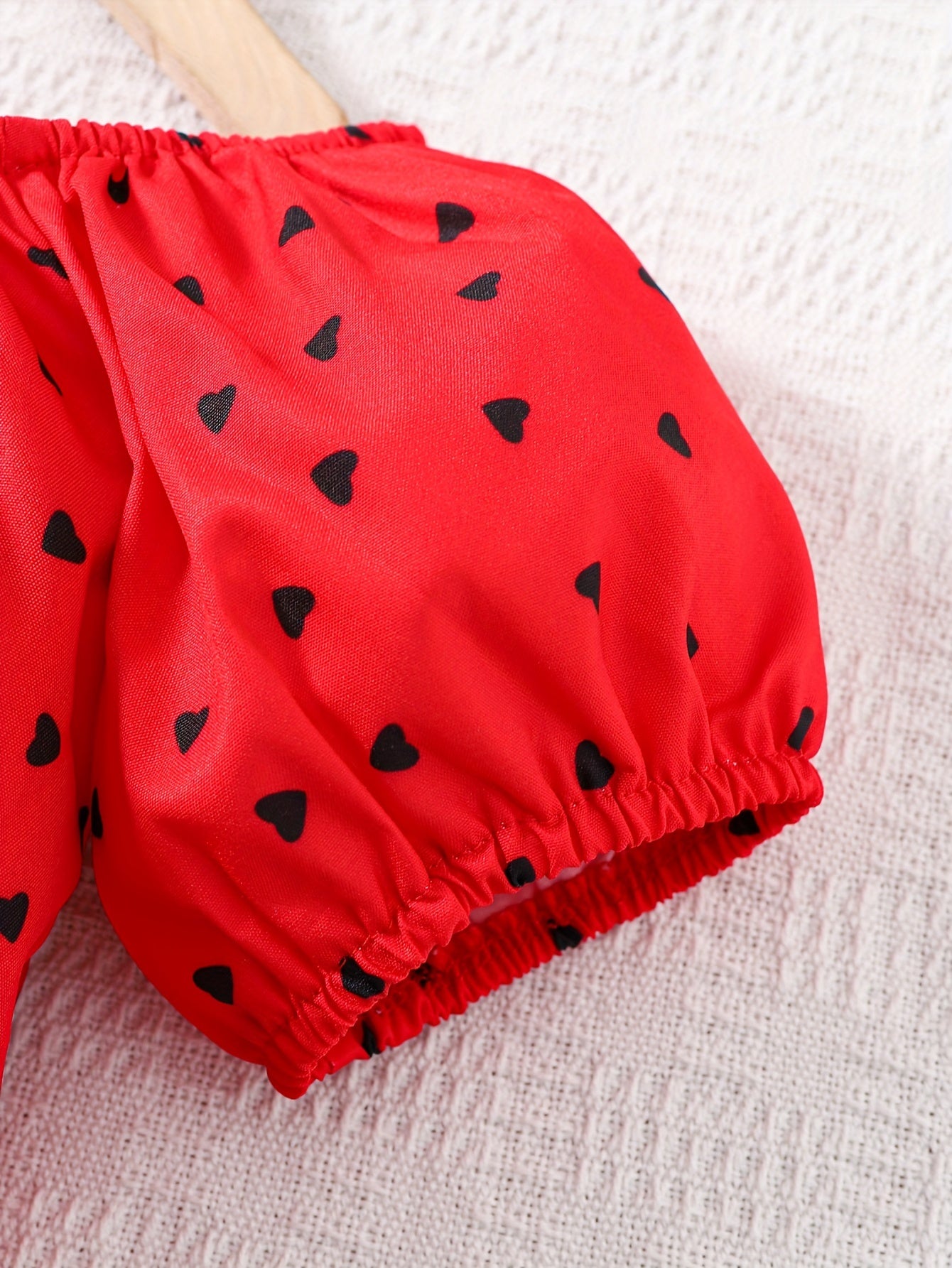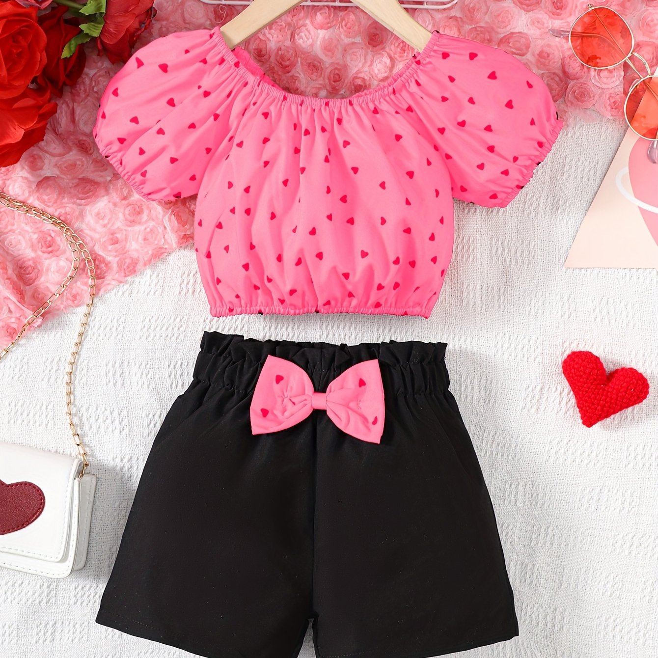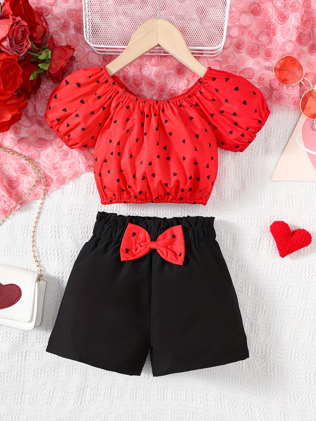 Աղջիկների 2 հատ հանդերձանքի հավաքածու, էլեգանտ կարճաթև վերնաշապիկ՝ սրտի ձևանմուշով և աղեղով, սովորական սև շորտեր, պոլիեսթեր 100%, ոչ ձգվող, հյուսված, գարուն/ամառ/աշուն, 4-7 տարեկան, բացօթյա համար