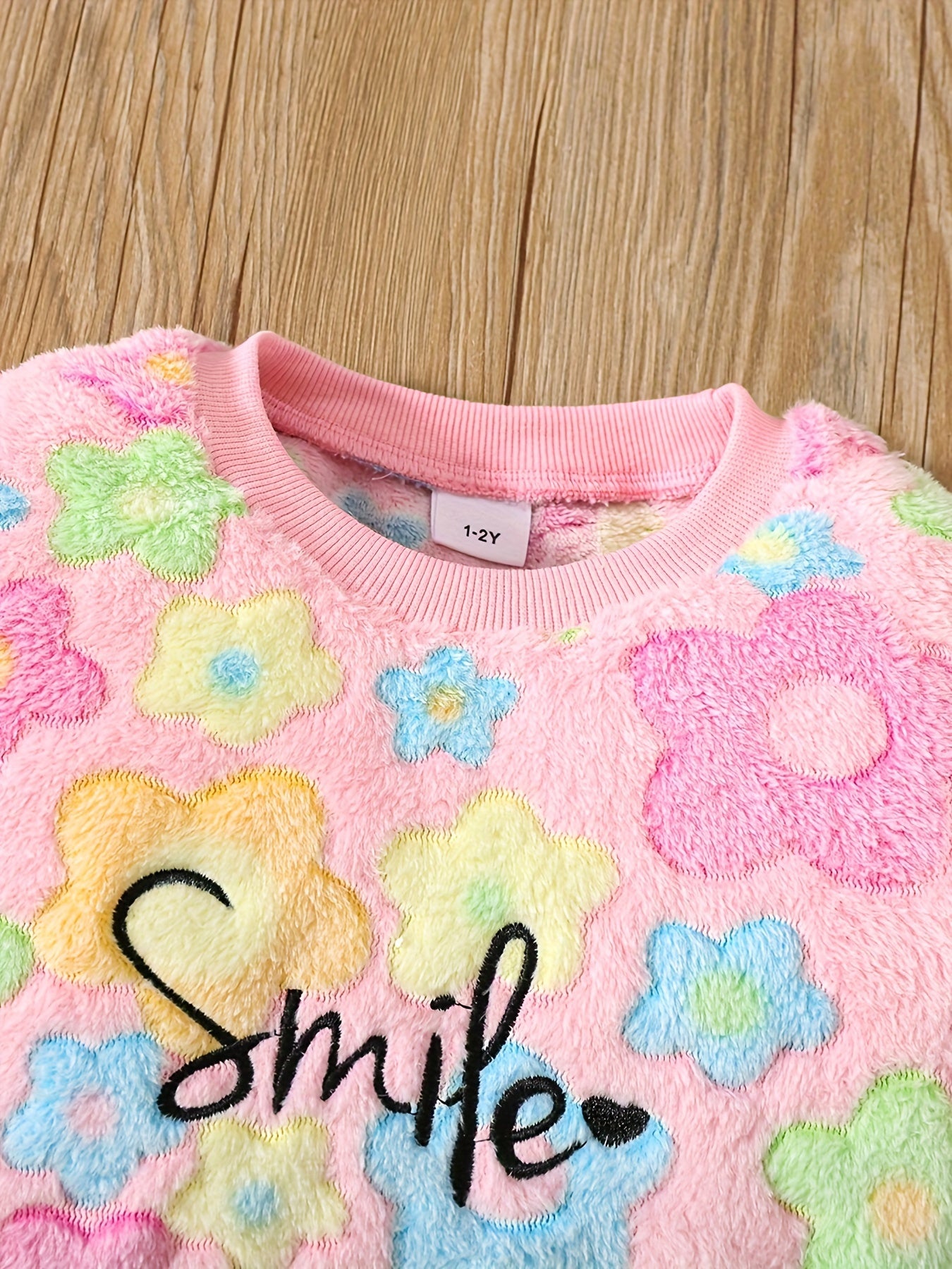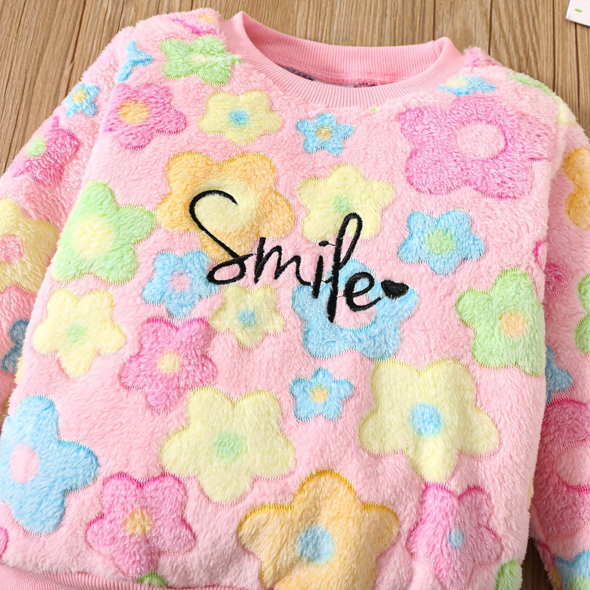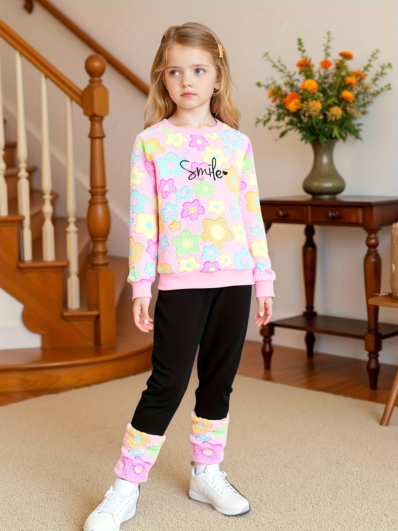 Աղջիկների աշնանային և ձմեռային նորաձև տաք հավաքածու «Ժպիտ» ասեղնագործությամբ, գունագեղ ծաղկային ապլիկացիայով բրդյա բաճկոնով և լայնածավալ տաբատով, իդեալական է բացօթյա օգտագործման համար