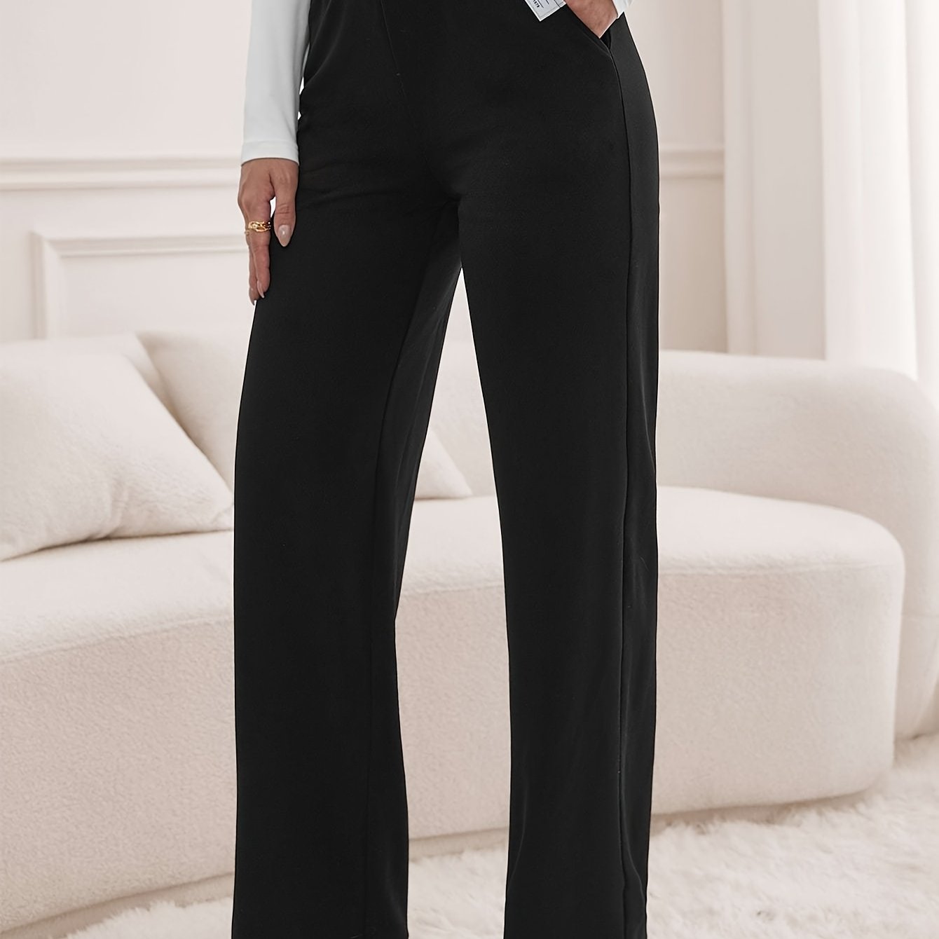 Բարձր գոտկատեղով սև ուղիղ շալվար տառերով և գրպաններով, պոլիեսթեր տրիկոտաժե գործվածք, հարմարավետ ամենօրյա հագուստ կանանց համար