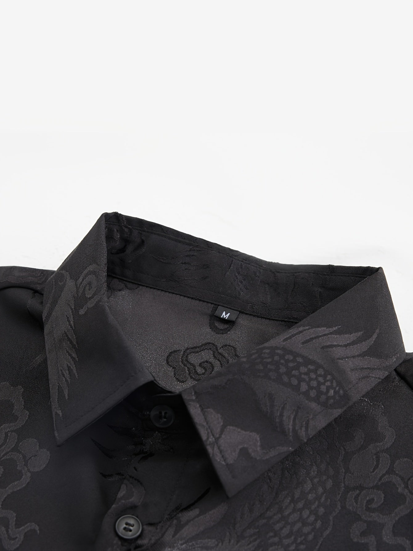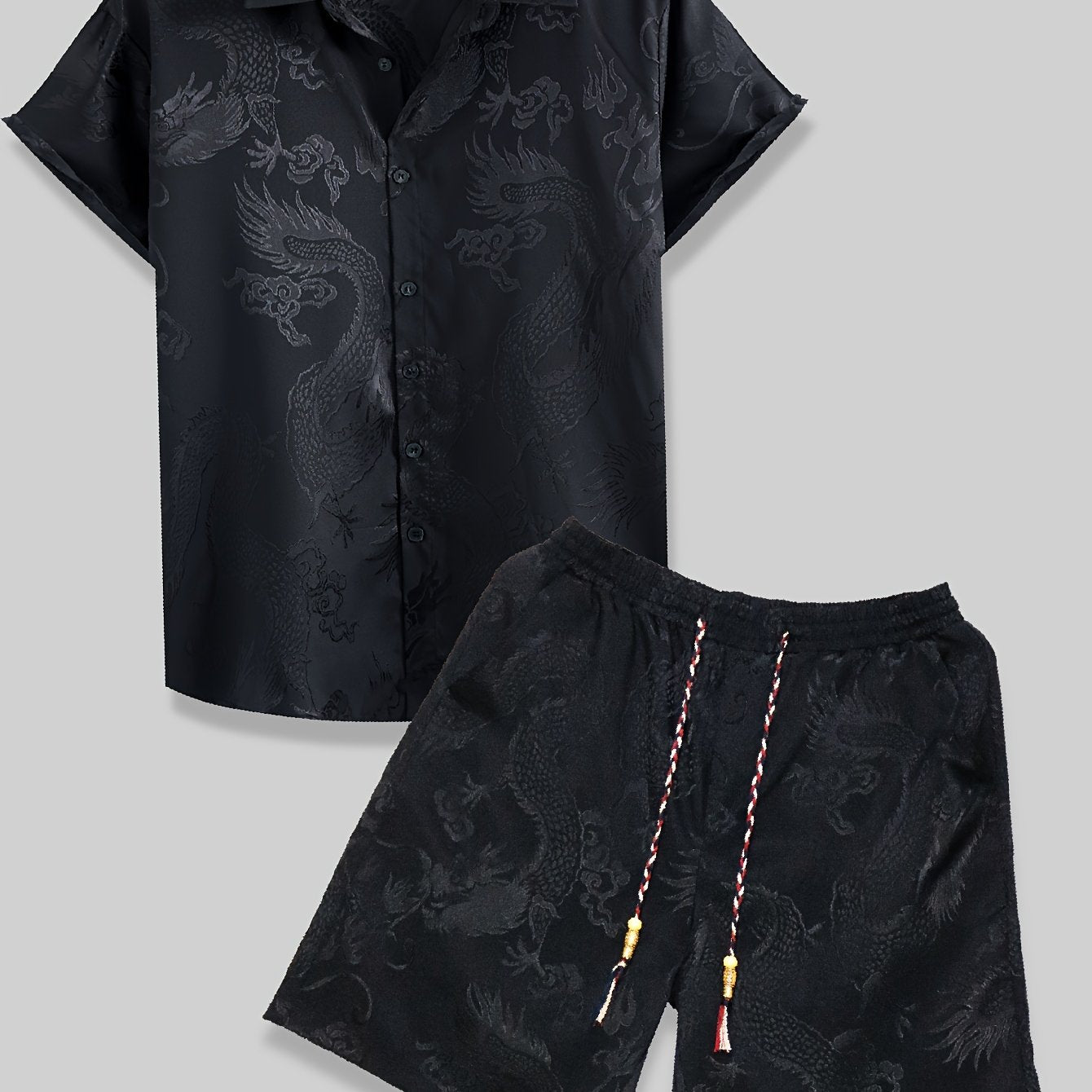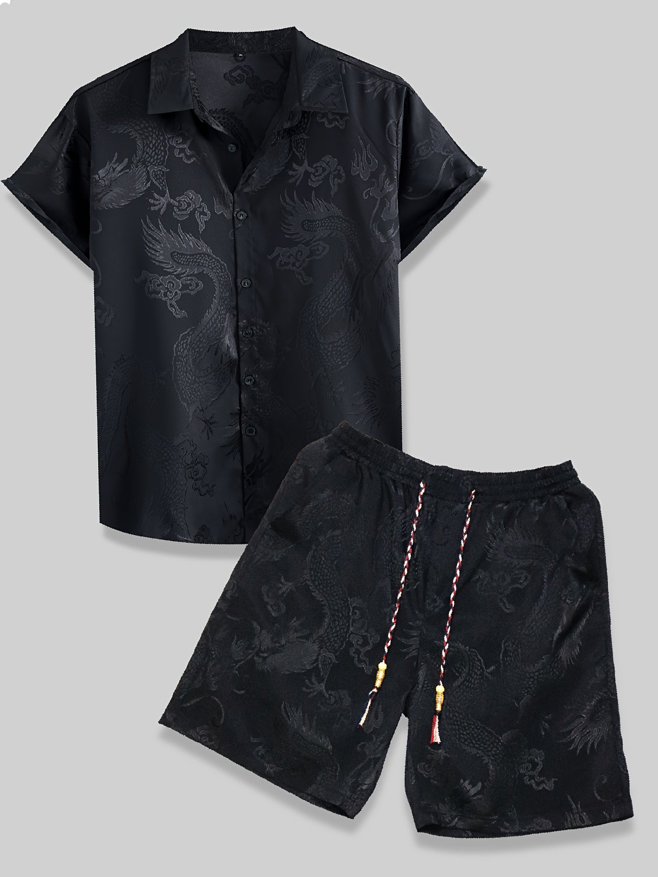 HZCX FASHION Men'S Vintage Summer Beachwear Set - Casual Button-Up Shirt & Drawstring Shorts with Traditional Dragon Design, Non-Stretch Fabric, Regular Fit, Perfect for Casual Attire, Summer Apparel | Casual Beachwear | Draw