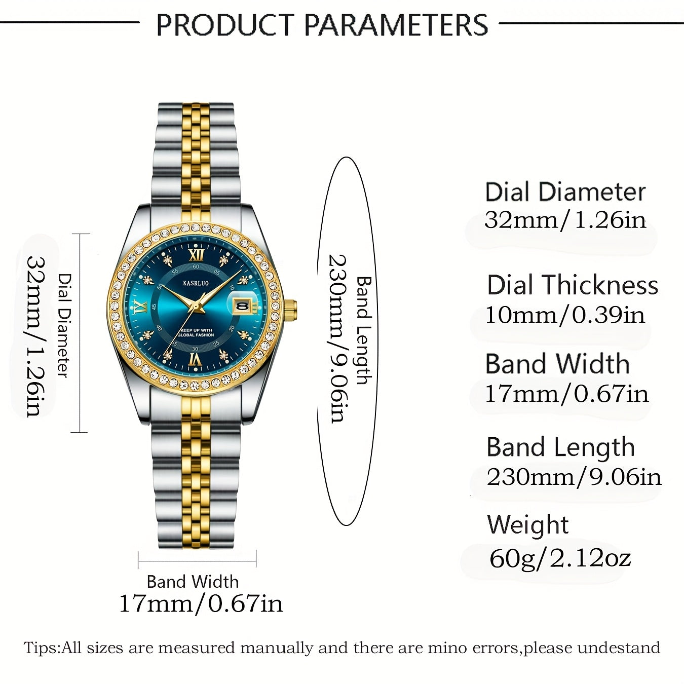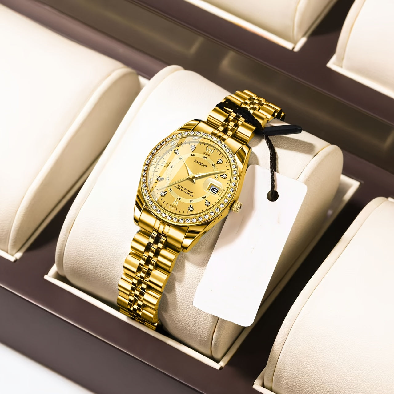 KASRLUO կանացի չժանգոտվող պողպատից քվարցե ժամացույց՝ լուսարձակող քարերով ամսաթվի ցուցիչով, կապույտ ցուցատախտակով և ոսկեգույն ժապավենով - Էլեգանտ գործնական ոճ, առօրյա նրբագեղություն | Էլեգանտ ժամացույց | Լուսարձակող ցուցատախտակ