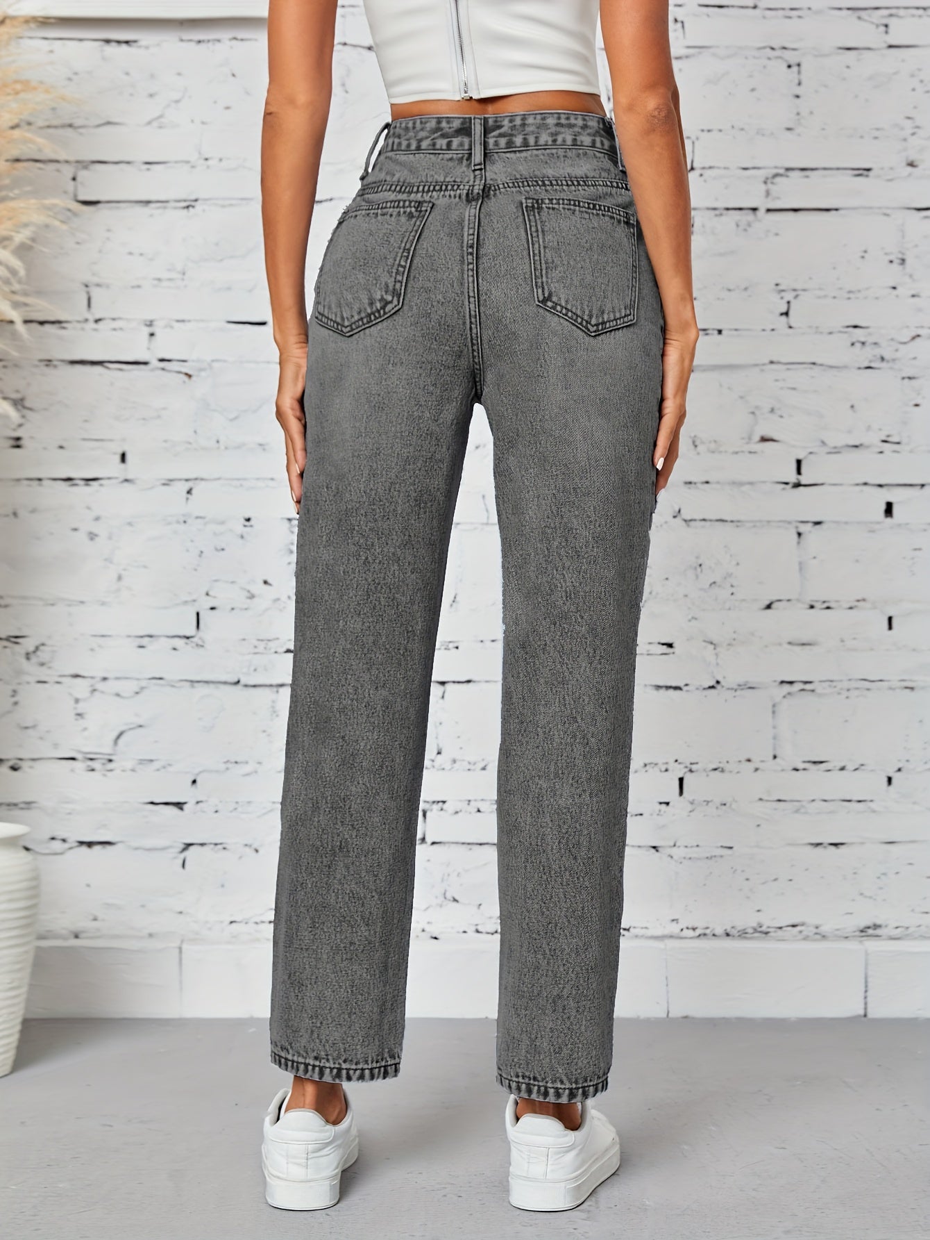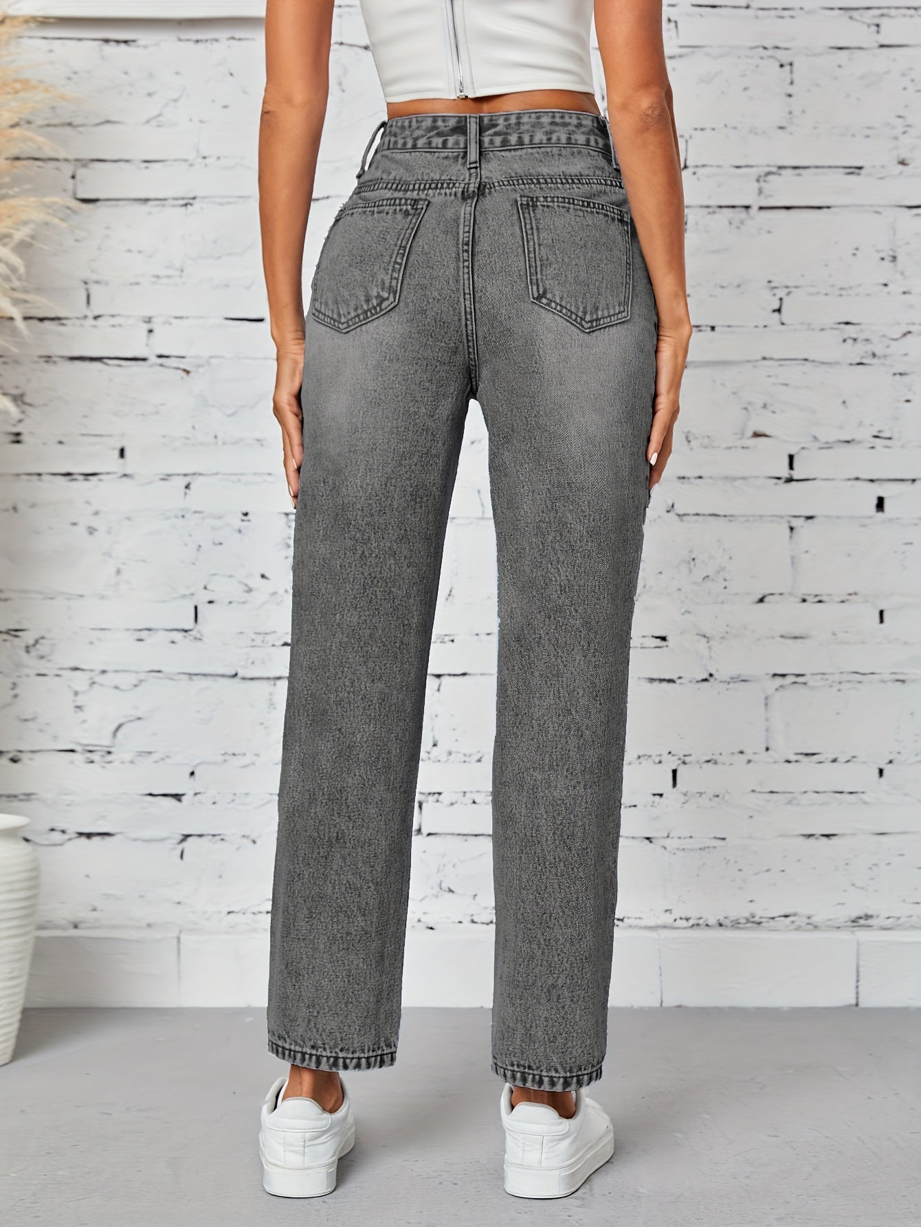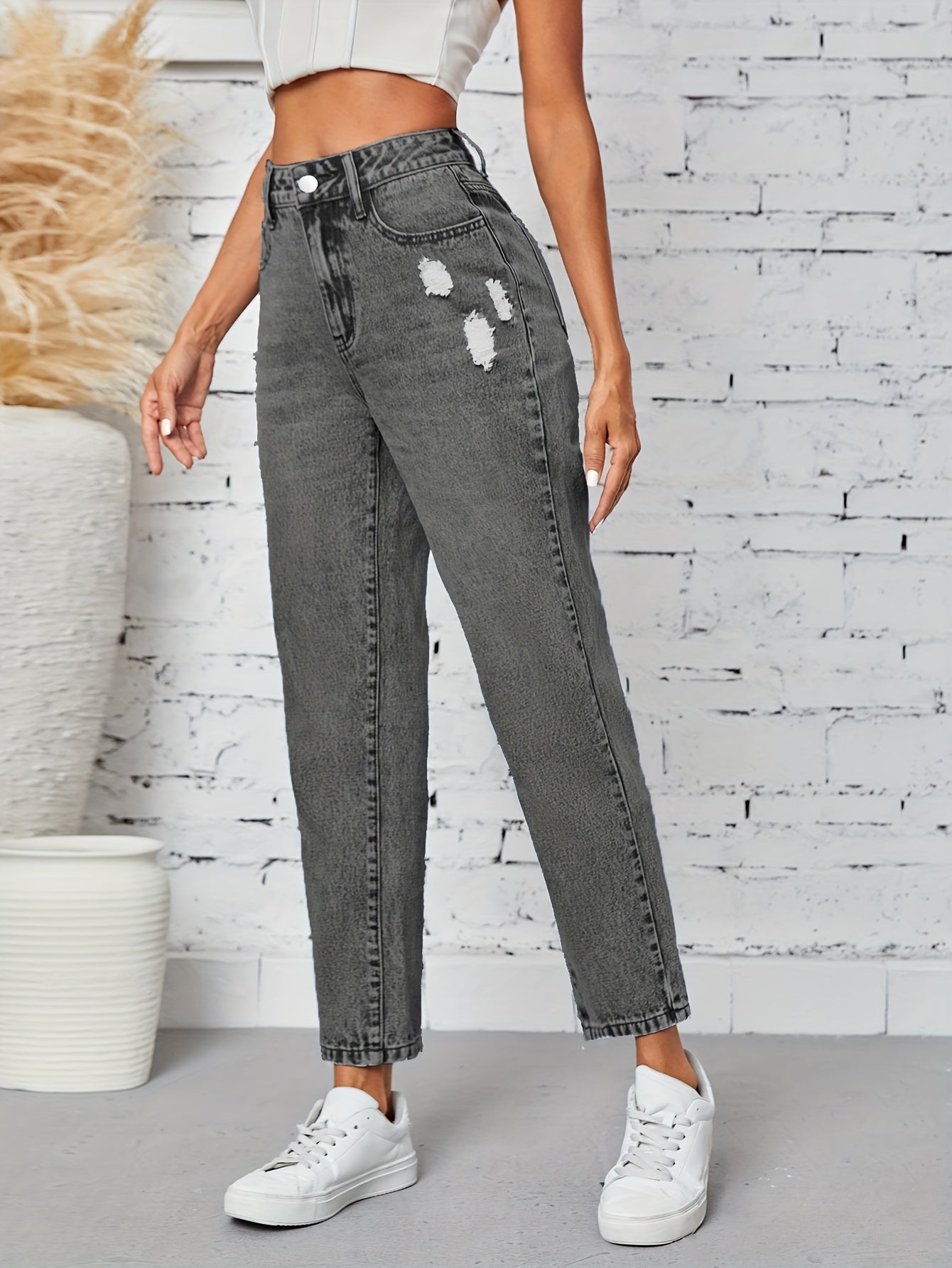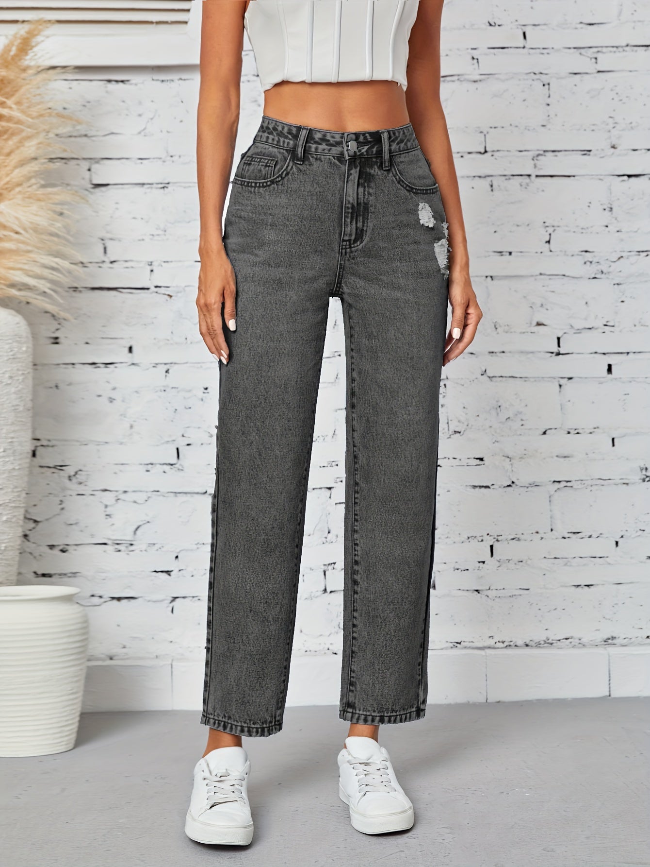 Kiki Angel կանացի նեղացած ուղիղ ջինսեր՝ բարձր գոտկատեղով պատռված ջինսե տաբատ, ձգվող հարդարում, կտրատած գրպաններ, պատահական ոճ, լվացվող մեքենայում, մոխրագույն-սև ջինսե գործվածք