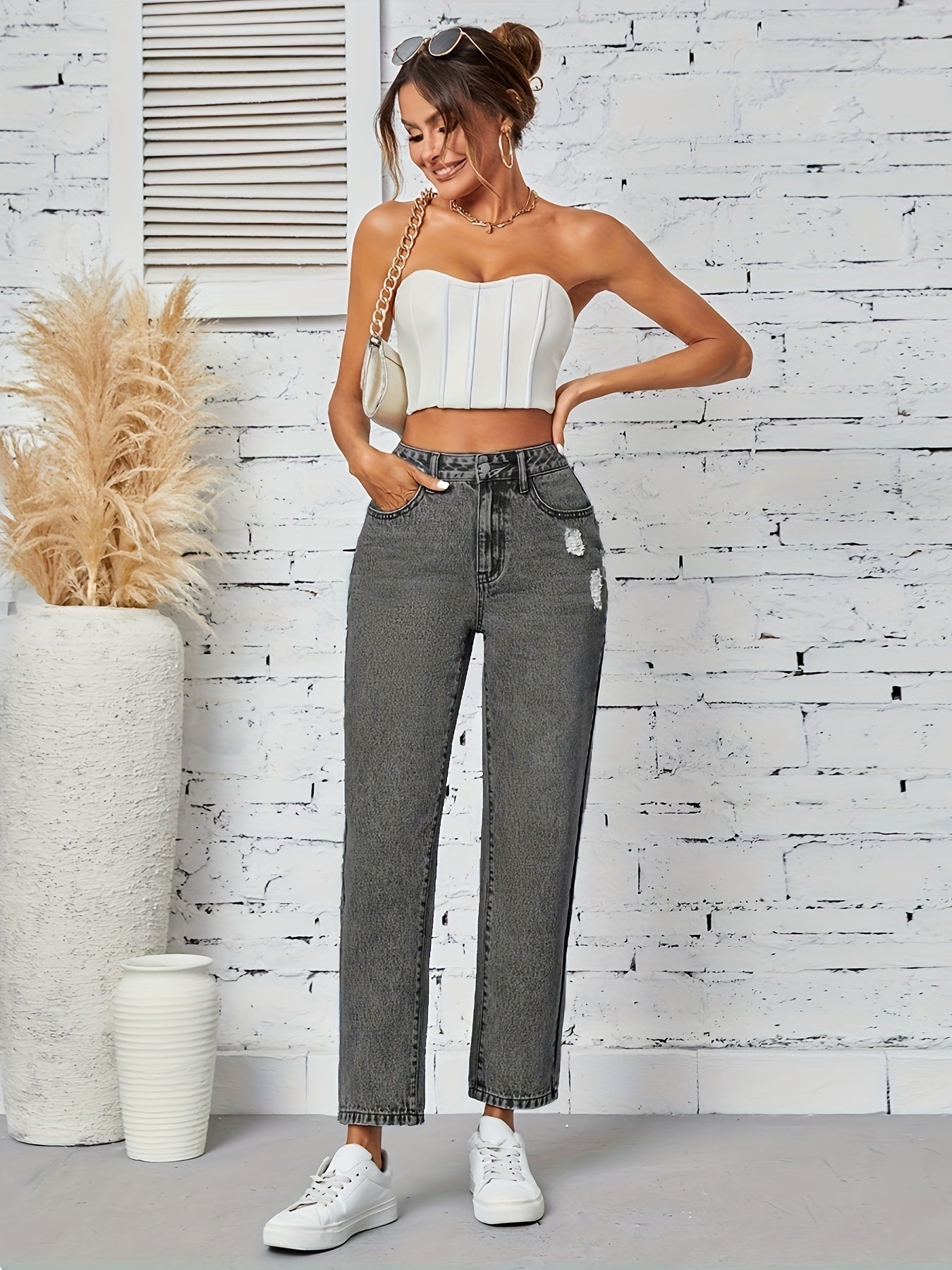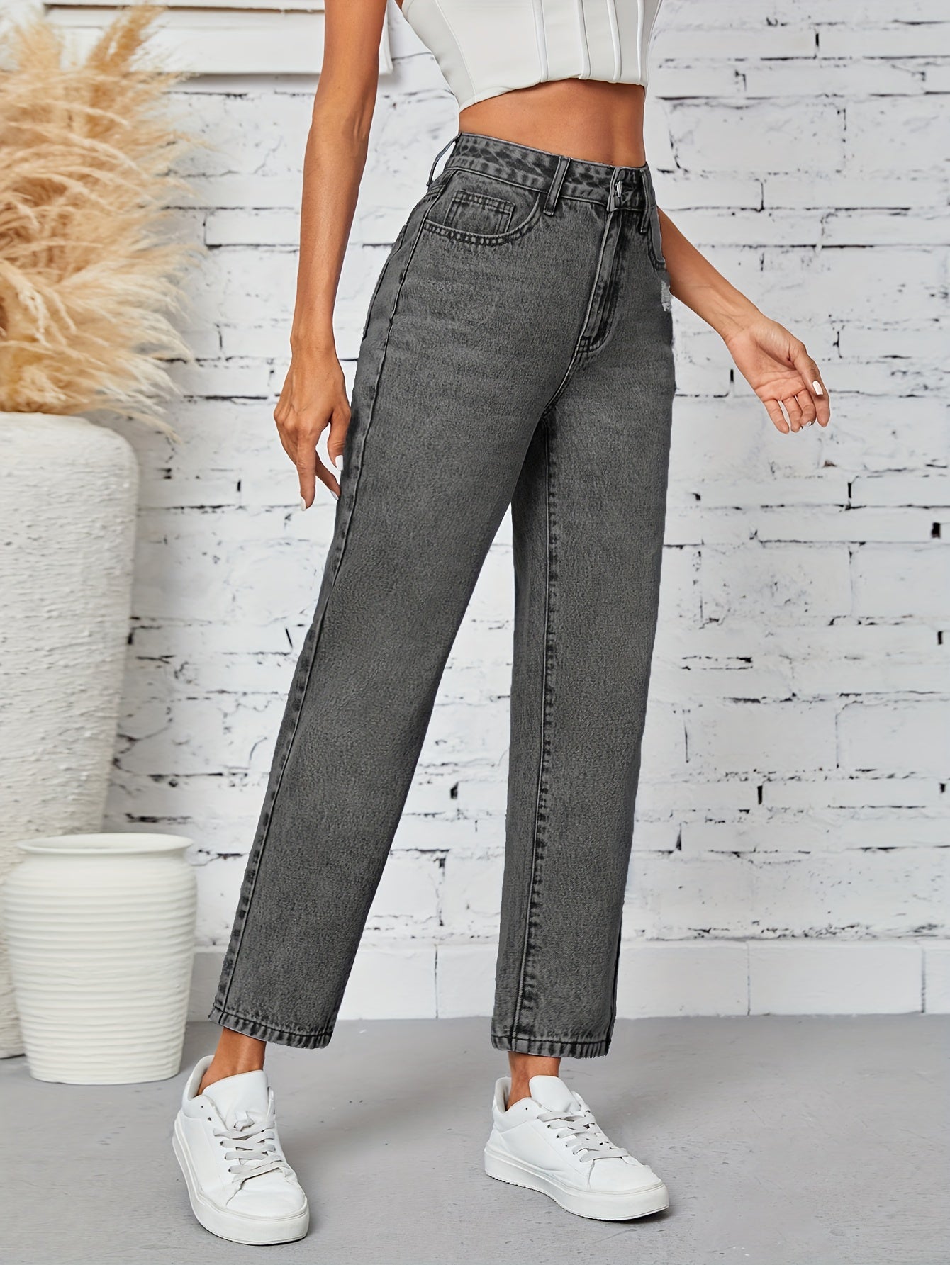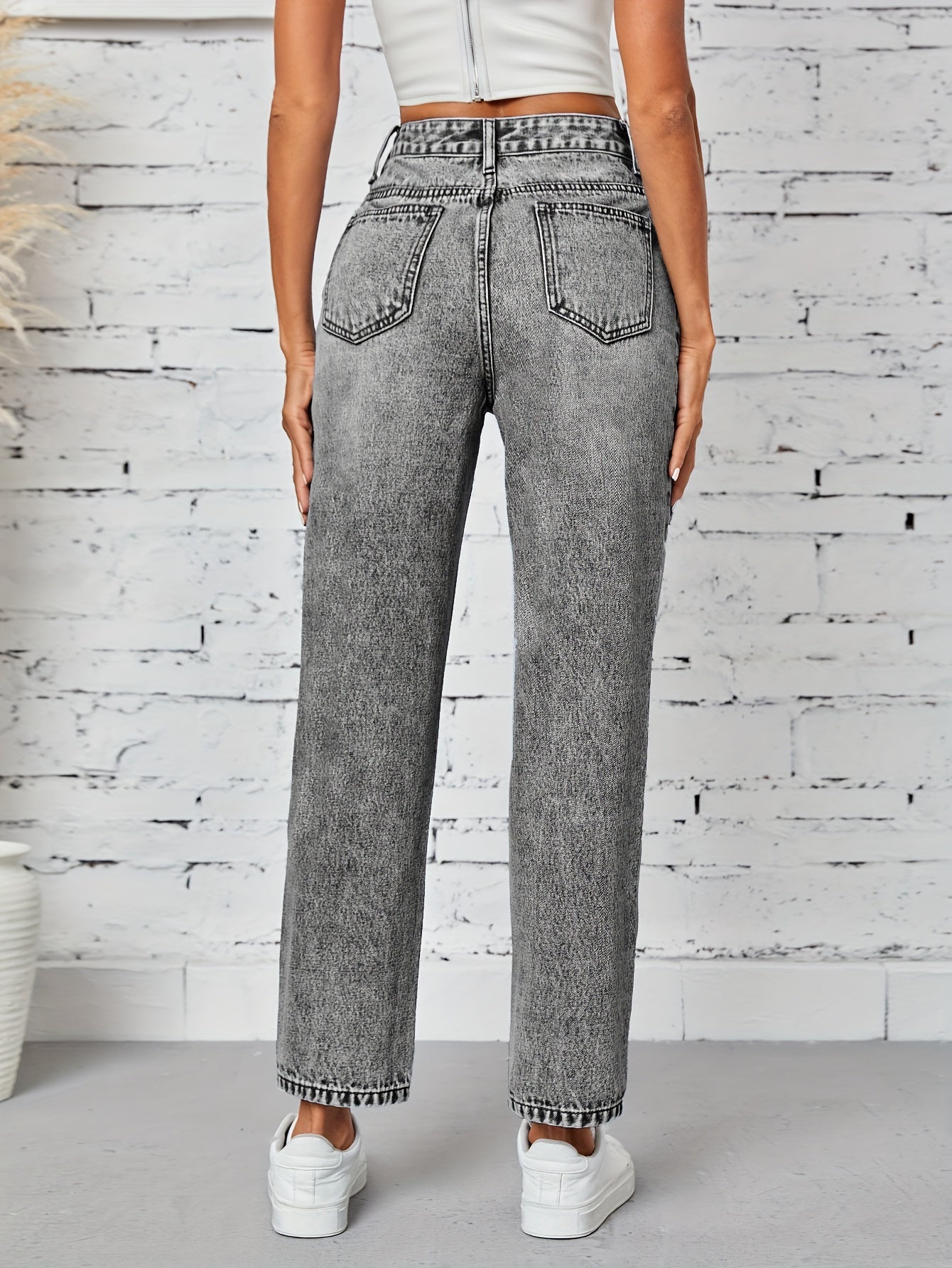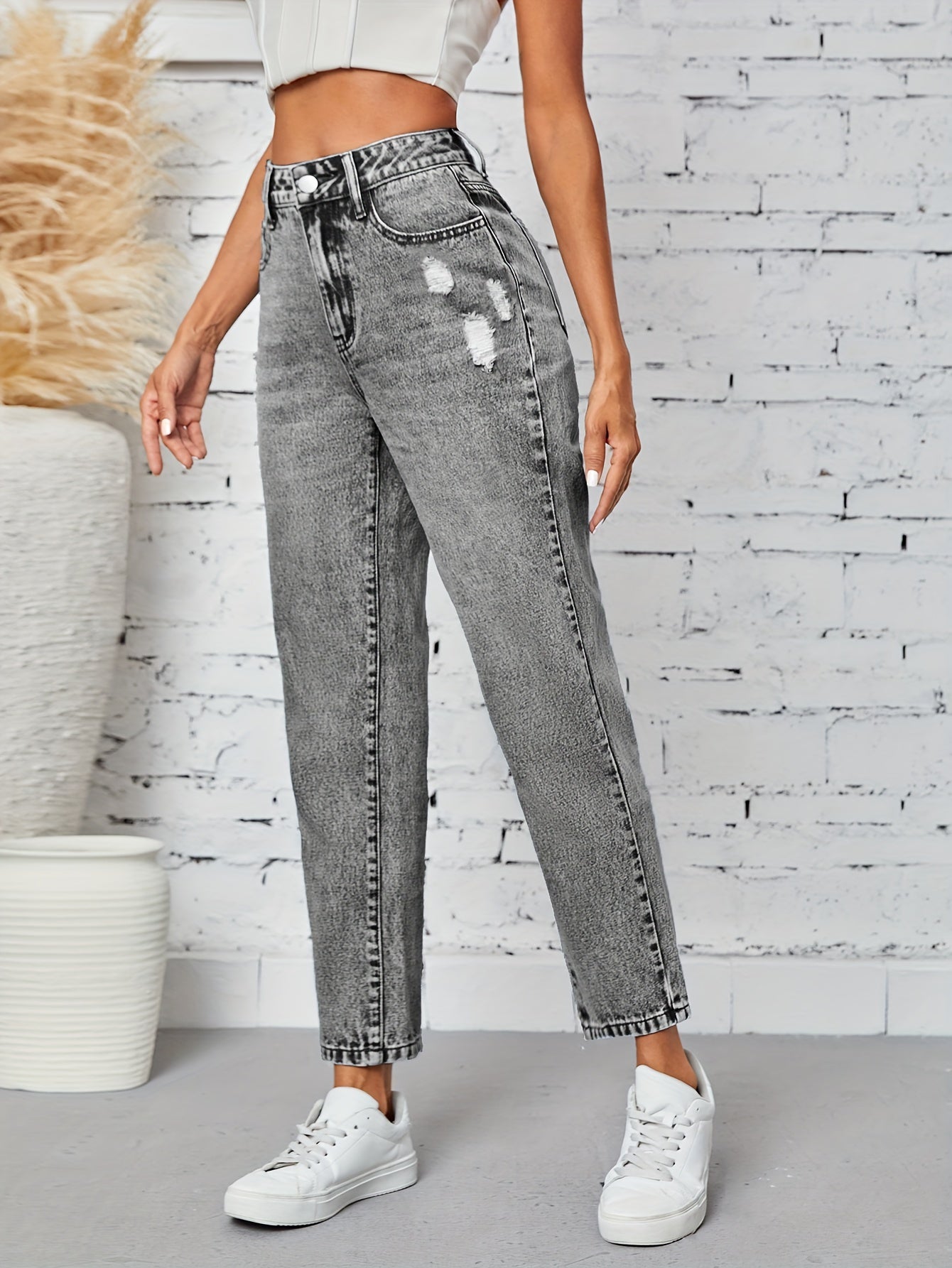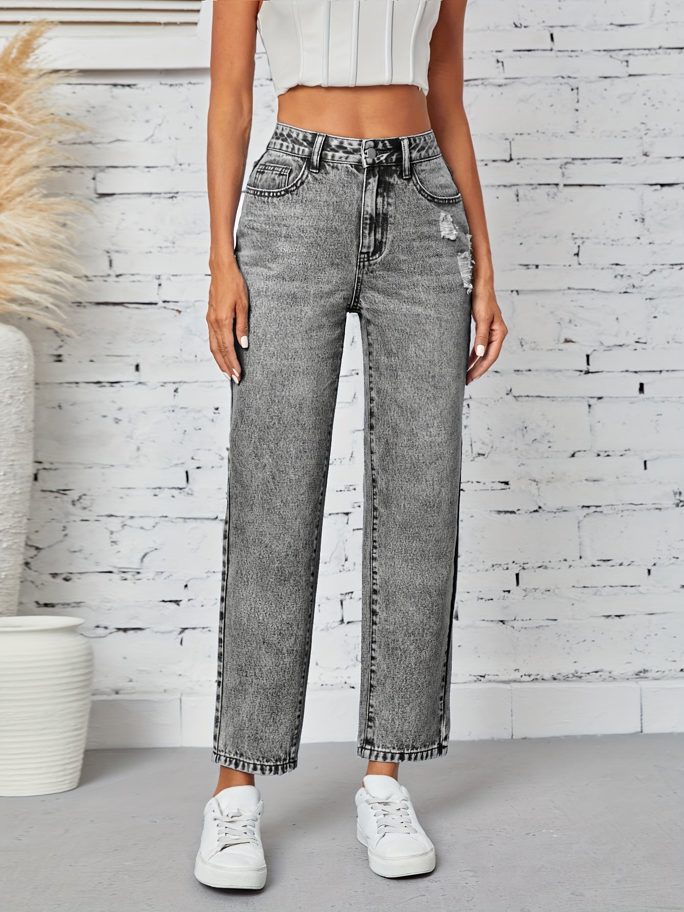 Kiki Angel կանացի նեղացած ուղիղ ջինսեր՝ բարձր գոտկատեղով պատռված ջինսե տաբատ, ձգվող հարդարում, կտրատած գրպաններ, պատահական ոճ, լվացվող մեքենայում, մոխրագույն-սև ջինսե գործվածք