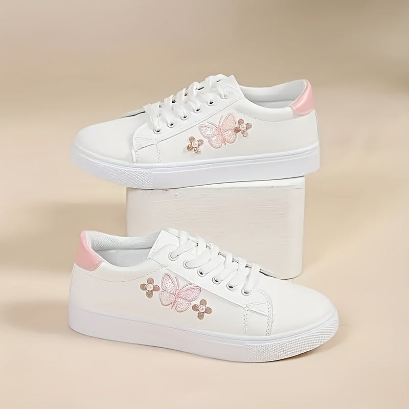 Կանացի Butterfly ամենօրյա սպորտային կոշիկներ, սպիտակ ցածր վերևի ժանյակով, գունավոր թիթեռի ձևանմուշ, կլոր քիթ, սինթետիկ վերին մաս, պլաստմասսայե ներբան, ոչ հյուսված գործվածքից ներդիր և ներքին նյութ, ձեռքի լվացմամբ կամ պրոֆեսիոնալ չոր մաքրմամբ: