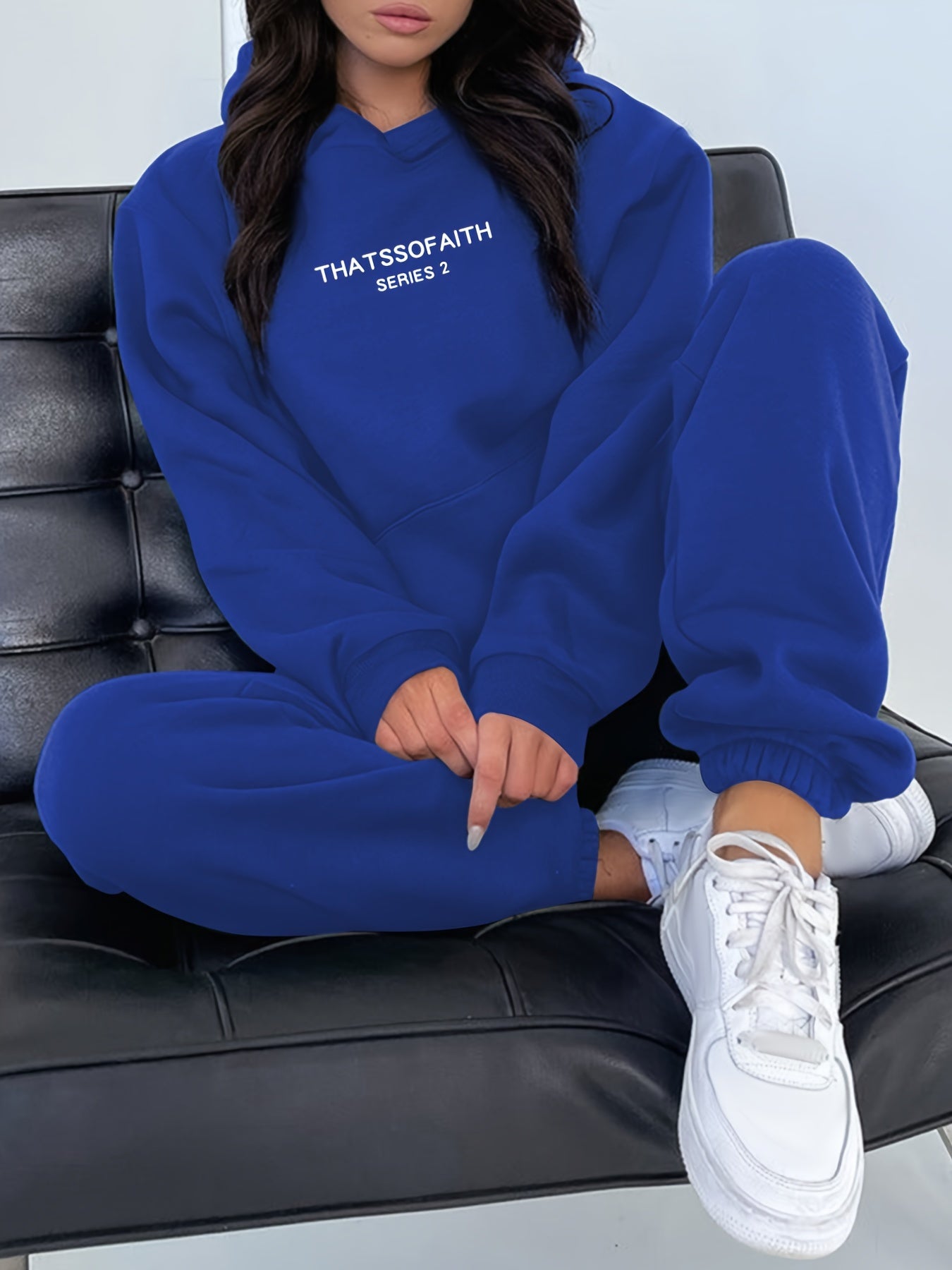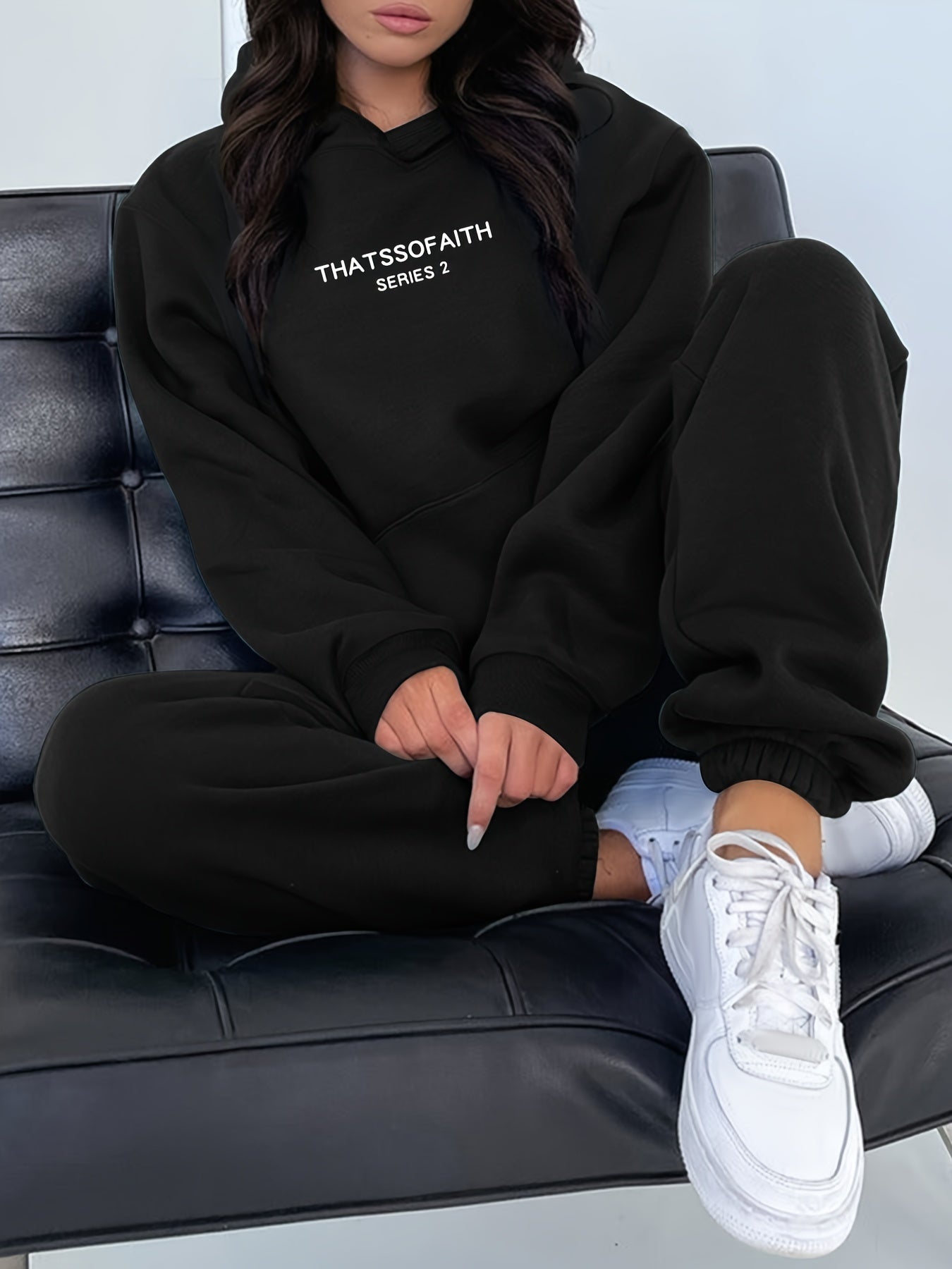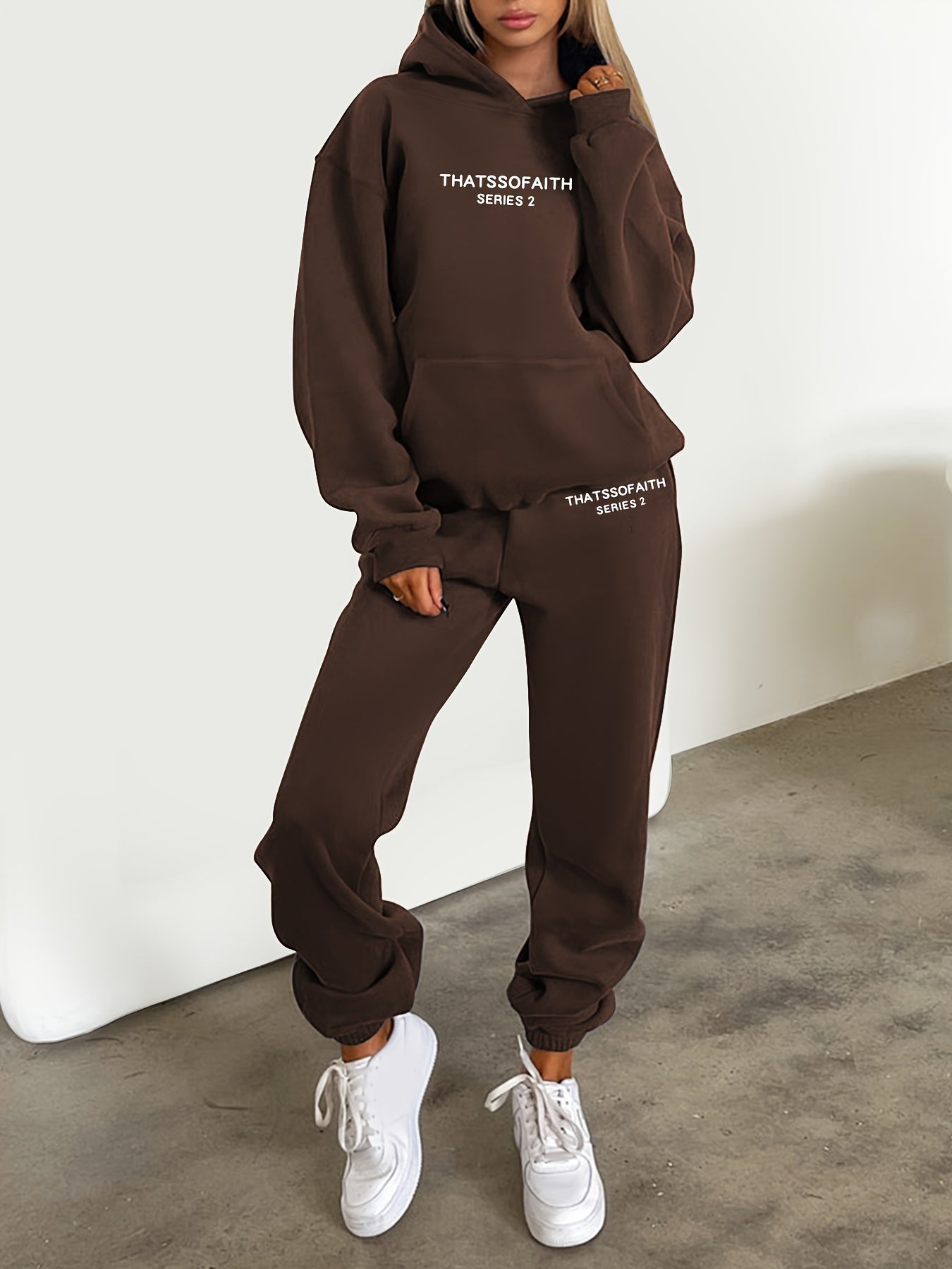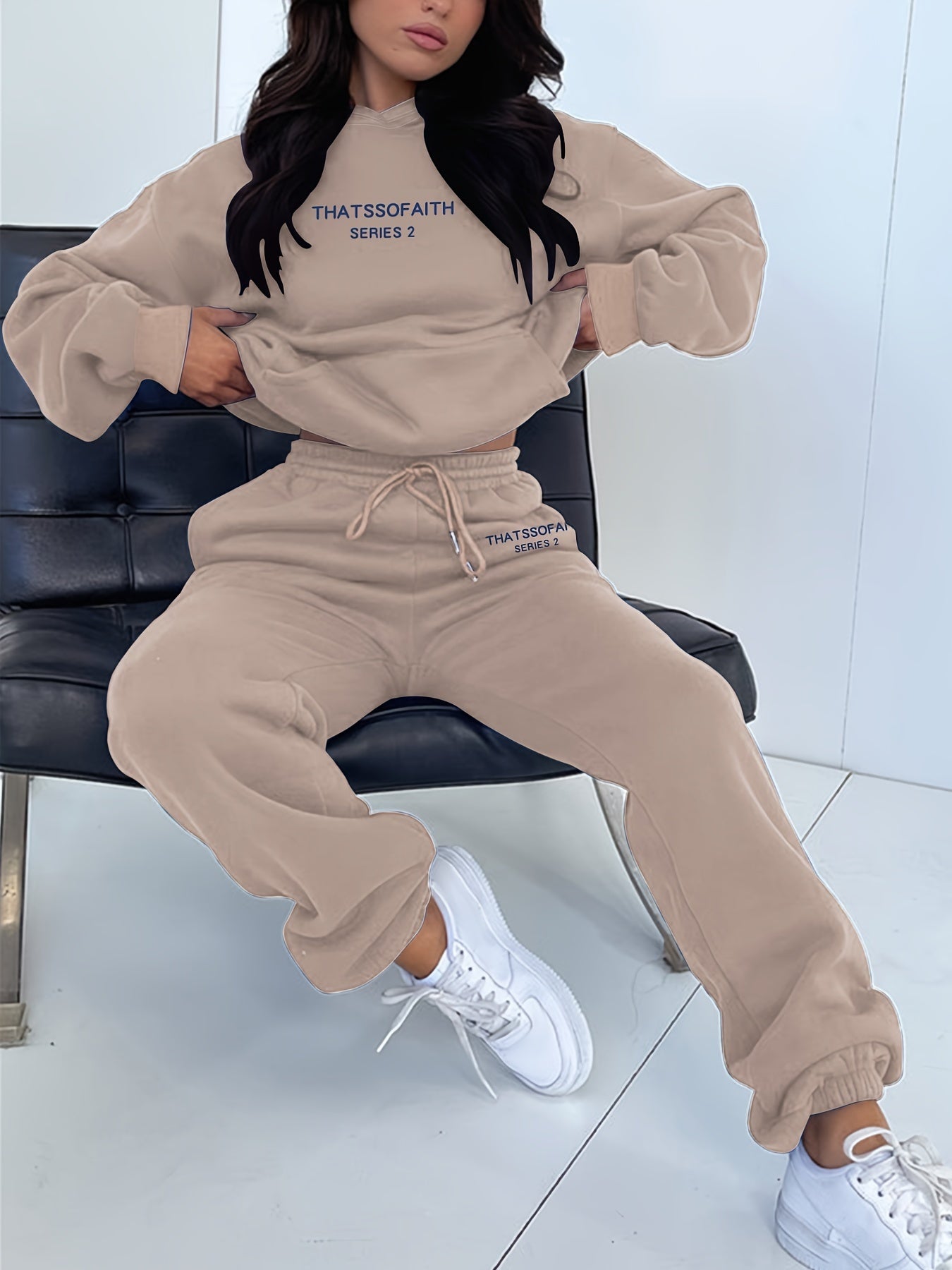 Letter Print Առօրյա երկկտոր հավաքածու, գլխարկով վերնաշապիկներ և պարաններով Jogger շալվարներ, կանացի հագուստ
