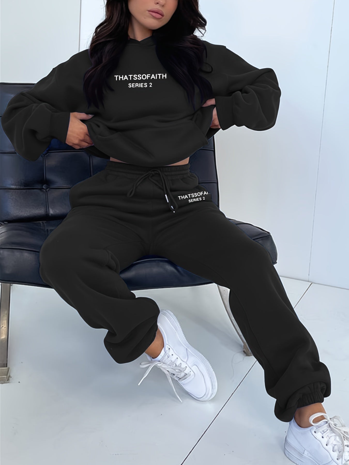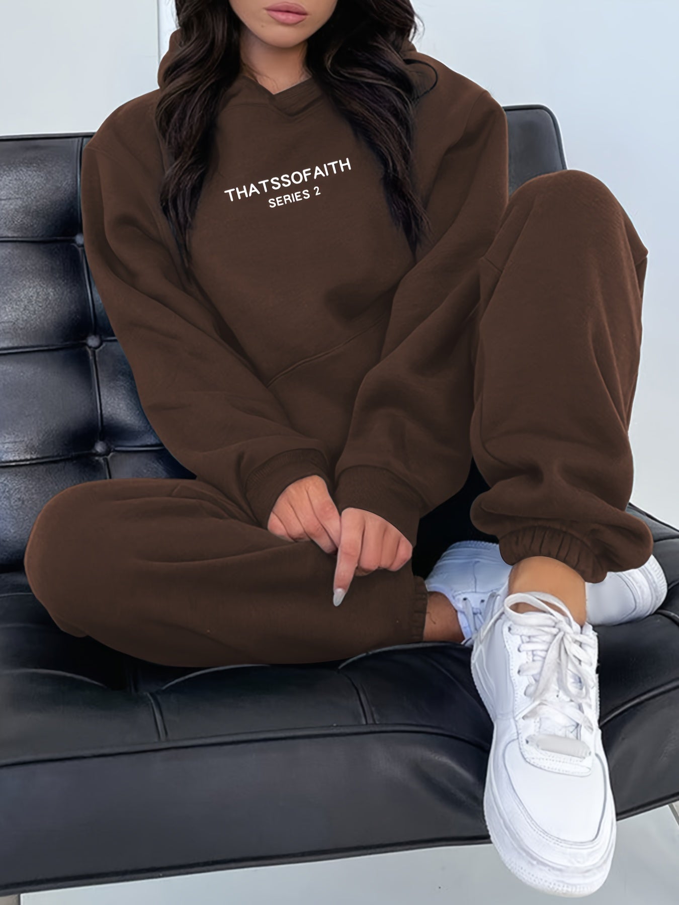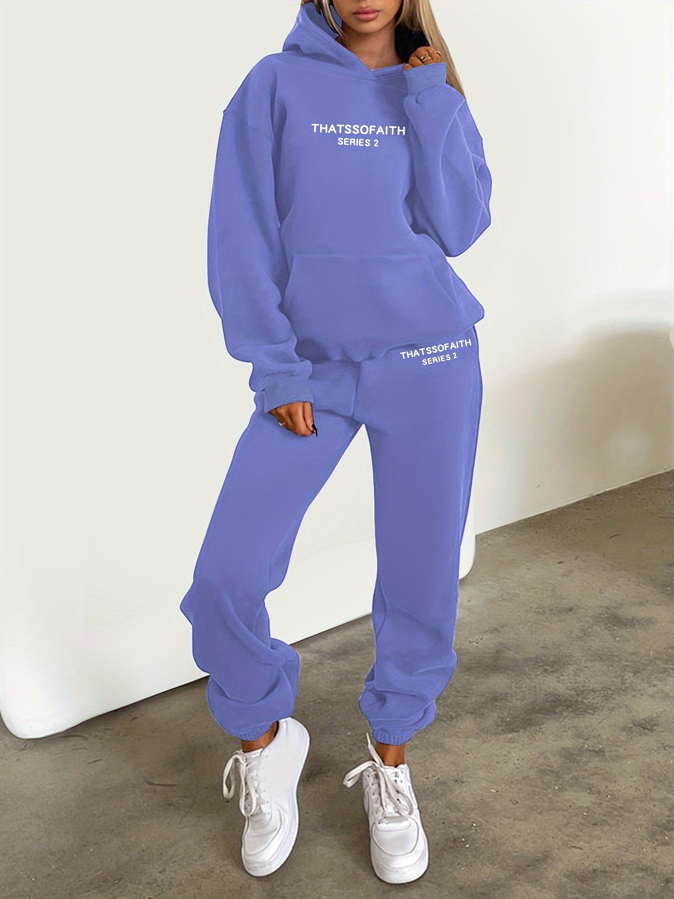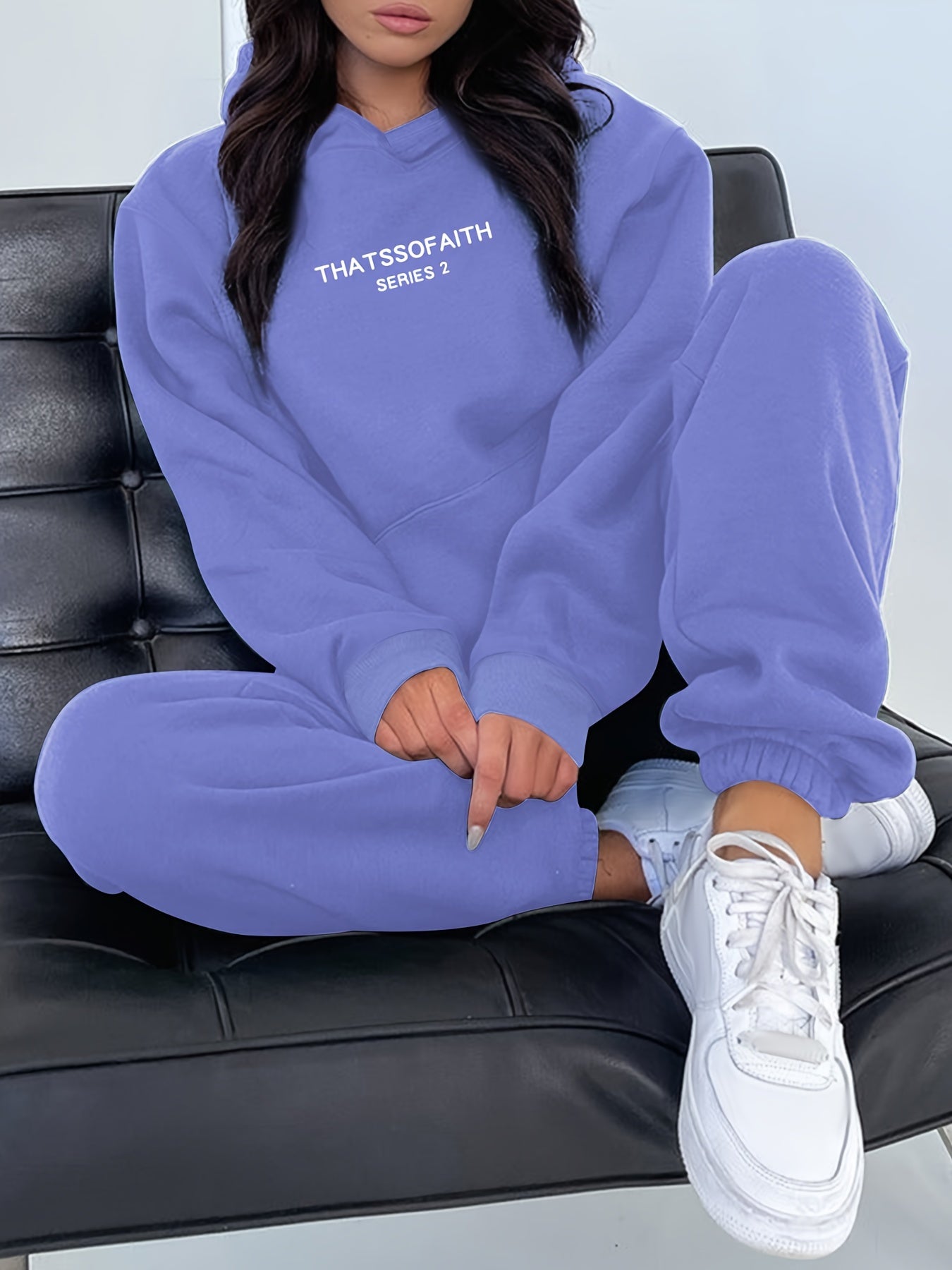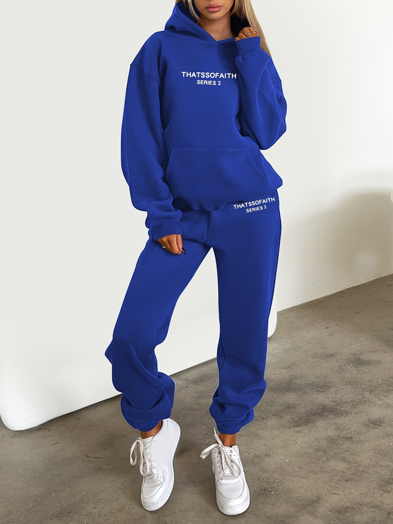 Letter Print Առօրյա երկկտոր հավաքածու, գլխարկով վերնաշապիկներ և պարաններով Jogger շալվարներ, կանացի հագուստ