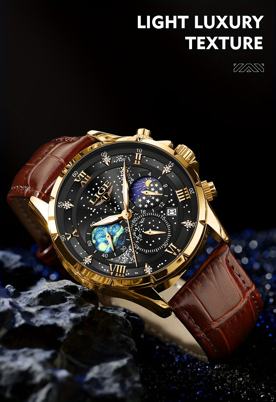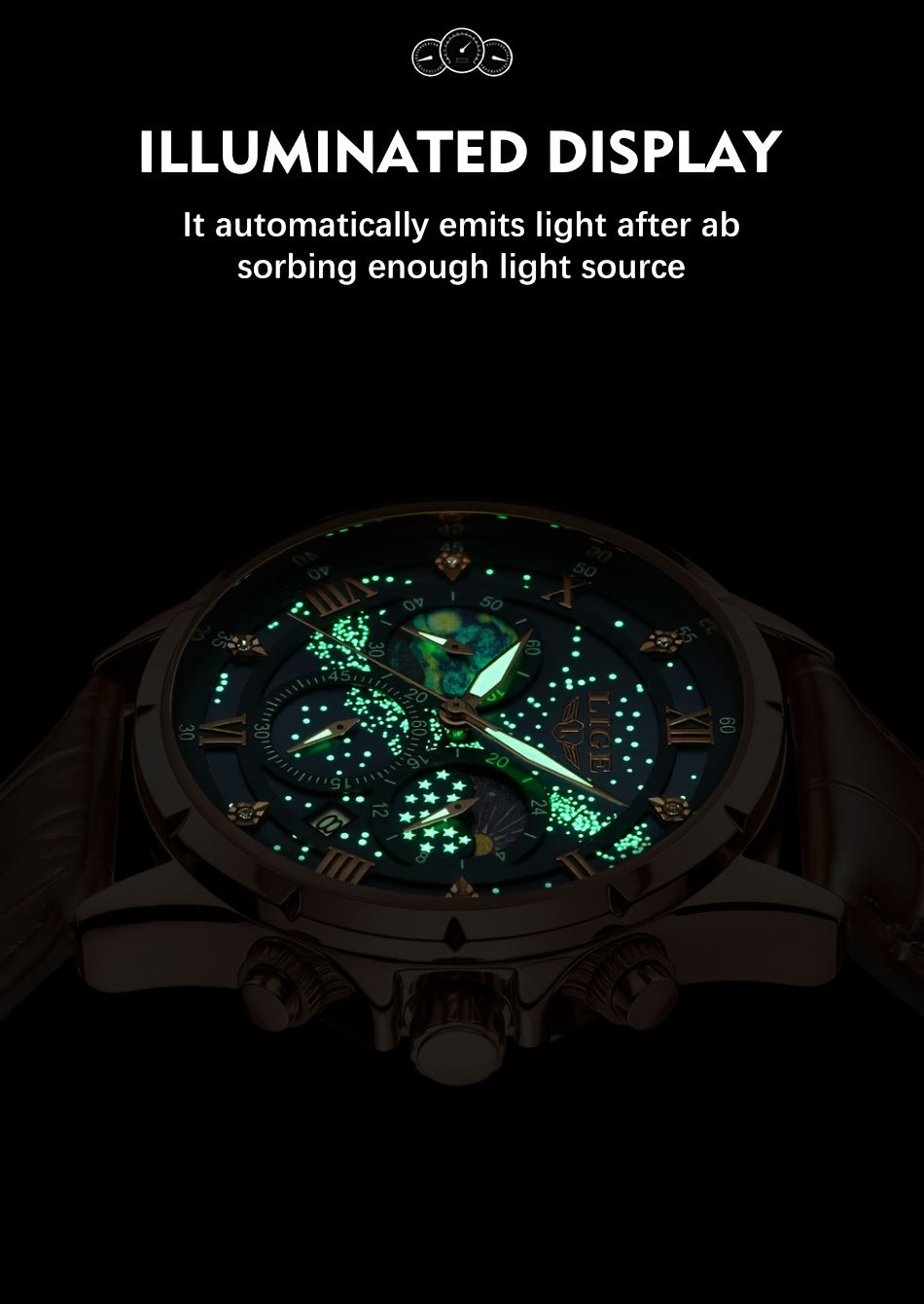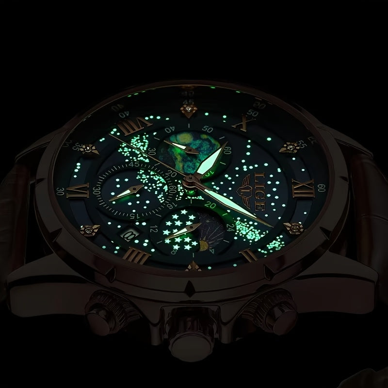LIGE Luxury Quartz Chronograph Watch with Luminous Hands - Elegant Round Alloy Case, Blue Dial with Roman Numerals, Starry Night Design, Button Battery, Faux Leather Strap, Stylish Accessory|Starry Night Design|Luminous Hands