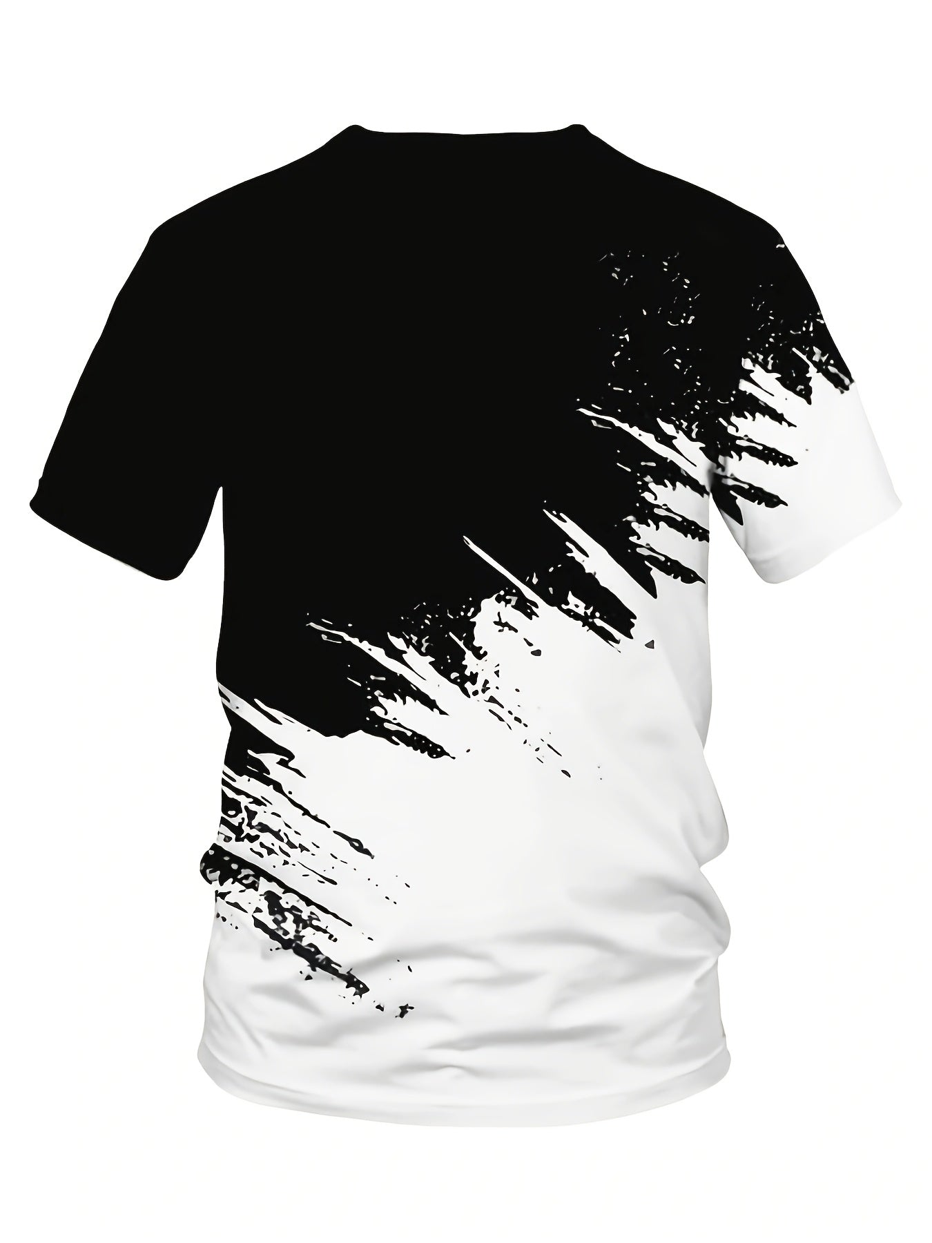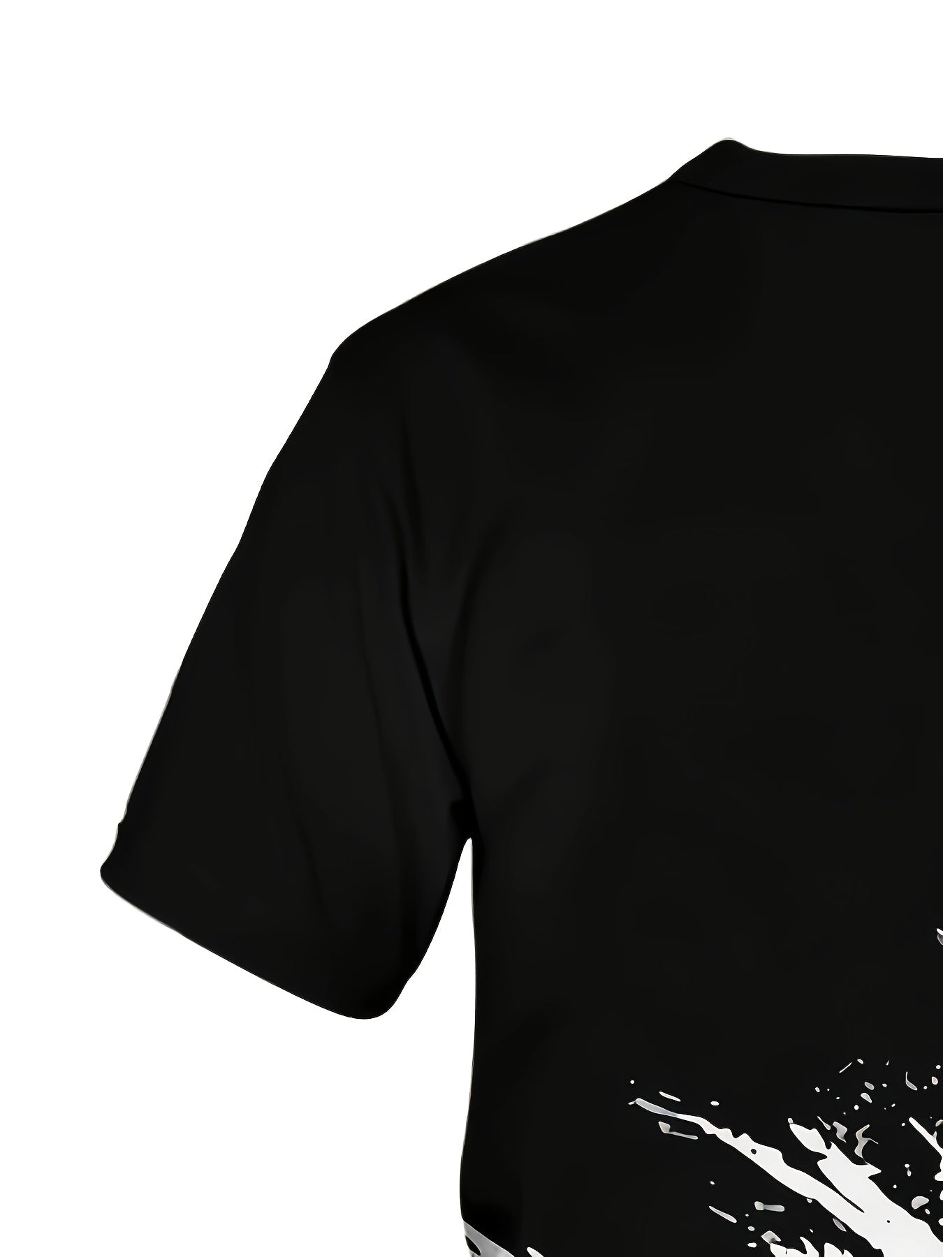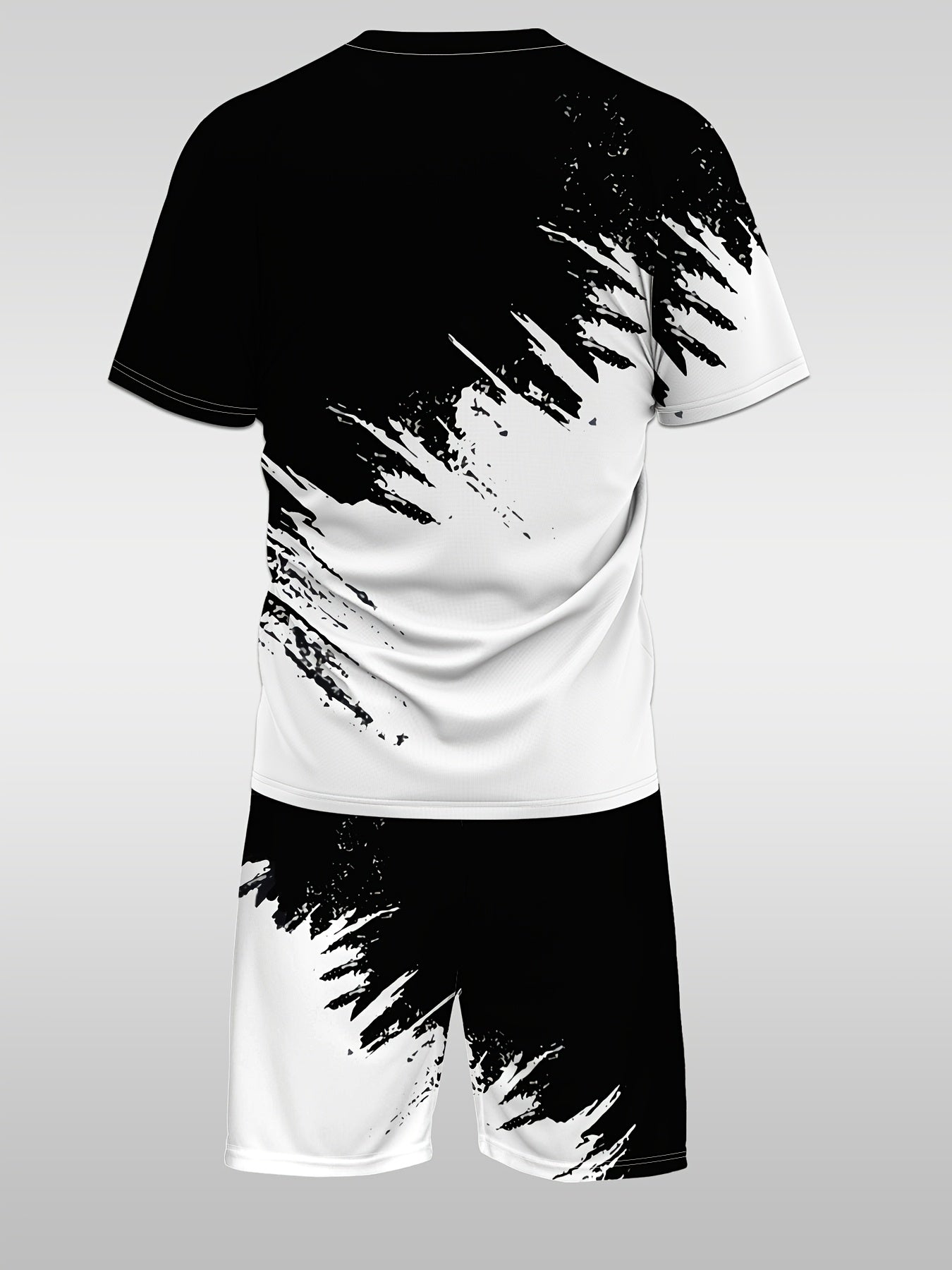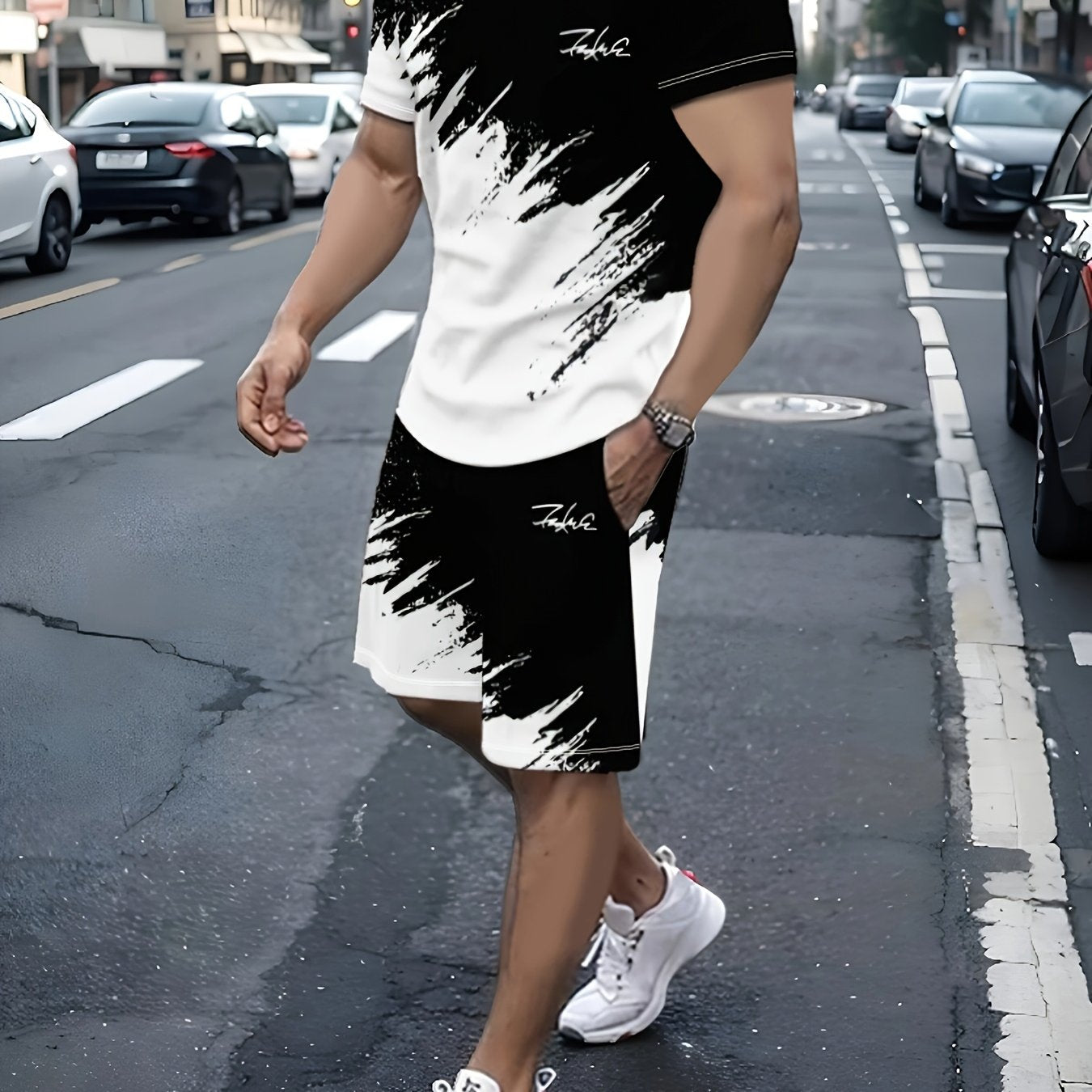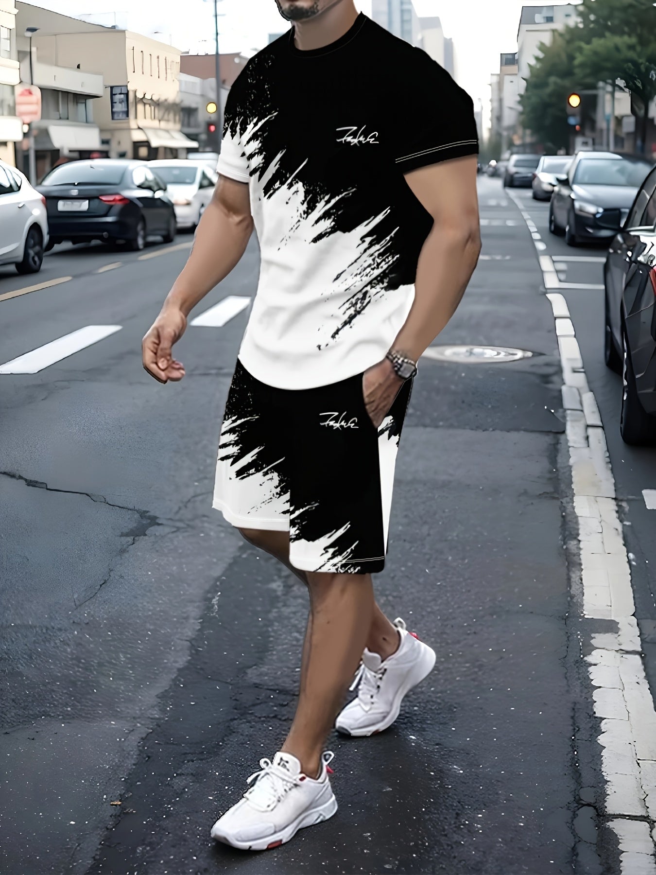 Թեթև, տղամարդու 2 հատ ամառային պատահական հանդերձանք. սև և սպիտակ տառերով կարճաթև շապիկ և պարանով սպորտային շորտեր - պոլիեսթեր խառնուրդ, լվացվող մեքենայում