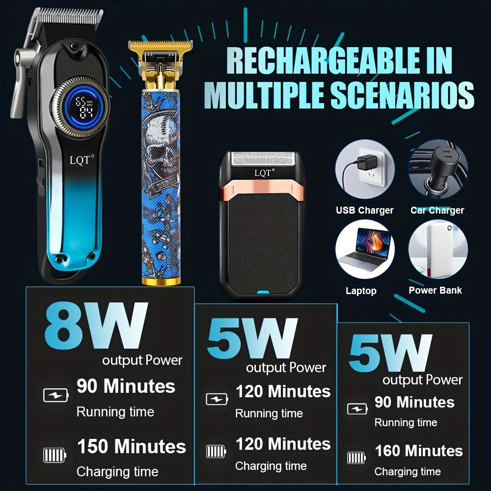 LQT 1/2/3 հատ պրոֆեսիոնալ սրահի մազերի կտրիչի հավաքածու, որը ներառում է մազերի կտրիչ, T-աձև կտրիչներ, մորուքի կտրիչներ և էլեկտրական սափրիչներ, ութ սահմանափակող սանրերով, կոմպակտ դիզայն, զրոյական բացվածքով ճշգրիտ կտրվածք, բարբի կարիքները բավարարելու համար