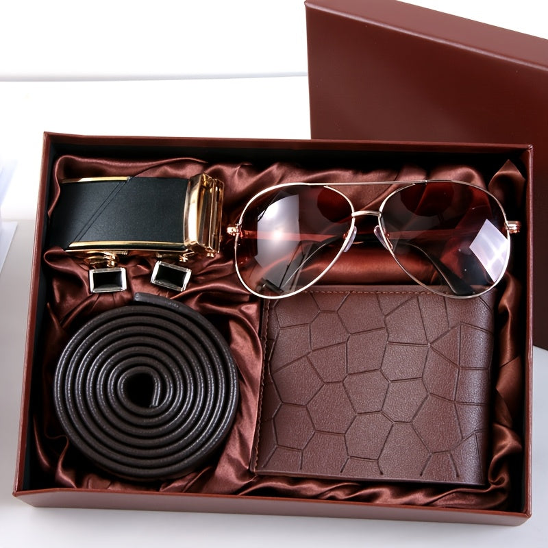 Men's 7pcs Business Gift Box Set: Textured Fashion Glasses, Matte Gunmetal Buckle, Comfortable Belt, Wallet, Fashionable Cufflinks, Elegant Gift Box – Perfect for Father's Day, Teacher's Day, Graduation, Christmas, Valentin