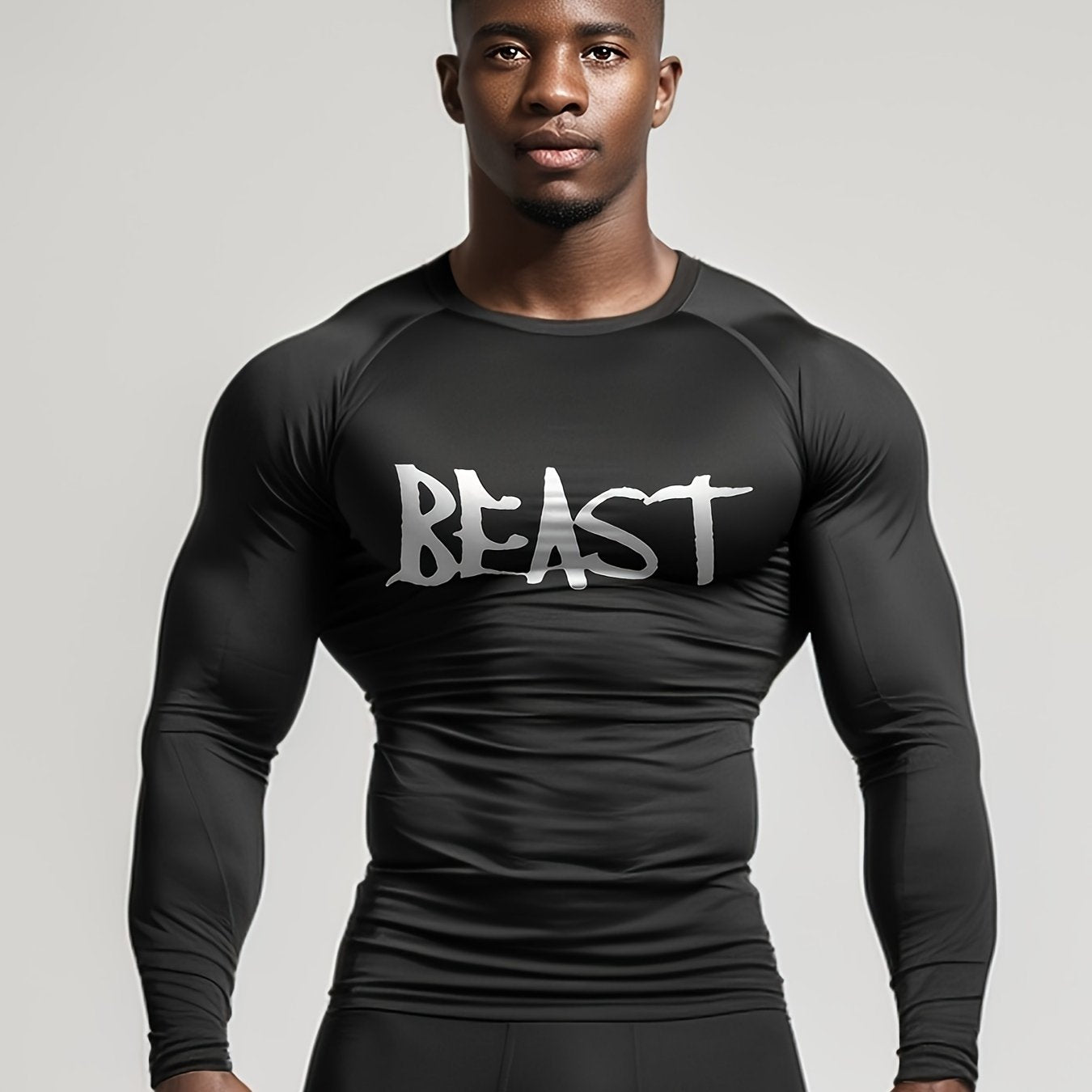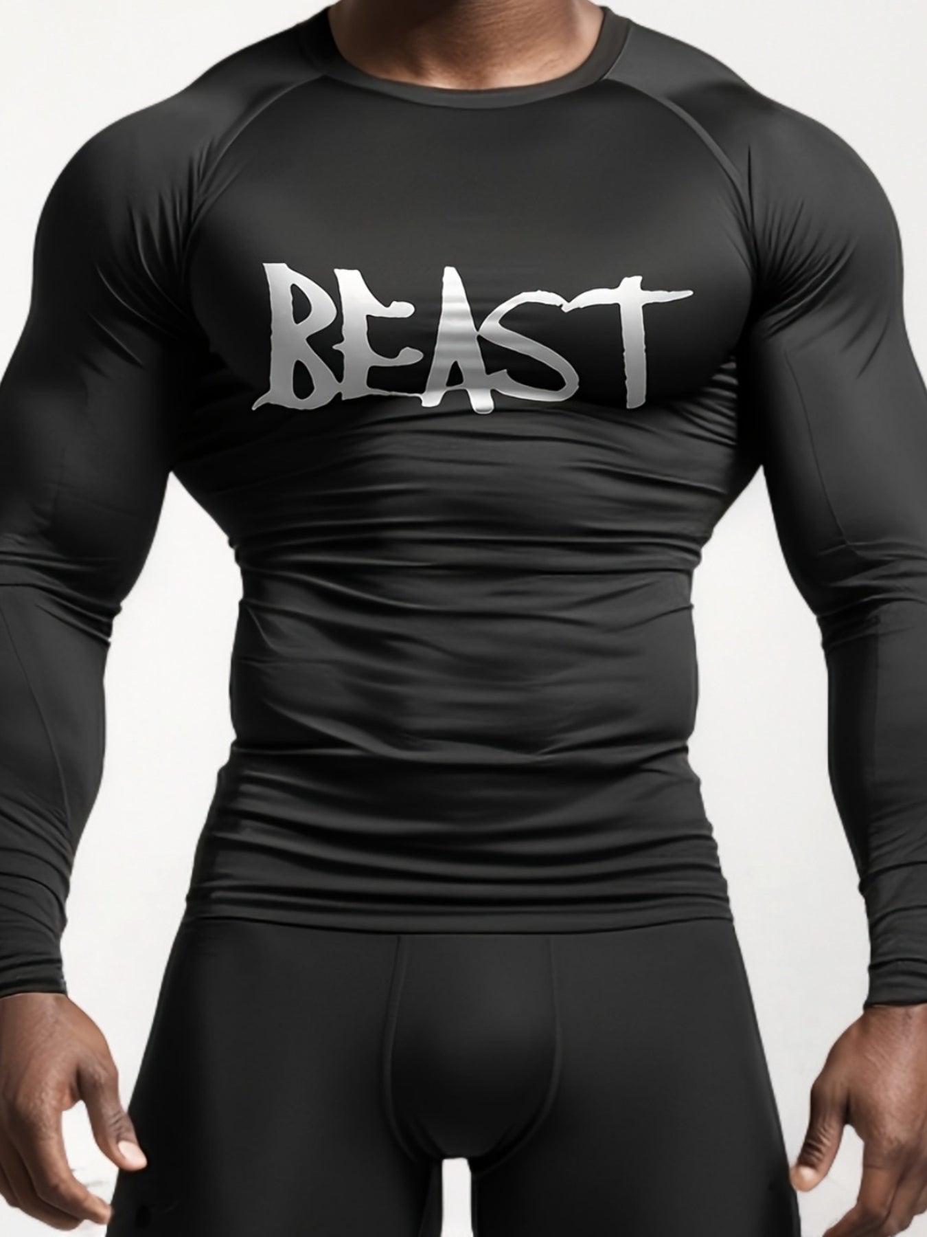 Տղամարդկանց սպորտային երկարաթև կոմպրեսիոն վերնաշապիկ՝ «BEAST» տպագիր, արագ չորացող, խոնավությունը մաքրող, շնչող պոլիեսթեր-սպանդեքս խառնուրդ, իդեալական մարզասրահի, վազքի, բասկետբոլի և բացօթյա գործունեության համար, մարզասրահի հագուստ