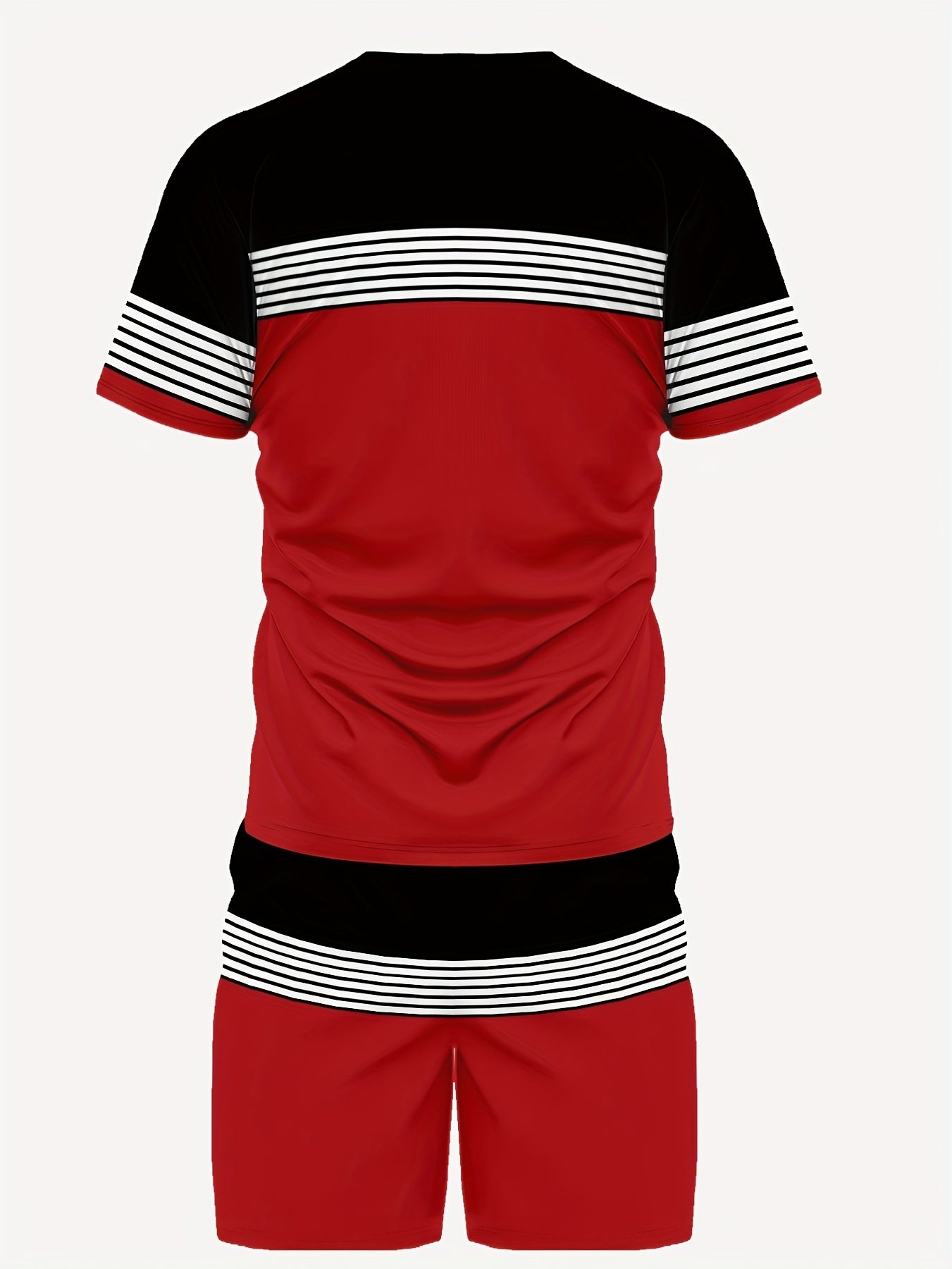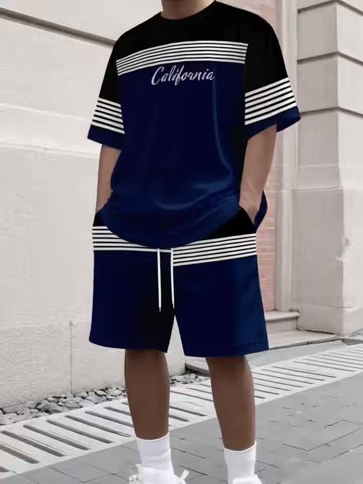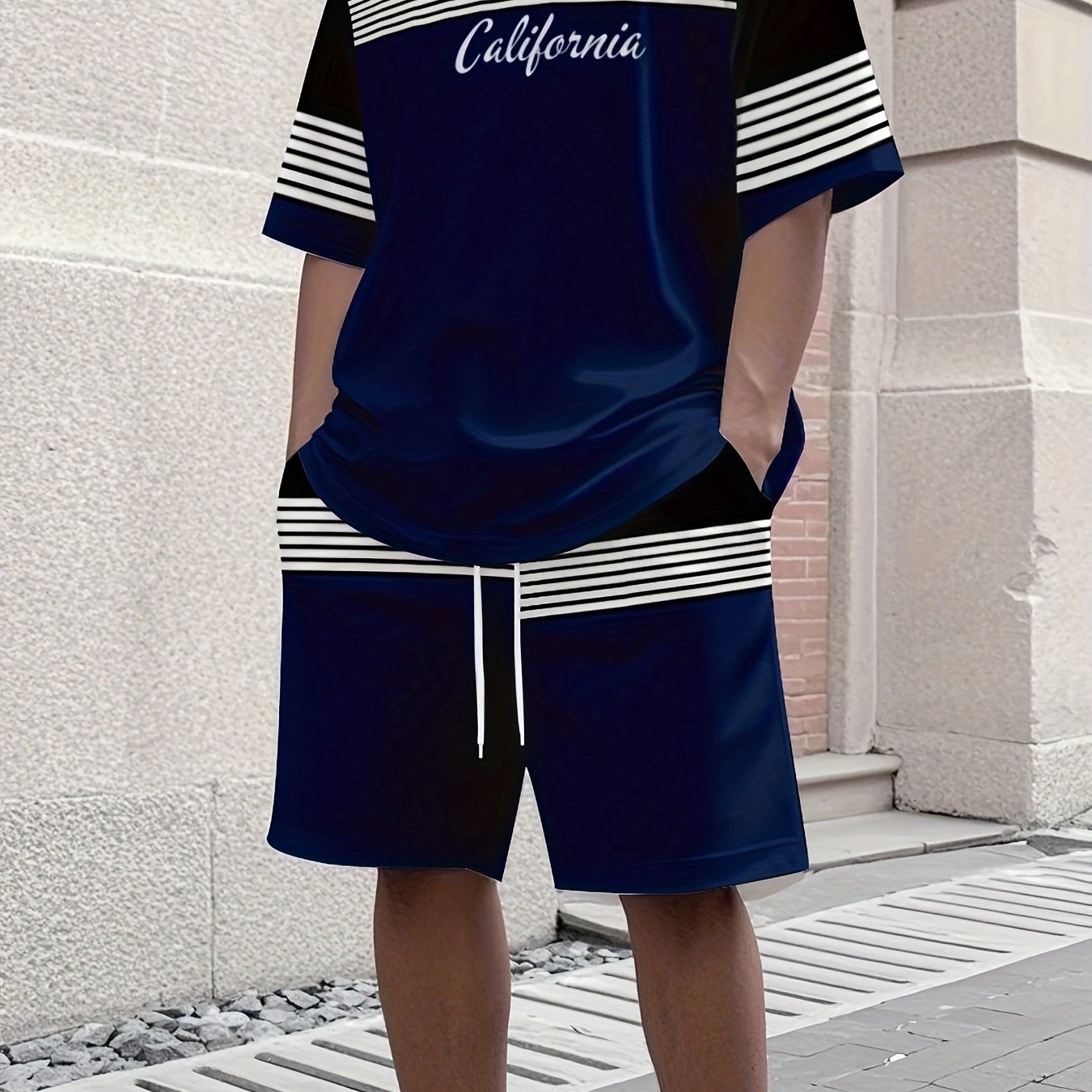 Տղամարդու մարզական շապիկի և շորտերի հավաքածու - California Graphic, կապույտ և սպիտակ, գոտիով գոտկատեղ, ամառային սպորտային հագուստ, սովորական չափսի, մեծահասակների մարզական հագուստ | California Design | Knit Constructio