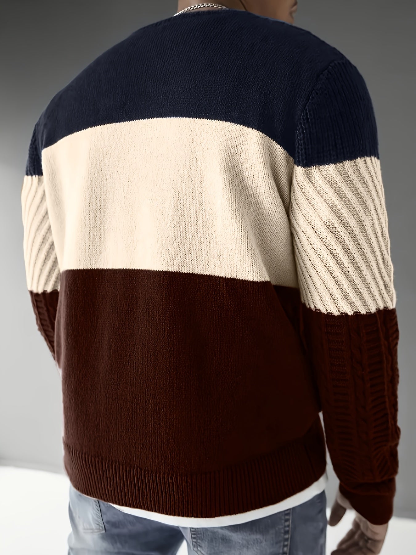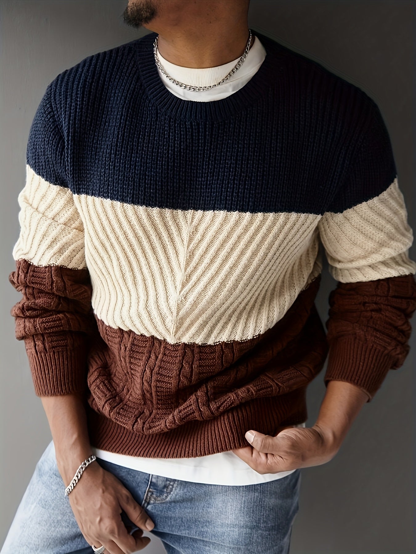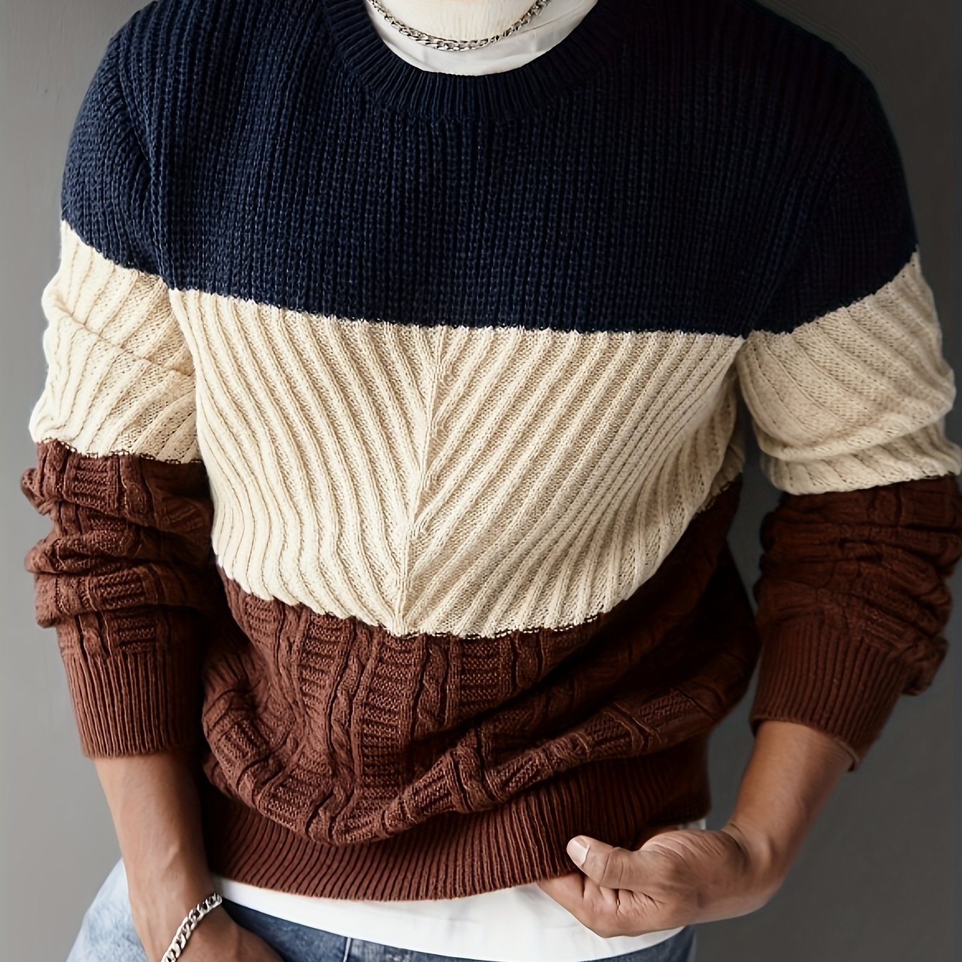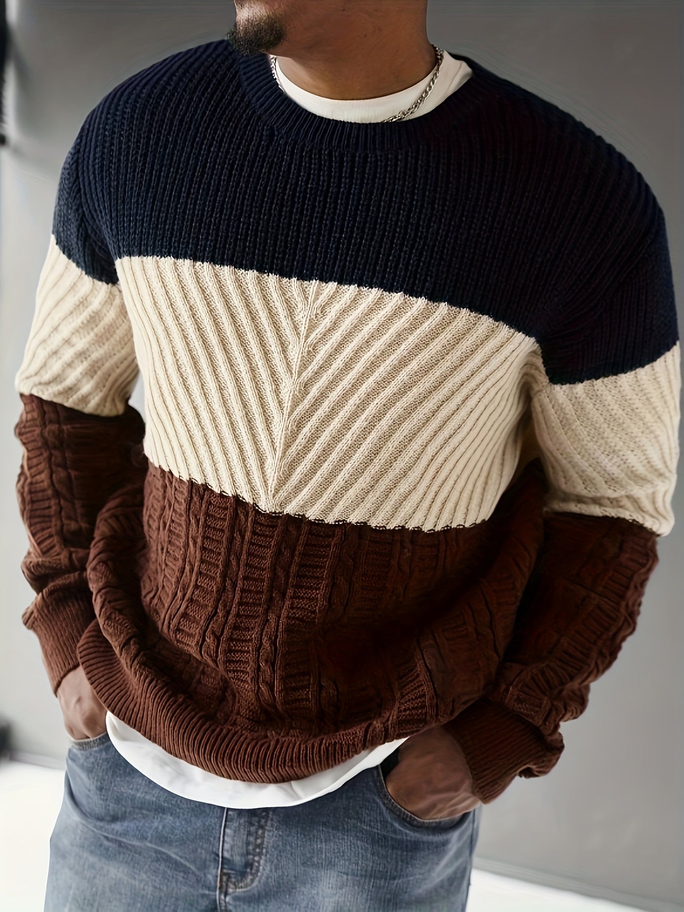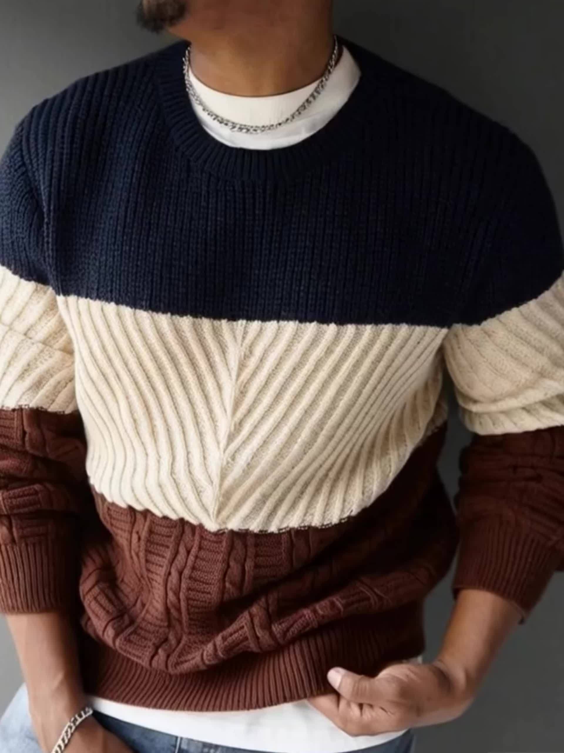 Տղամարդկանց աշնանային և ձմեռային նորաձև հագուստ, նորաձև առօրյա գունային բլոկներով տրիկոտաժե սվիտեր՝ բազմաֆունկցիոնալ կլոր վզով, երկար թևքերով դիզայնով