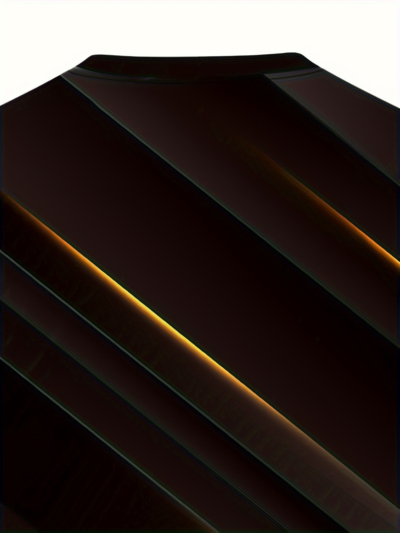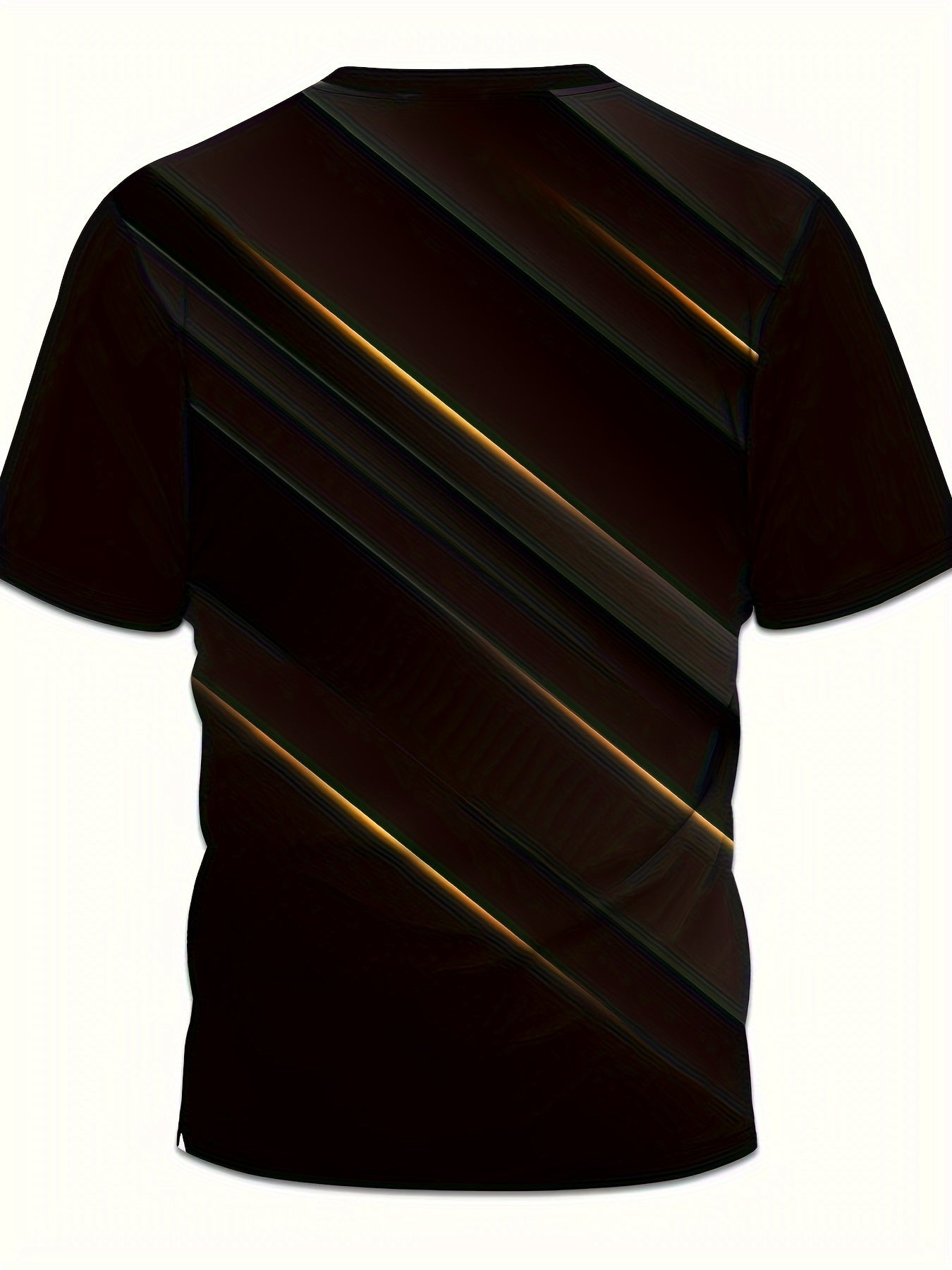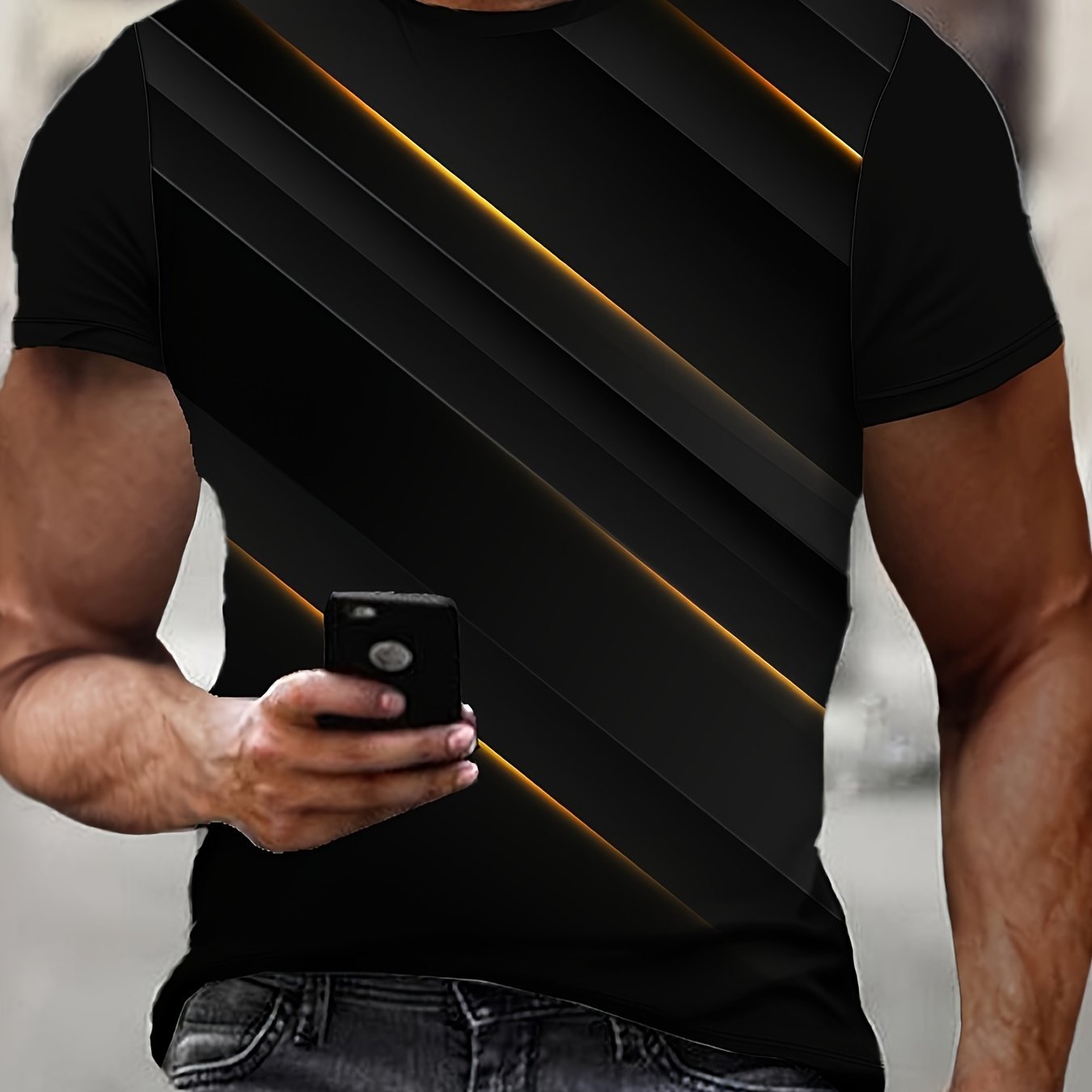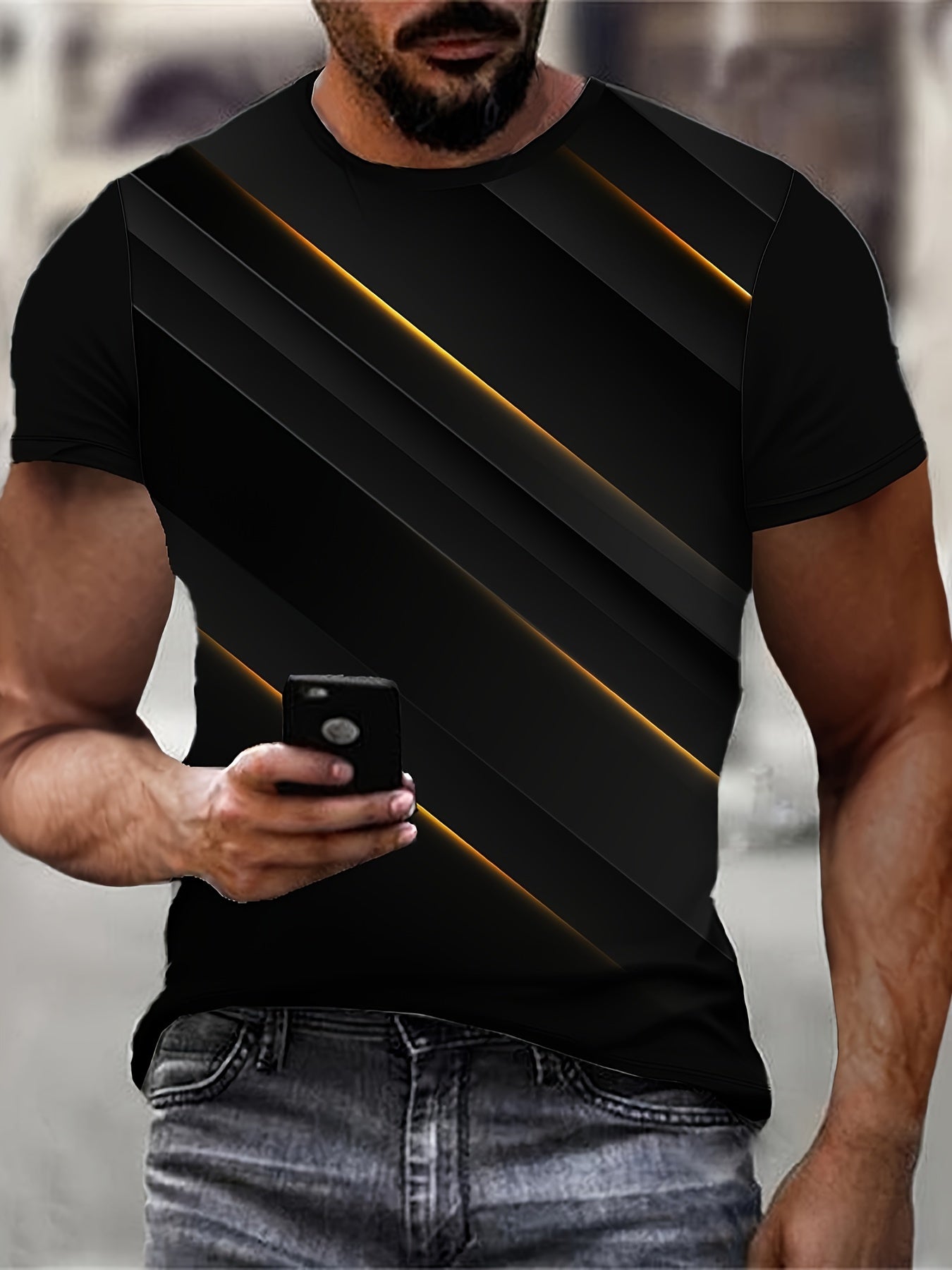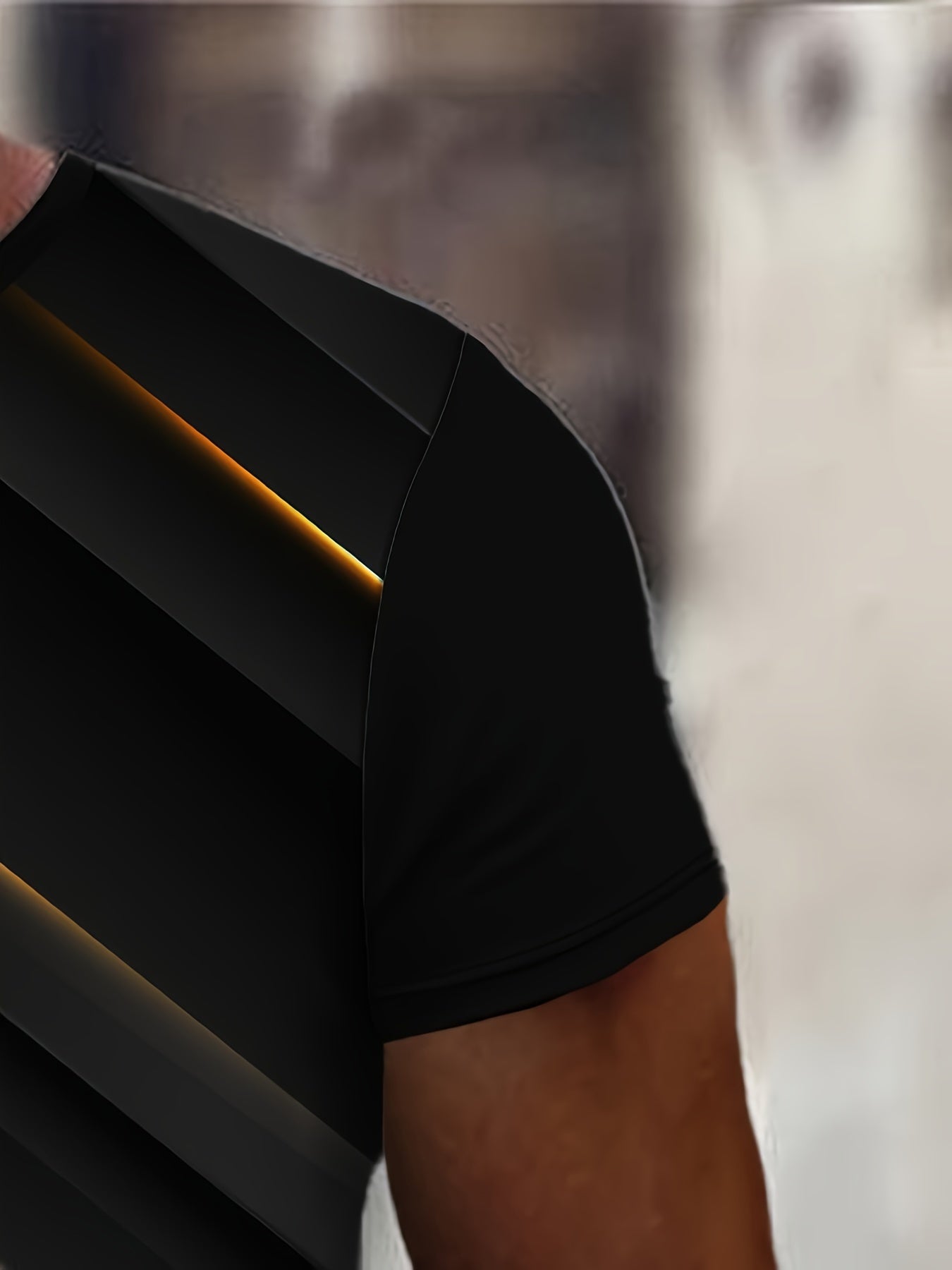 Տղամարդկանց սև 3D տպիչով շապիկ ոսկեգույն երկրաչափական գծերով. կարճաթև ամառային թիկնոց բացօթյա սպորտի համար, թեթև պոլիեսթեր խառնուրդ, կլոր պարանոց, լվացվող մեքենայում