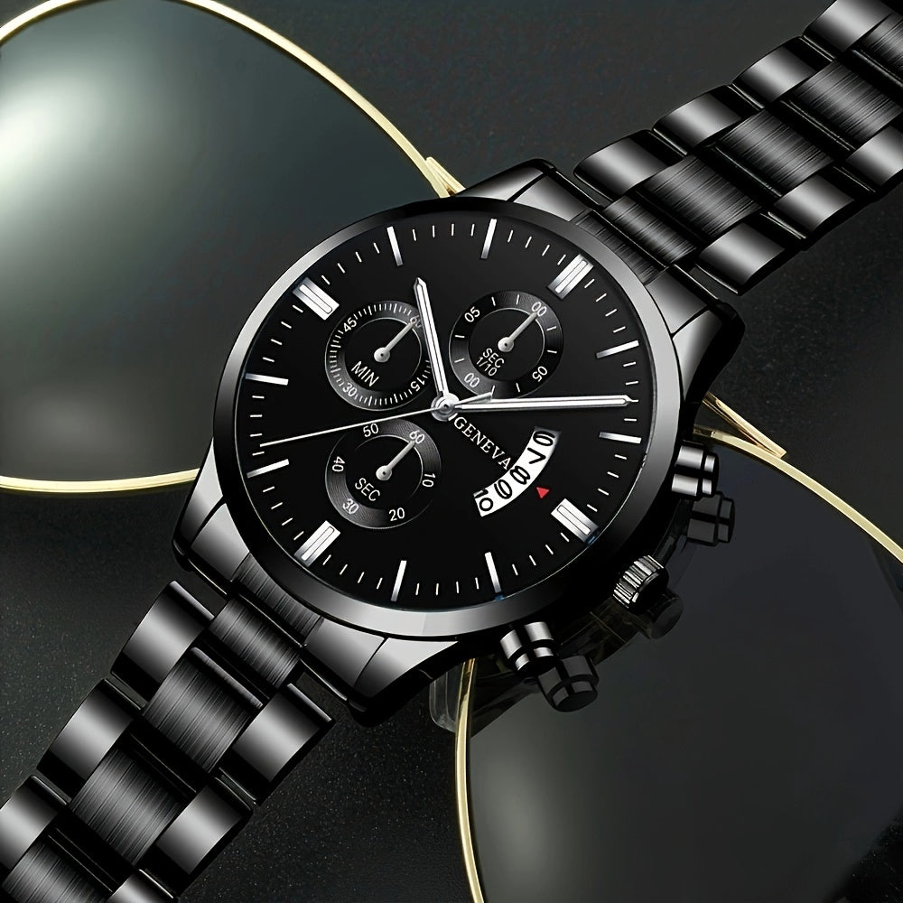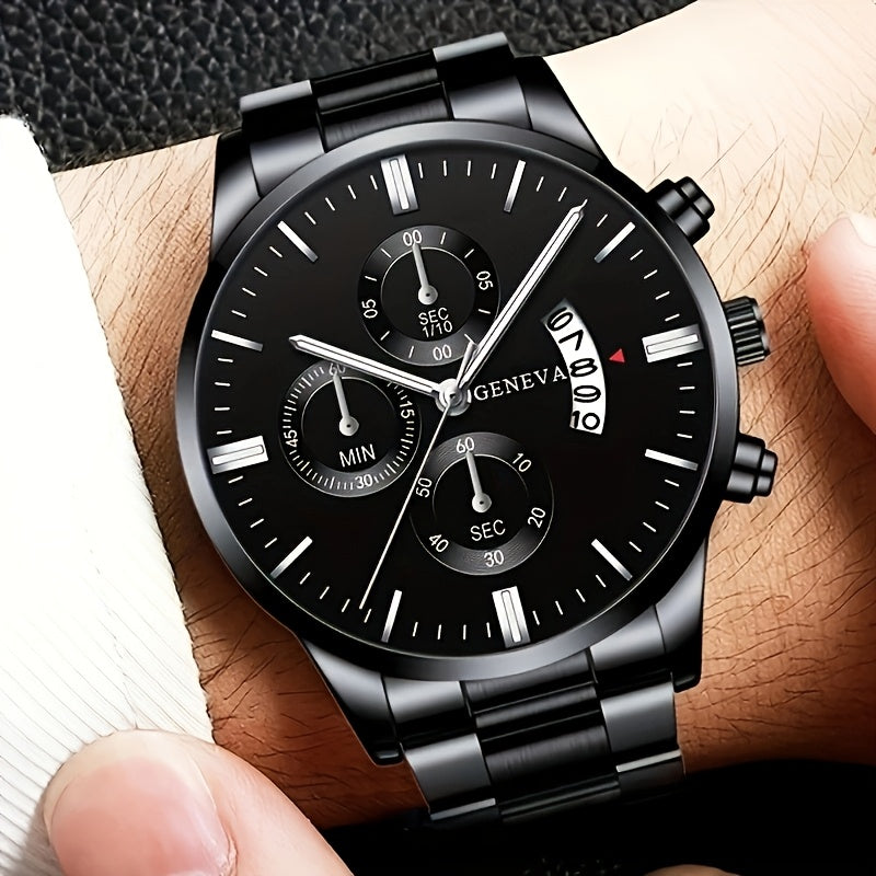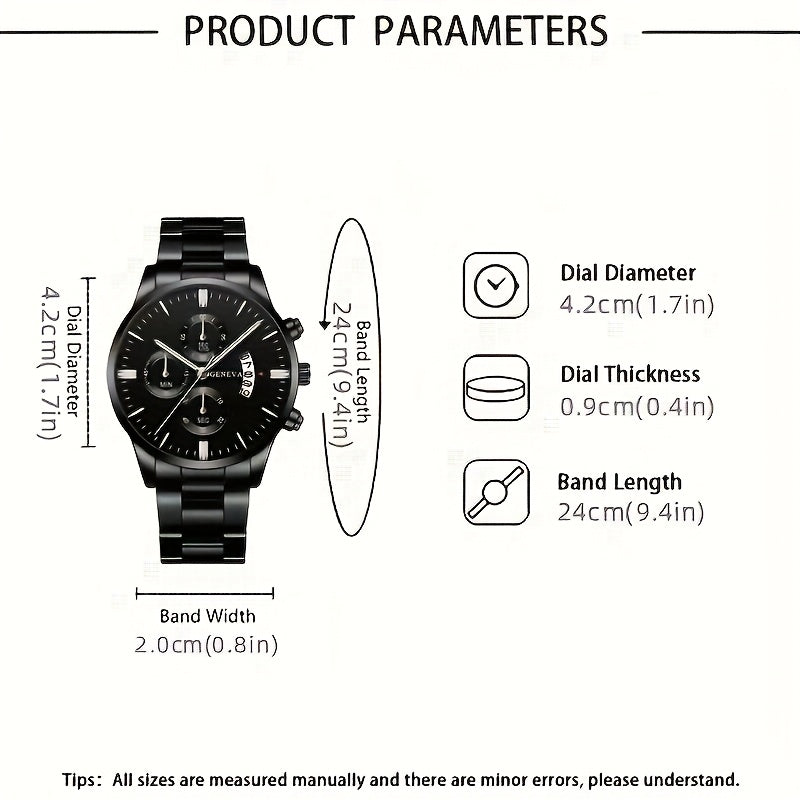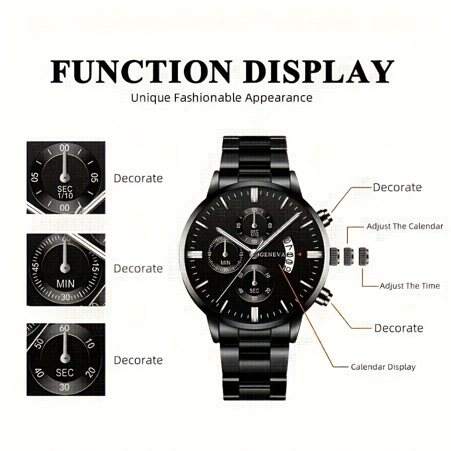 Տղամարդու գործնական կլոր քվարցային ժամացույց օրացույցի էկրանով, սև չժանգոտվող պողպատե ժապավենով, էլեկտրոնային մեխանիզմով, կատարյալ նվեր Սուրբ Վալենտինի օրվա, Զատկի, Հելոուինի, Ռամադանի, ծննդյան օրերի, Սուրբ Ծննդյան համար