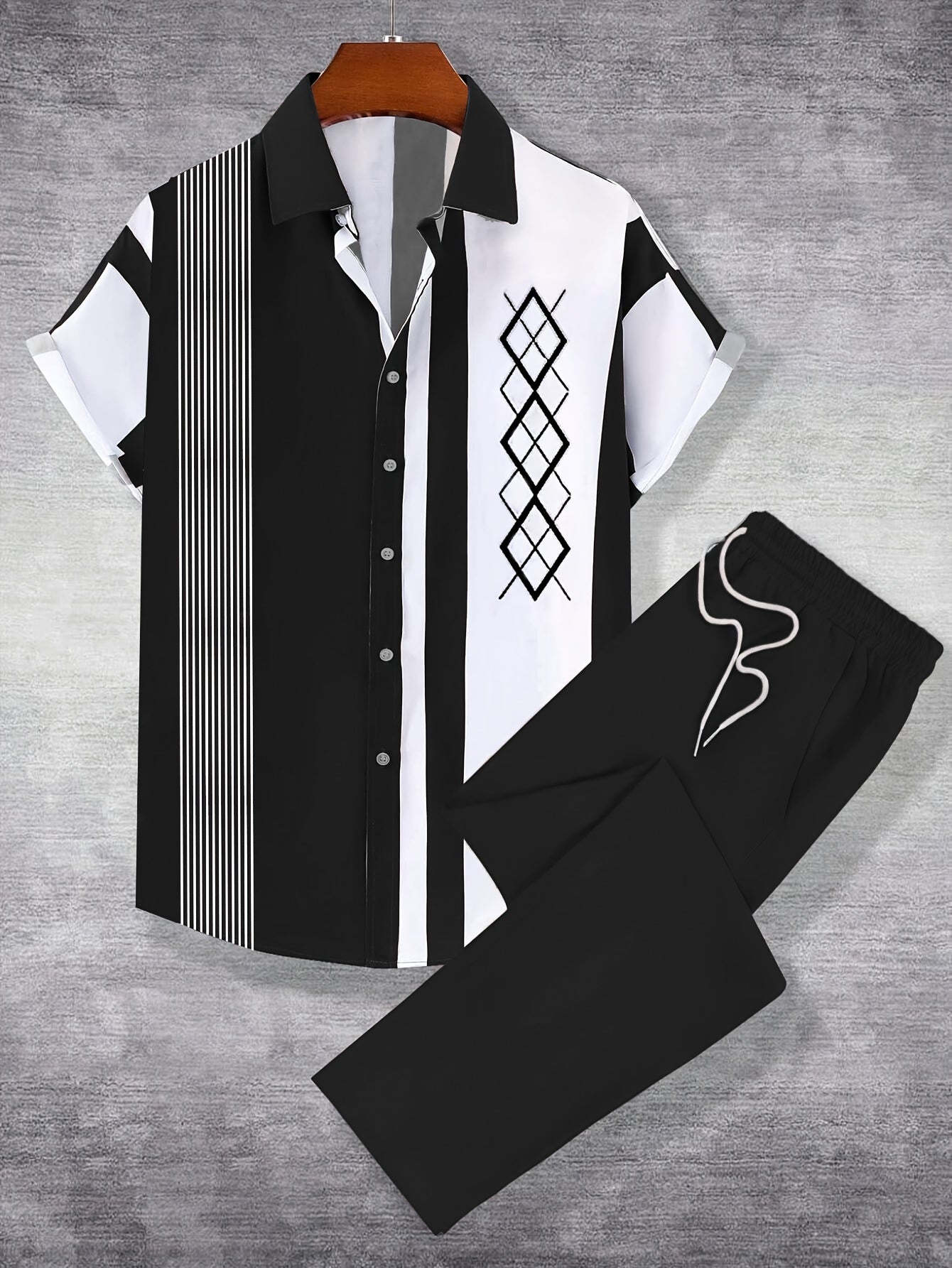 Տղամարդու կարճ թևքով վերնաշապիկի և տաբատի հավաքածու - սև և սպիտակ երկրաչափական նախշերով, պոլիեսթեր, չձգվող, ամառային սպորտային, սովորական չափսի, ամենօրյա հագուստ | Երկրաչափական նախշերով վերնաշապիկ | Պոլիեսթերային գործվածք
