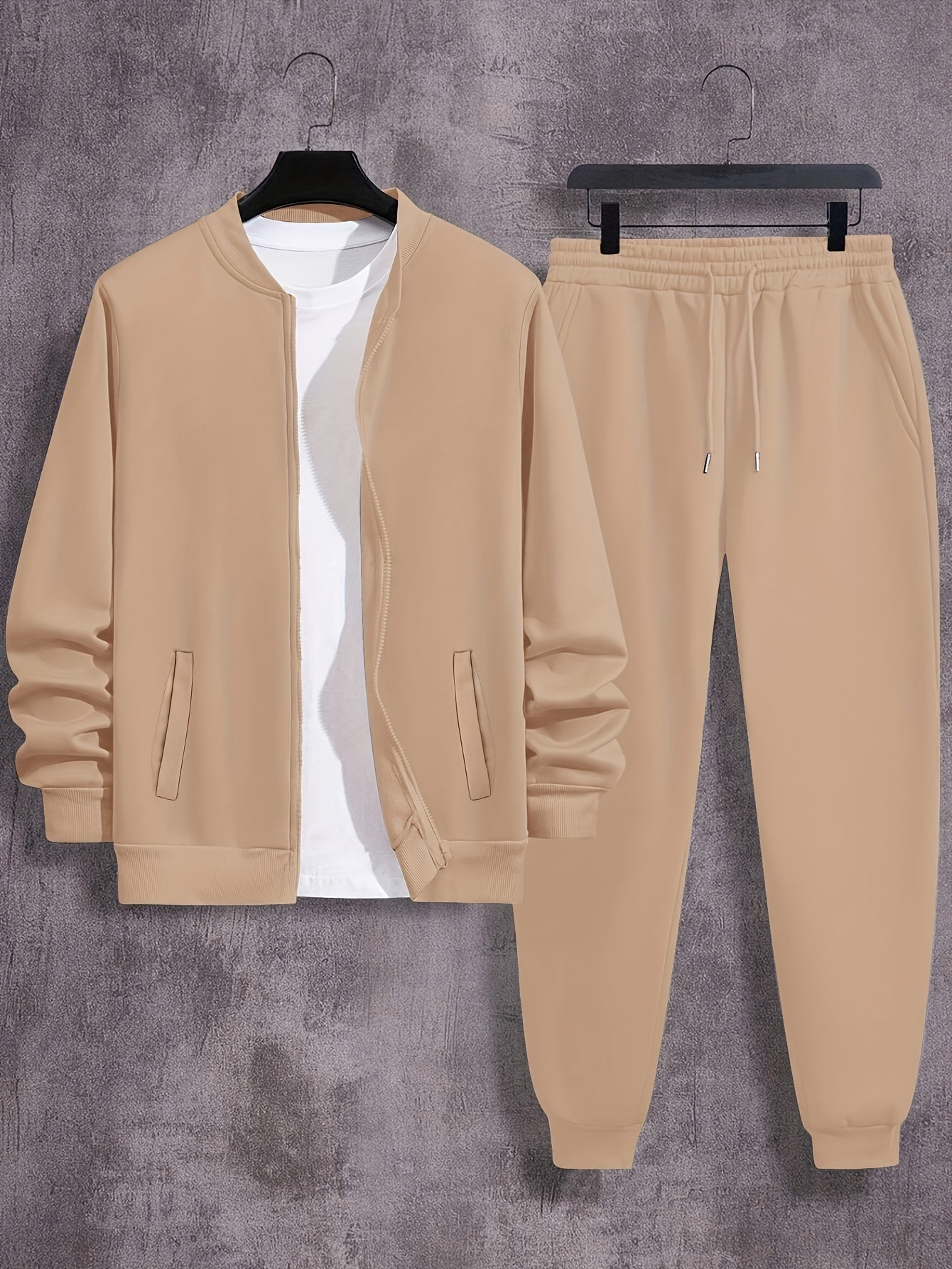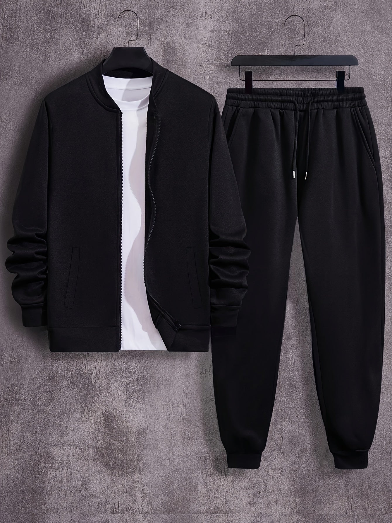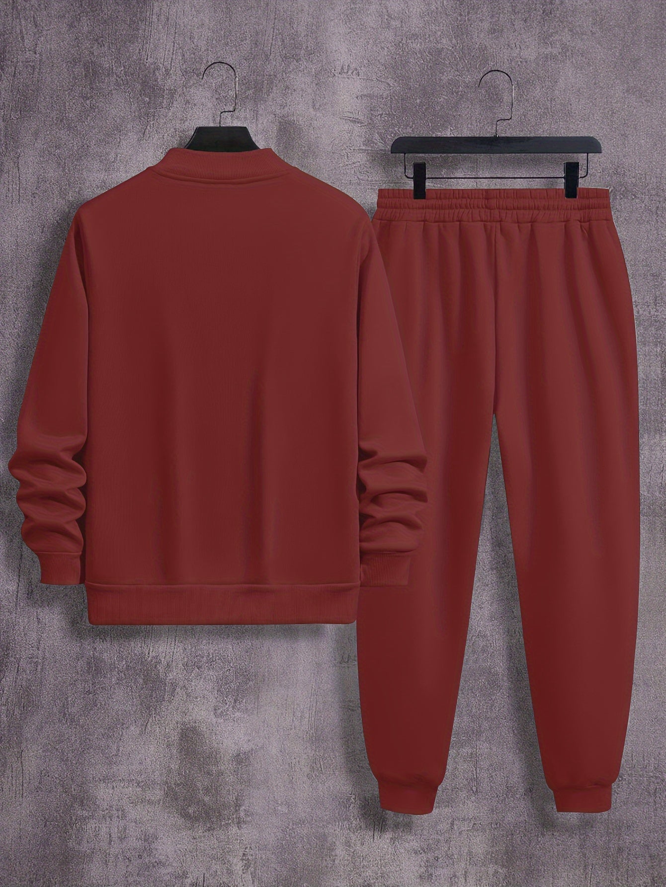 Men'S Casual Polyester Sweatsuit Set with Baseball Collar and Slight Stretch - Solid Color Long Sleeve Knit Fabric Track Suit for Fall/Winter