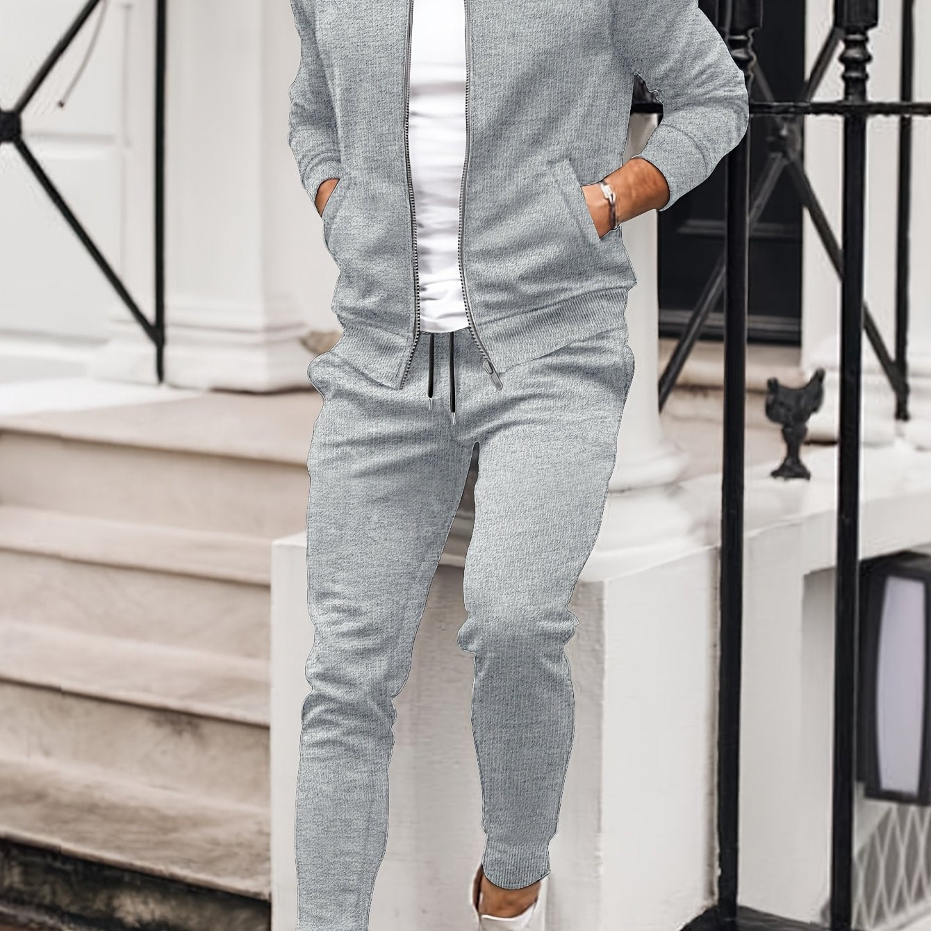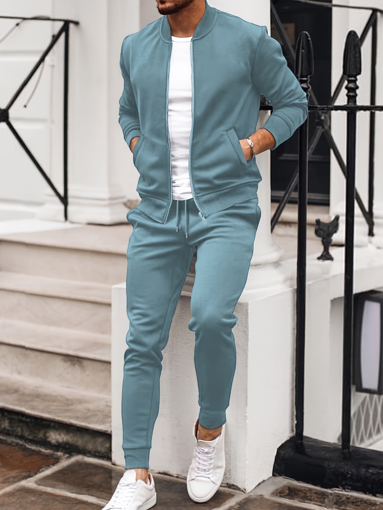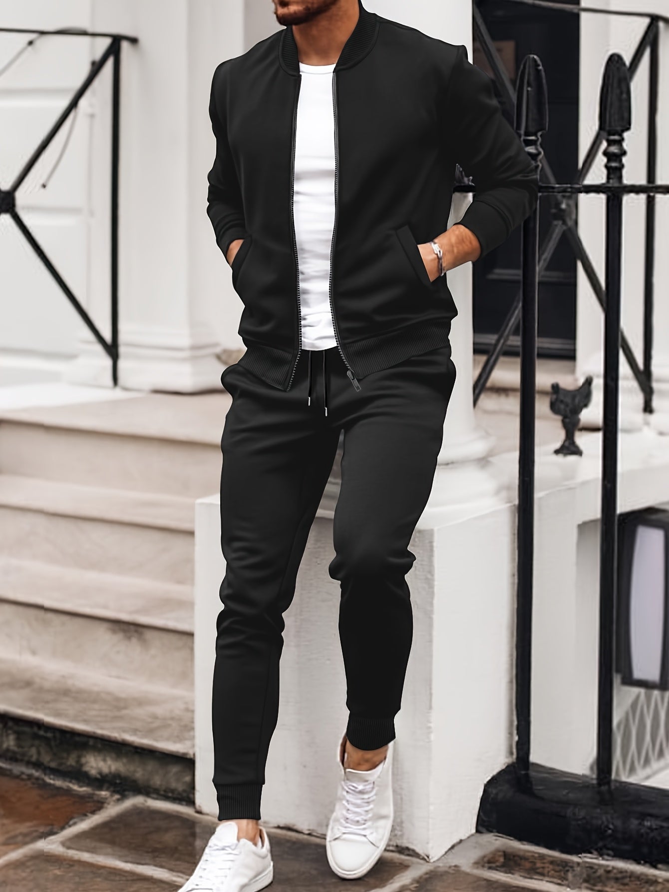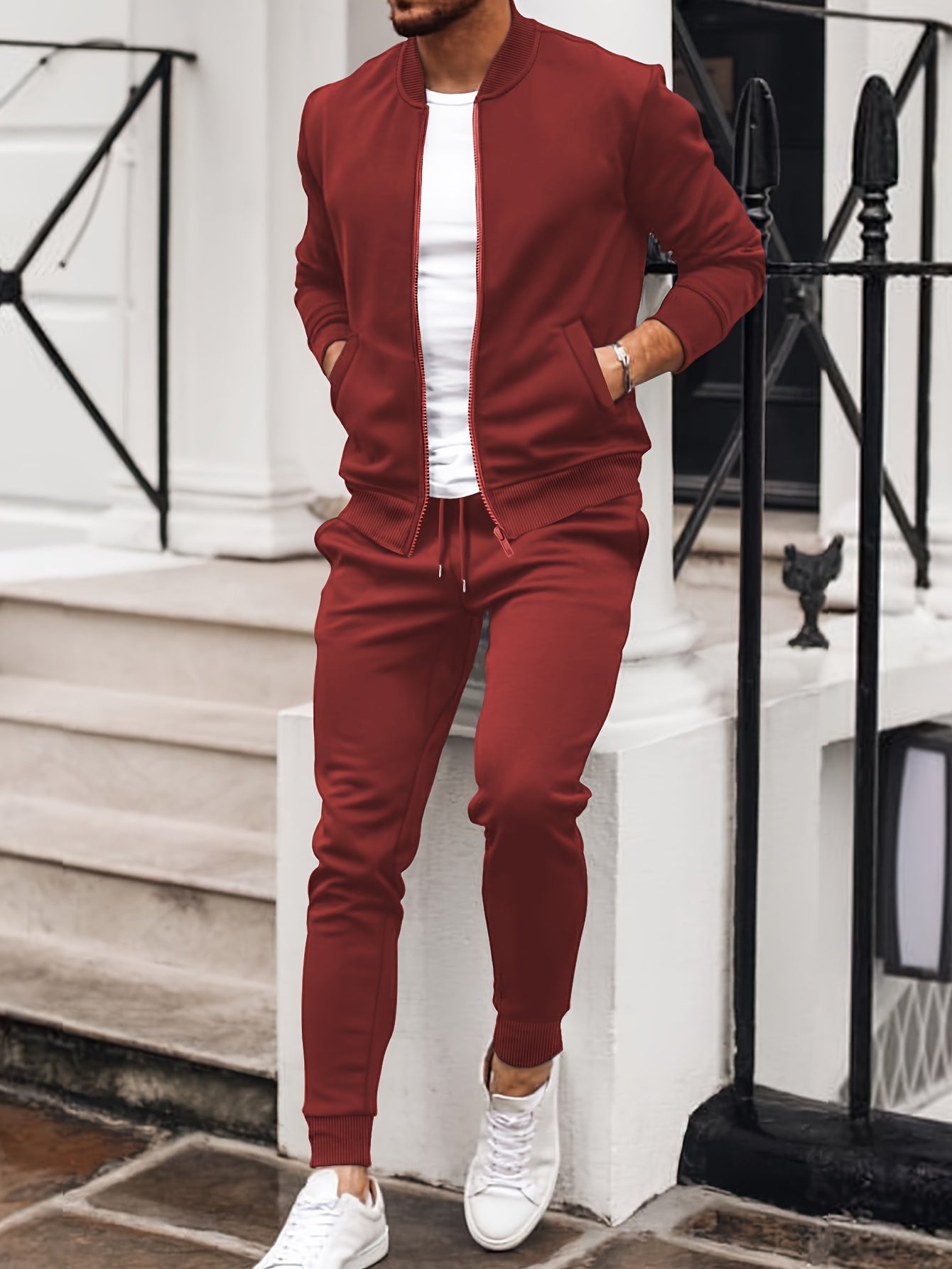 Men'S Casual Polyester Sweatsuit Set with Baseball Collar and Slight Stretch - Solid Color Long Sleeve Knit Fabric Track Suit for Fall/Winter