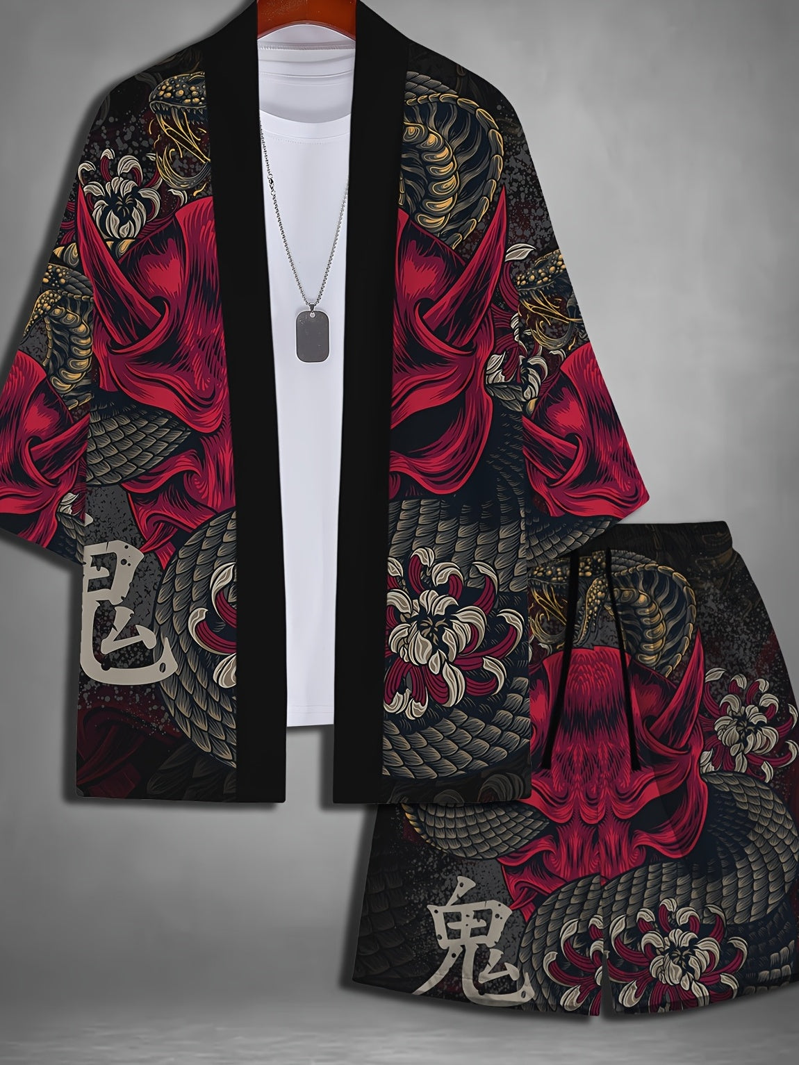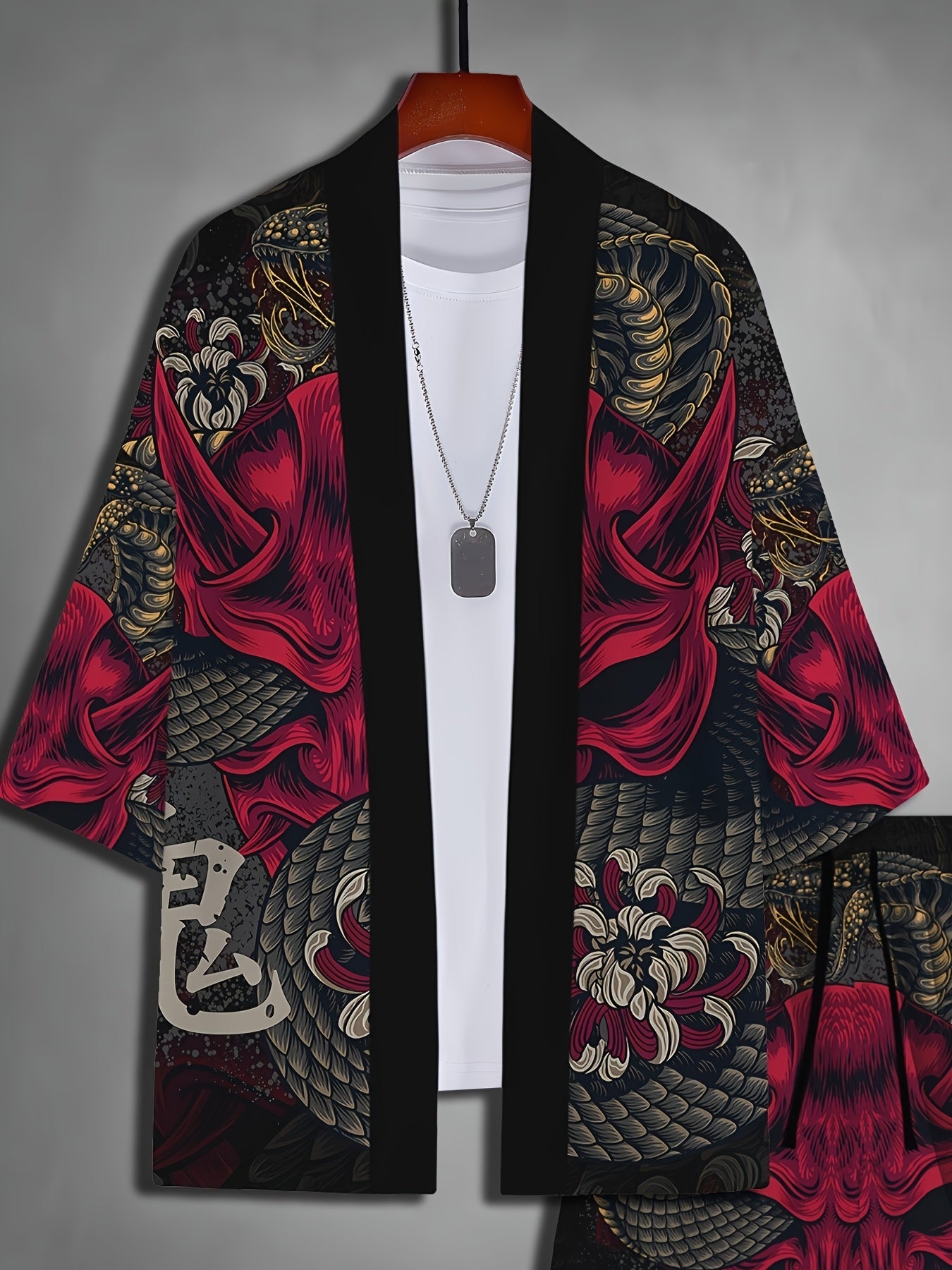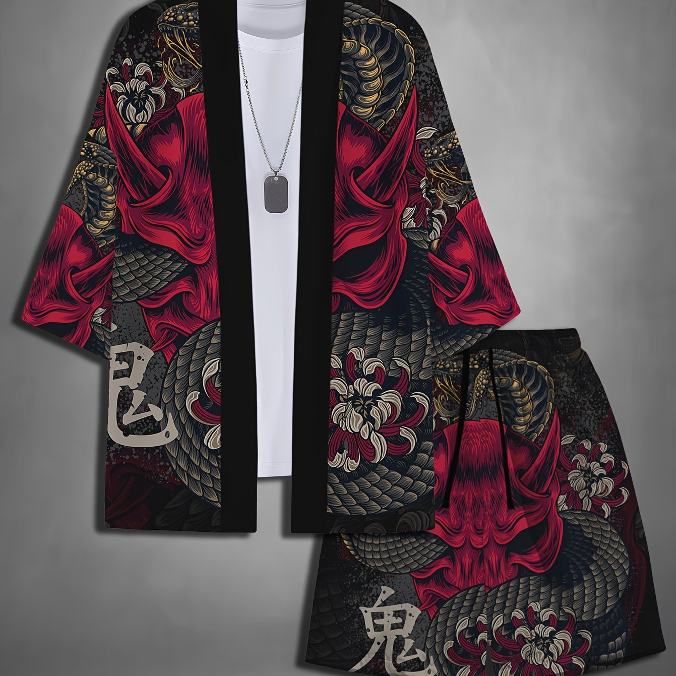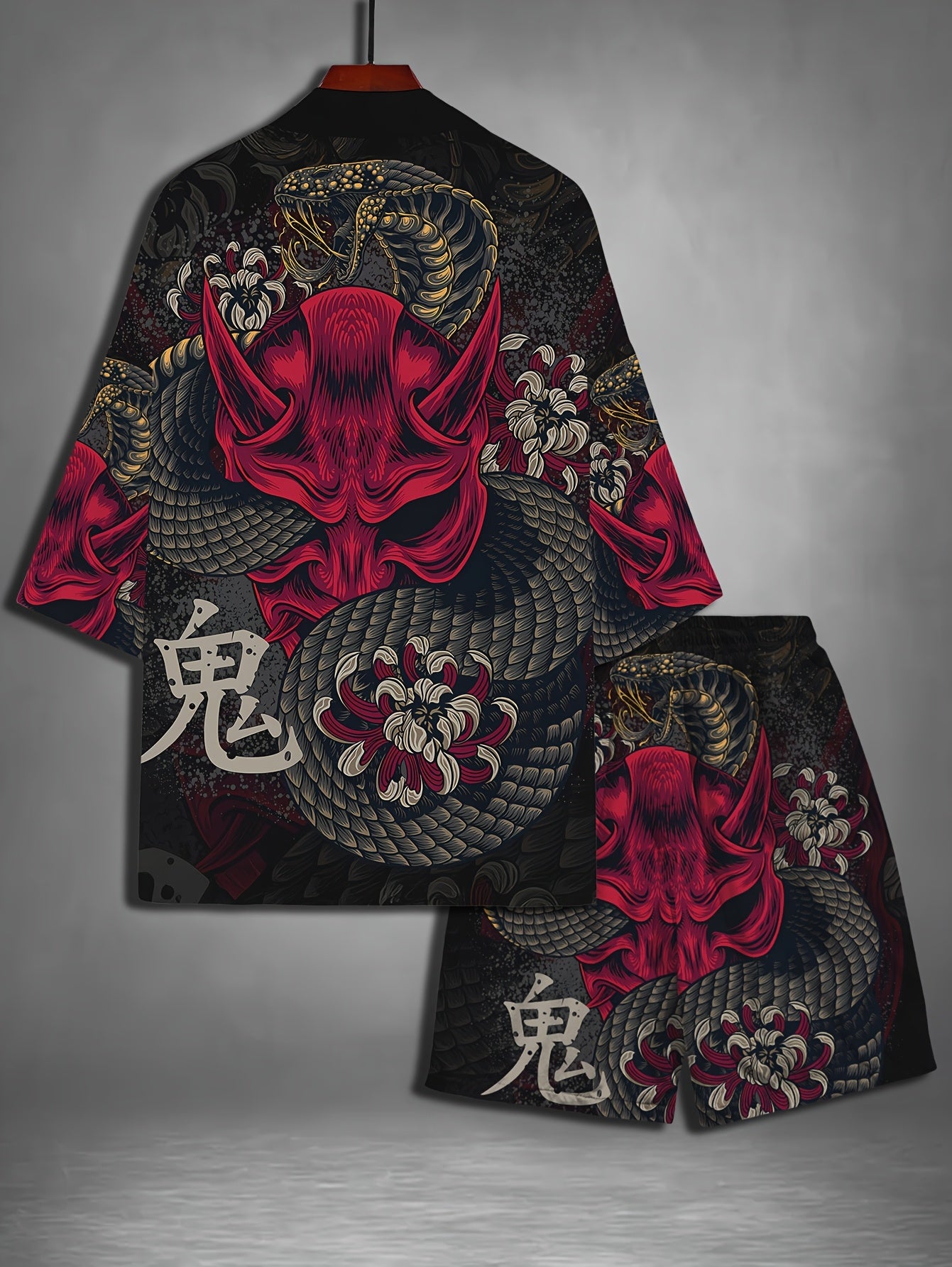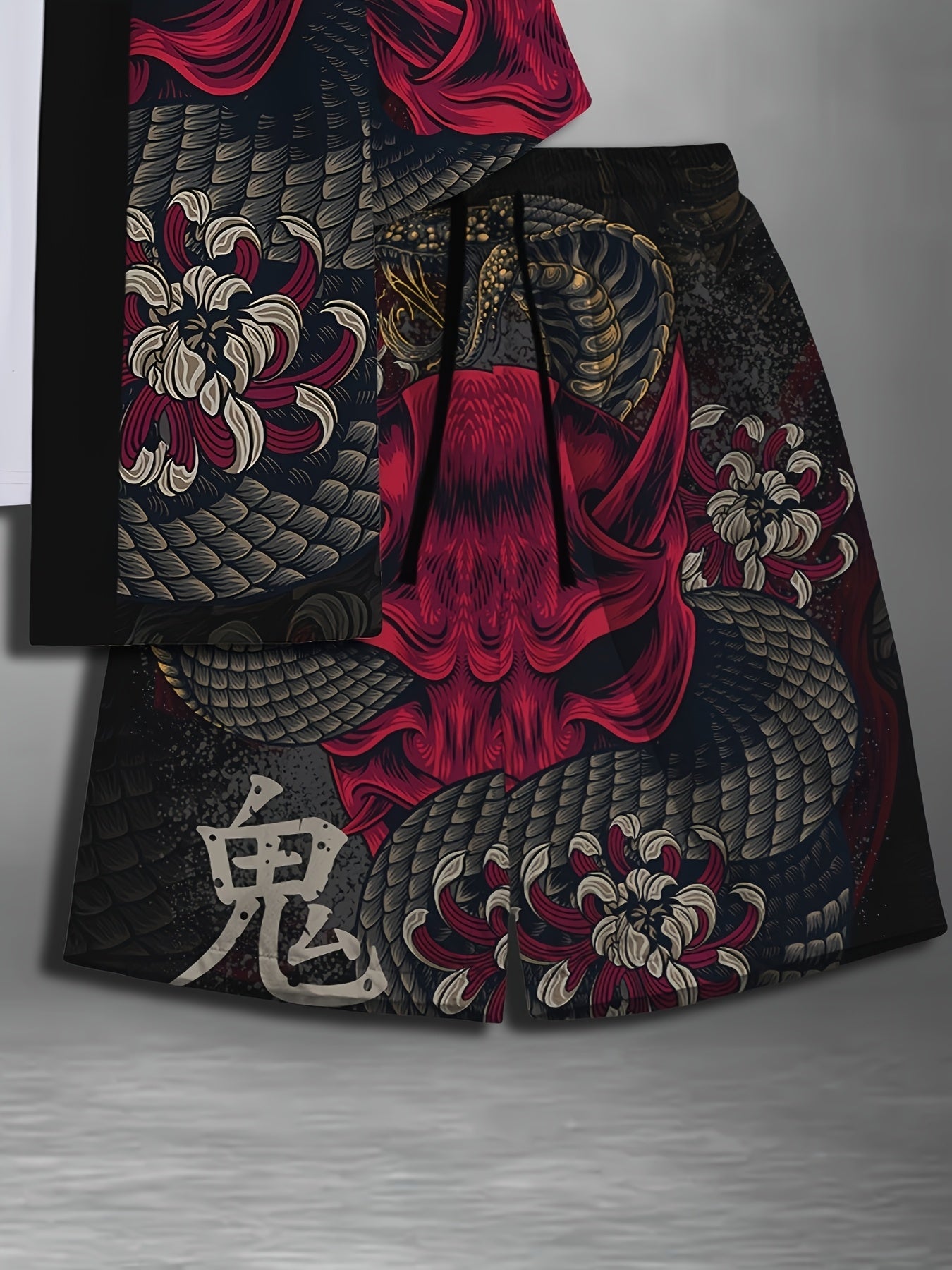 Տղամարդու առօրյա կարճ թևքերով լողափնյա հագուստի հավաքածու՝ բաց առջևով - սև և կարմիր ծաղկային նախշերով, ազատ չափսերով, չձգվող պոլիեսթեր, իդեալական է ամռան համար, լողափնյա հագուստ | Ծաղկային նախշերով շորտեր | Պոլիեսթերային գործվածք