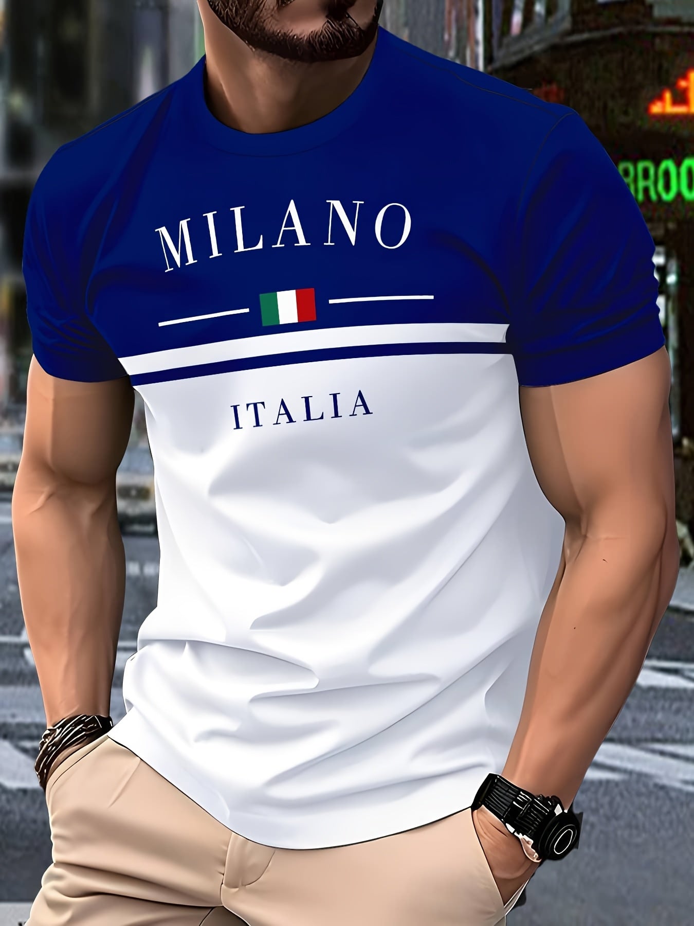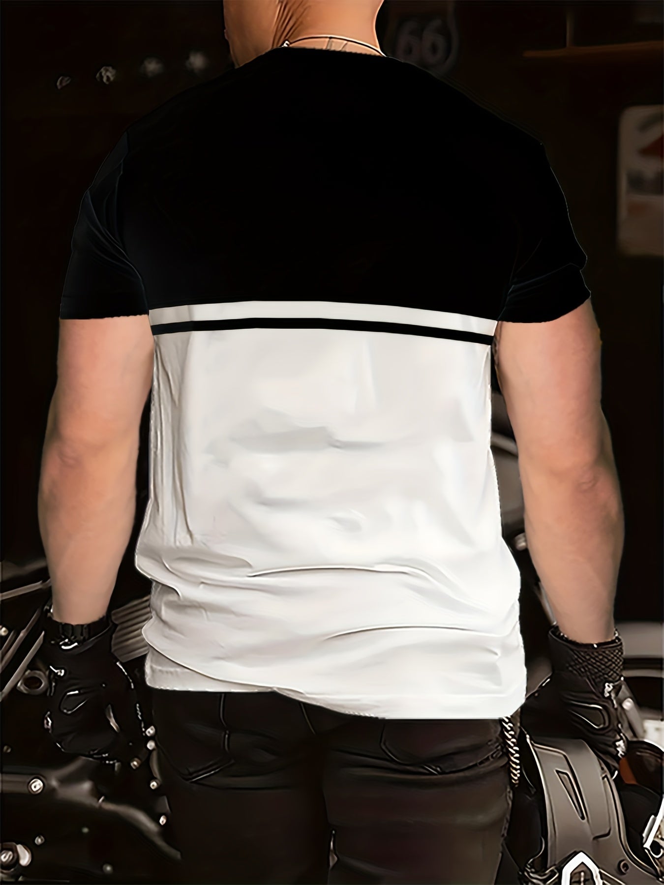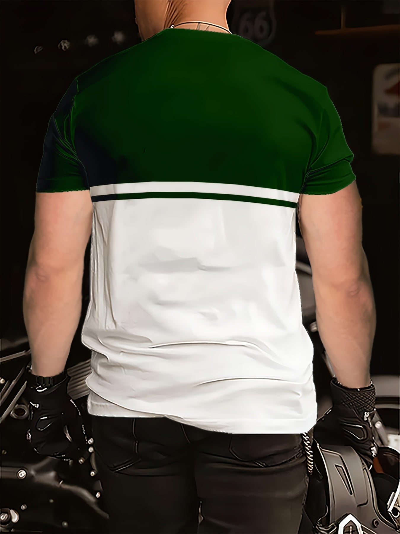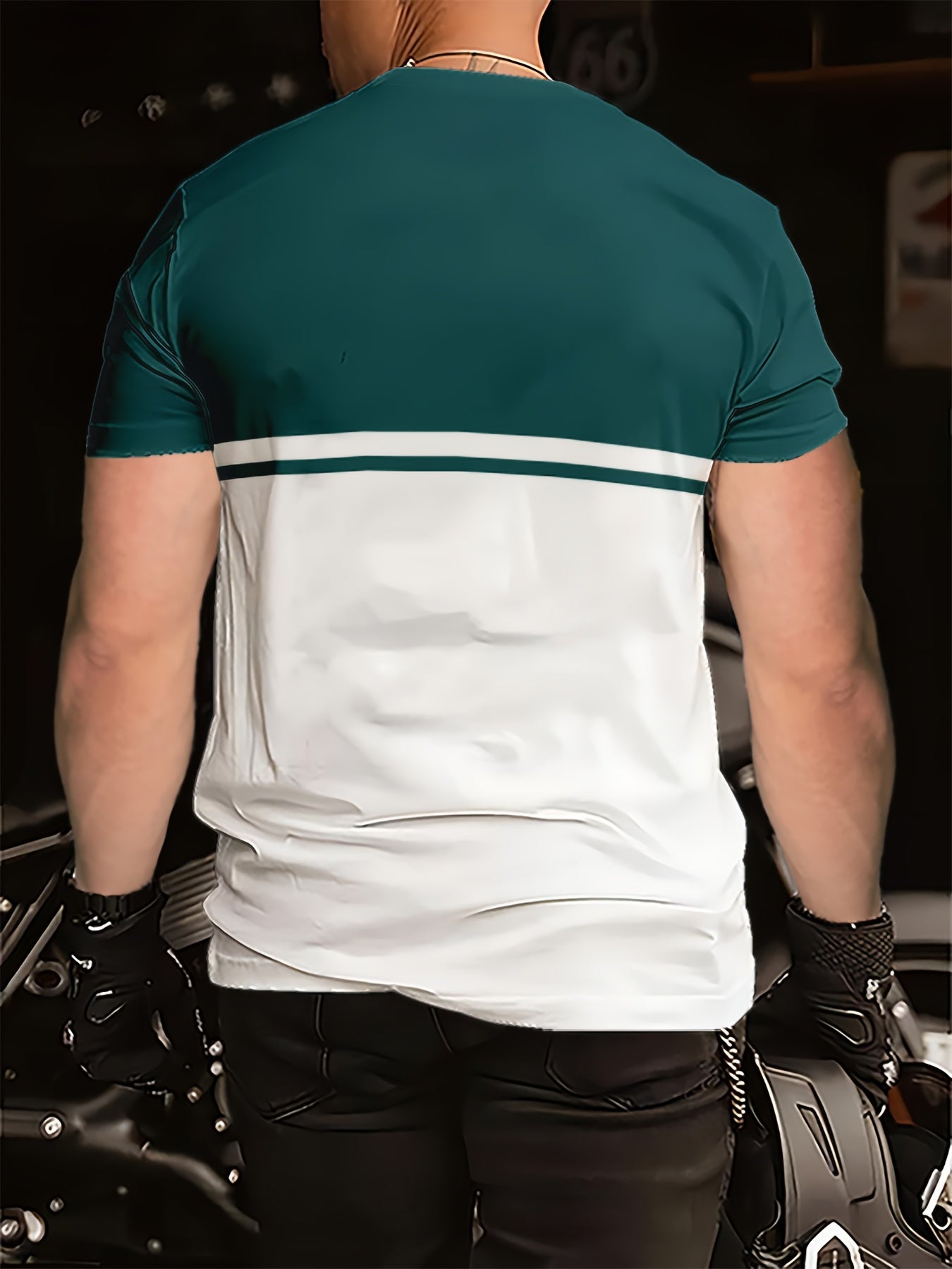 Տղամարդու կարճ թևքով, կլոր վզնոցով, շերտավոր պոլիեսթերային տրիկոտաժե մարզաշապիկ, շնչող, 110 գ/մ², թեթևակի ձգվող, կանոնավոր չափսերով, հարթ հյուսվածքով, հարմար է ամառային հանգստյան օրերին կրելու համար։