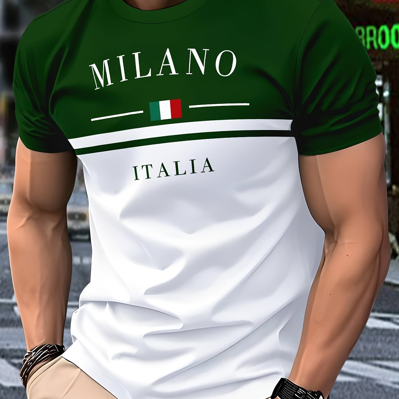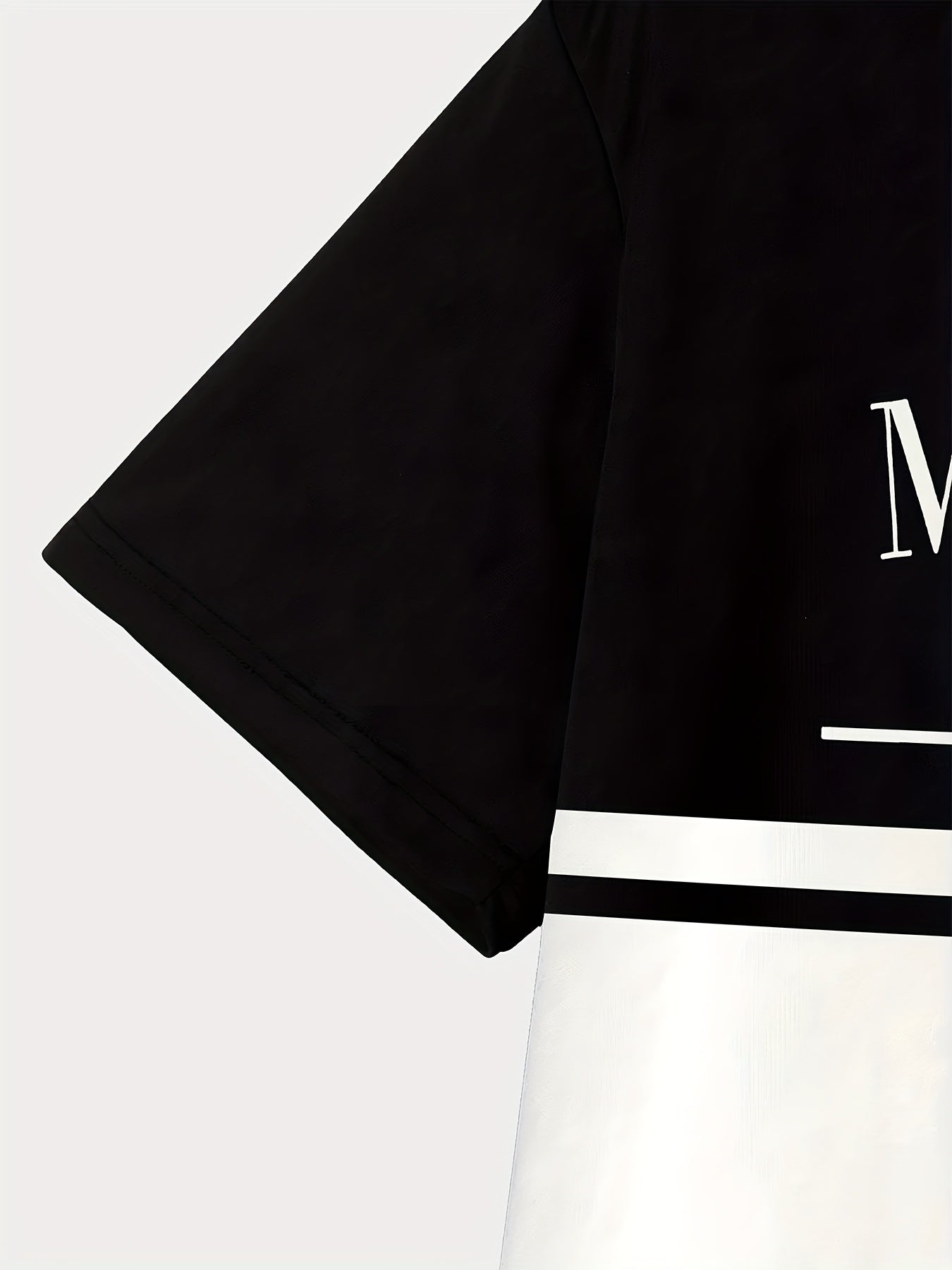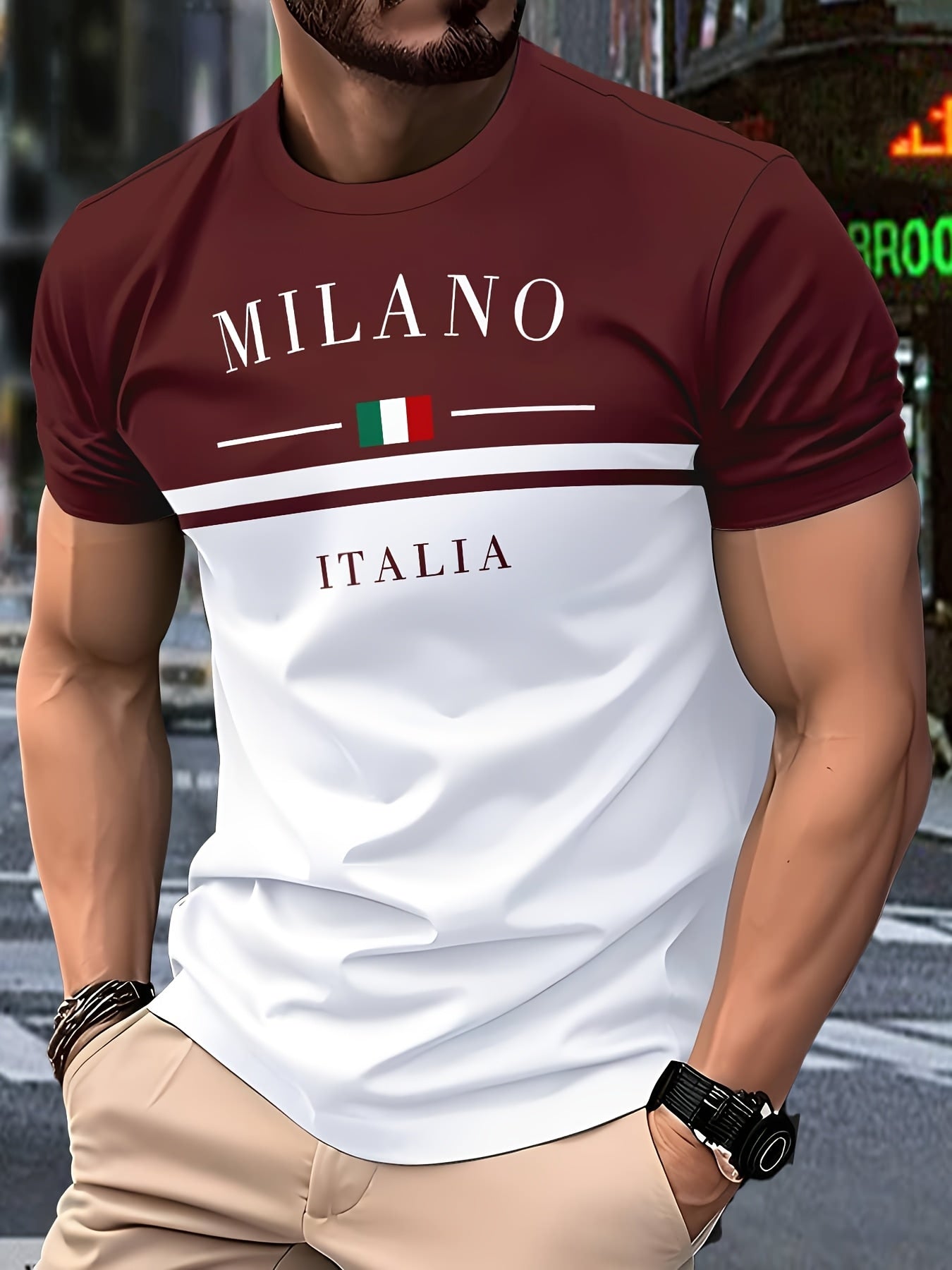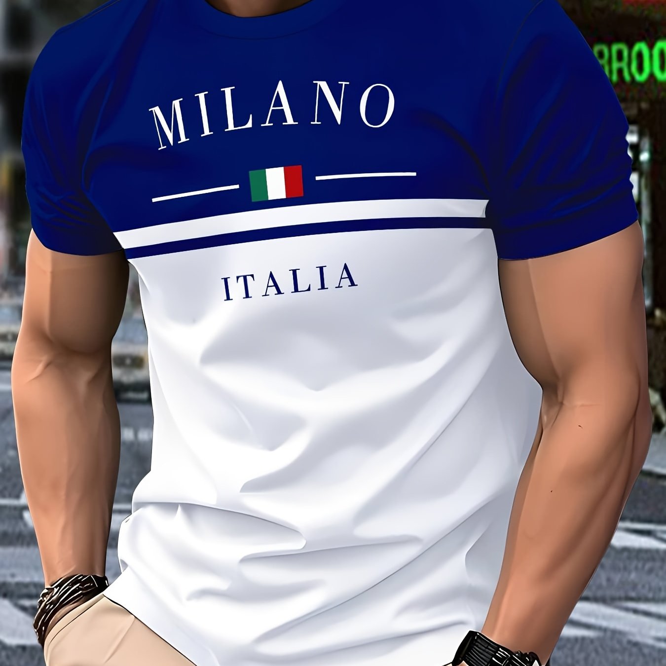 Տղամարդու կարճ թևքով, կլոր վզնոցով, շերտավոր պոլիեսթերային տրիկոտաժե մարզաշապիկ, շնչող, 110 գ/մ², թեթևակի ձգվող, կանոնավոր չափսերով, հարթ հյուսվածքով, հարմար է ամառային հանգստյան օրերին կրելու համար։