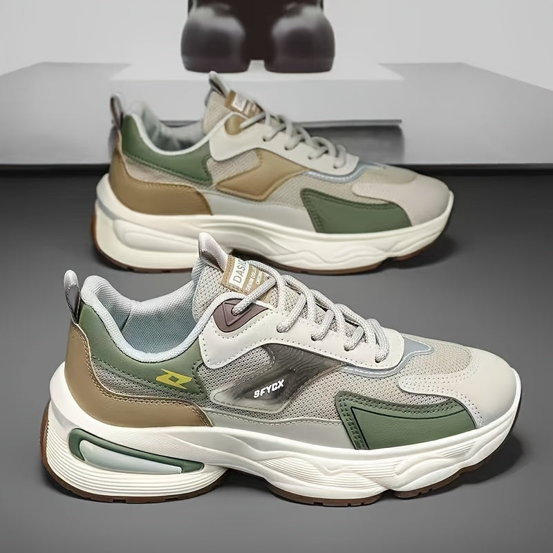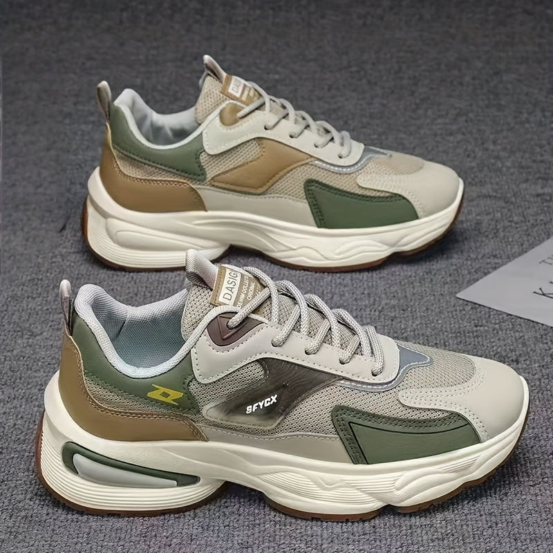Men'S Casual Sports Shoes - Thick-Soled Lace-Up Sneakers with Synthetic Upper, Cushioned EVA Insole PVC Sole for Outdoor Hiking, Running, Gym - All-Season Comfort in Beige/Black, Brown/White, Green/White, Versatile Trainers