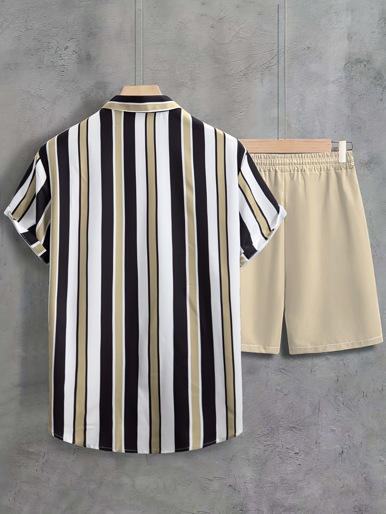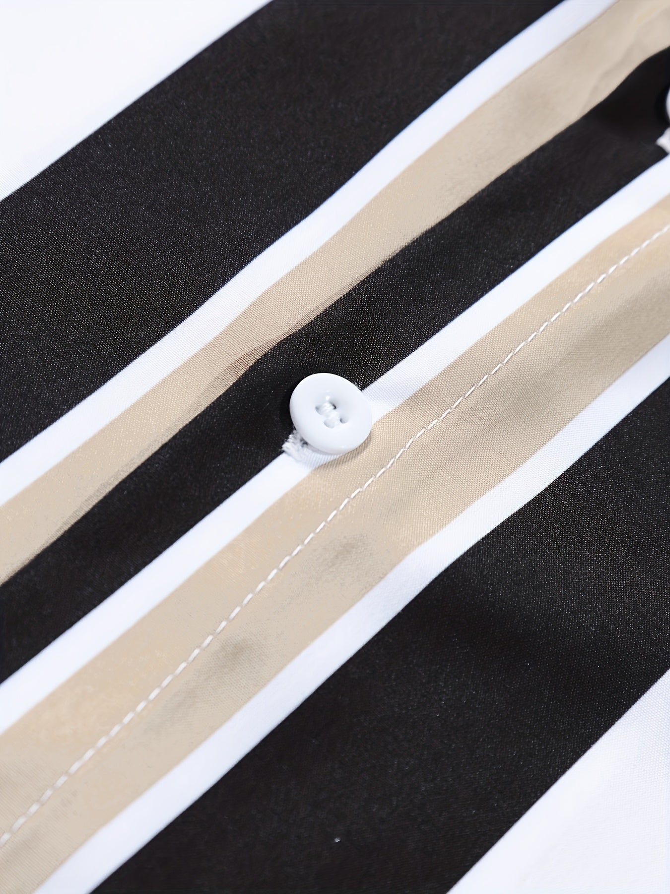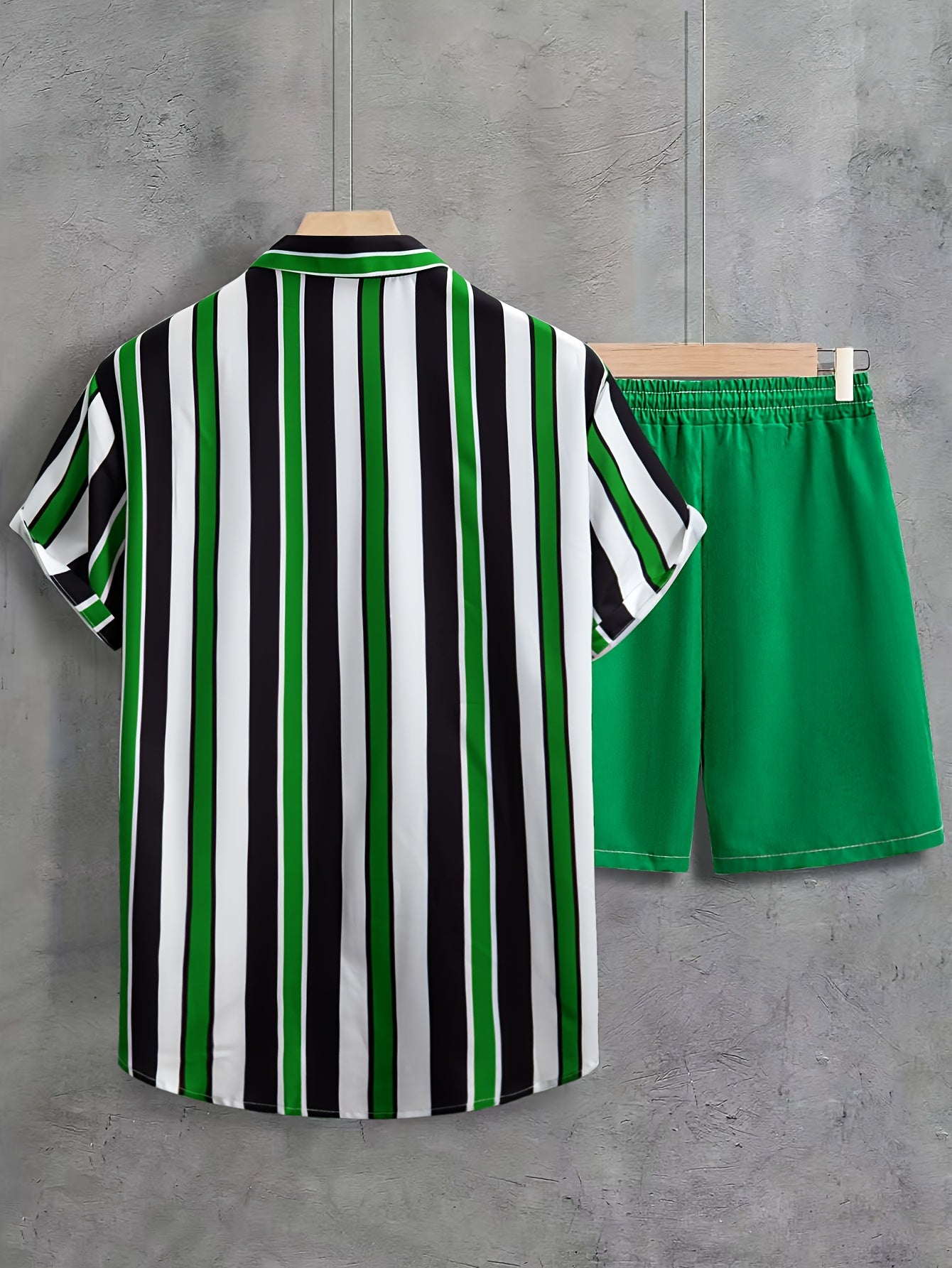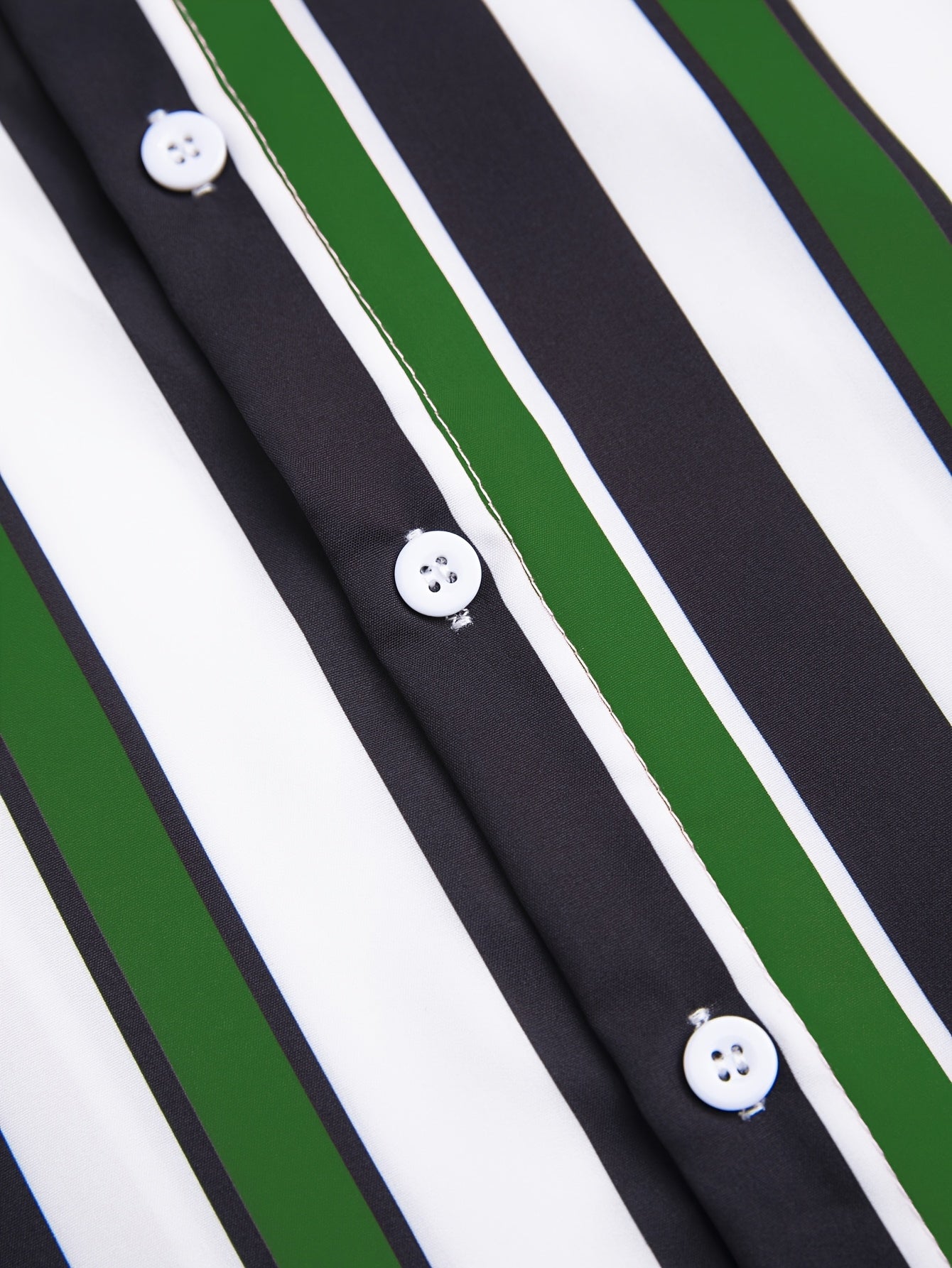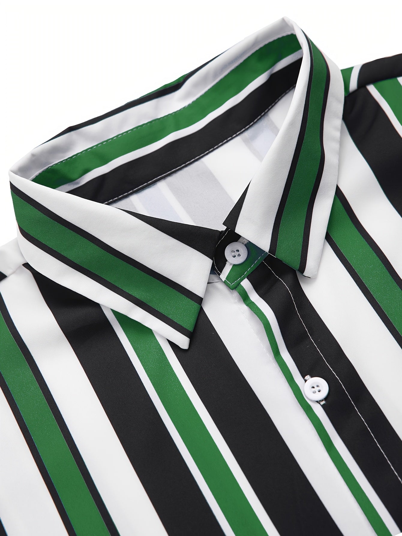 Տղամարդկանց սովորական գծավոր կոճակներով վերնաշապիկ և շորտեր սև, կանաչ և սպիտակ գույներով - թեթև պոլիեսթեր, լվացվող մեքենայում՝ բոլոր սեզոնների հարմարավետության համար