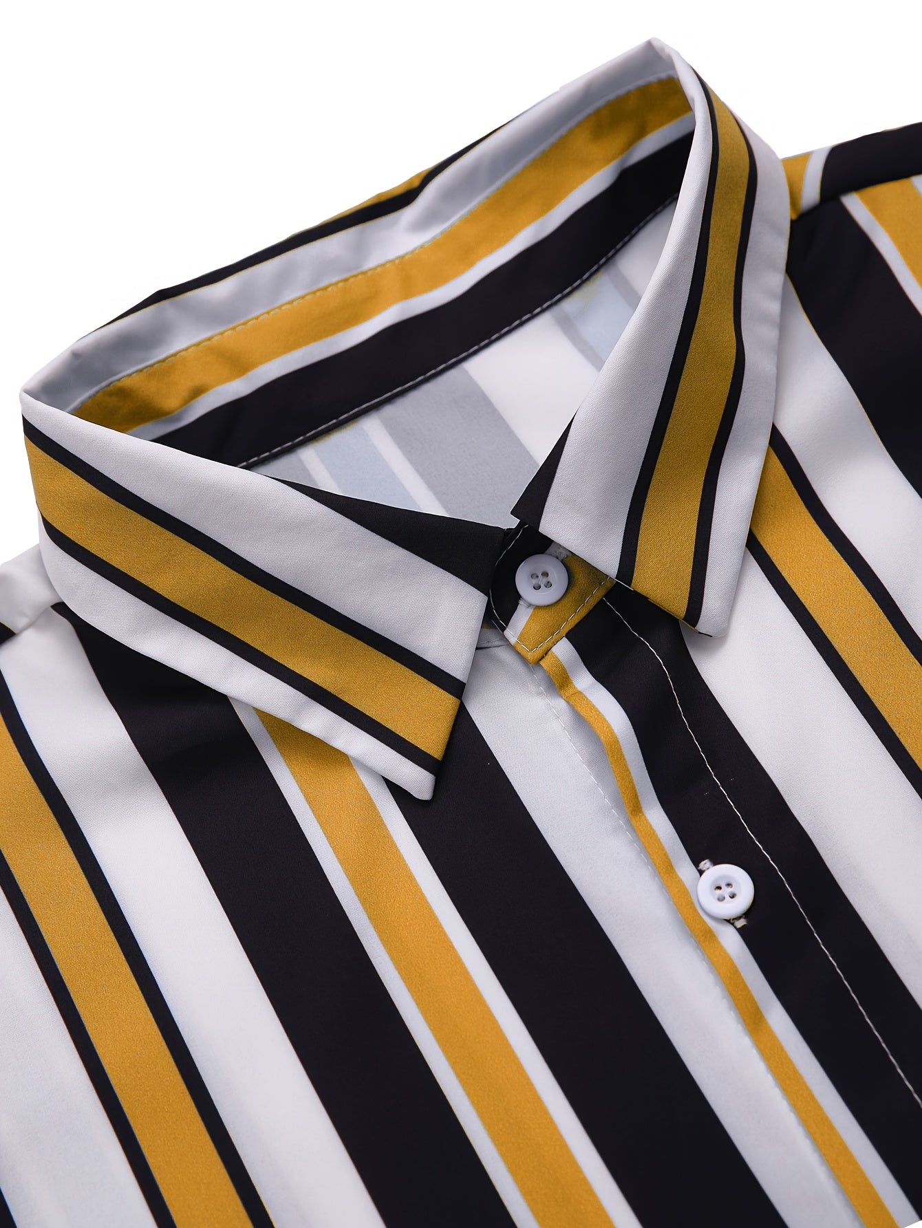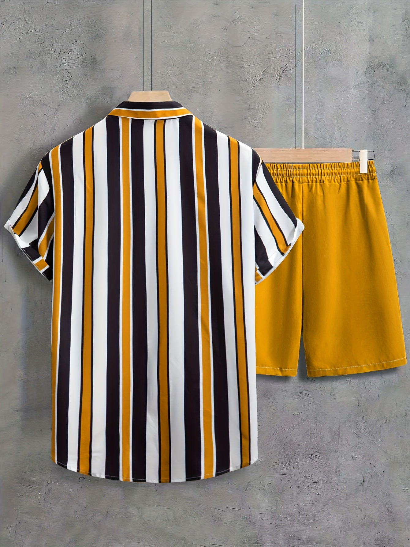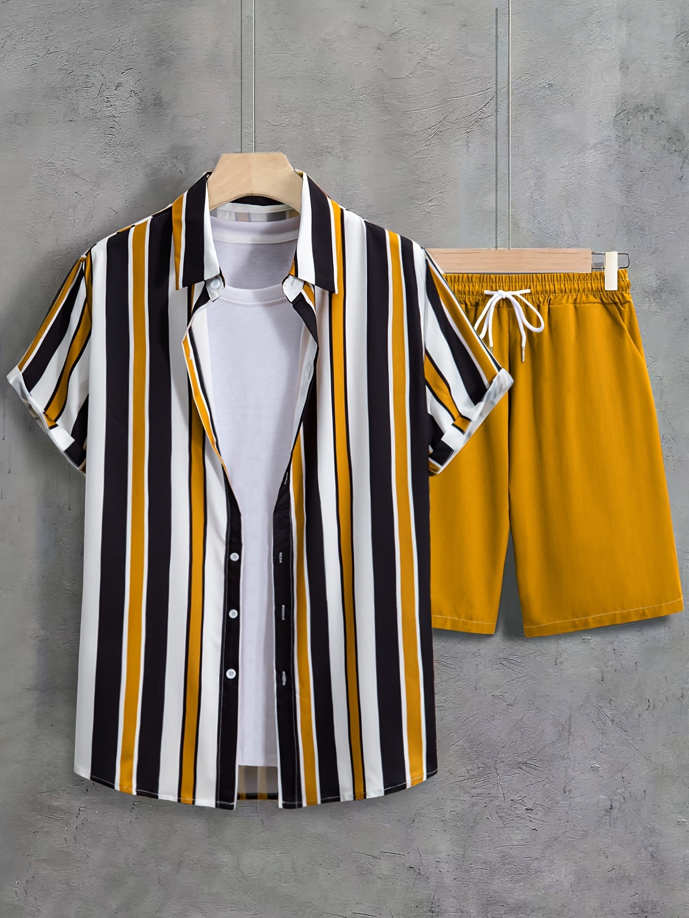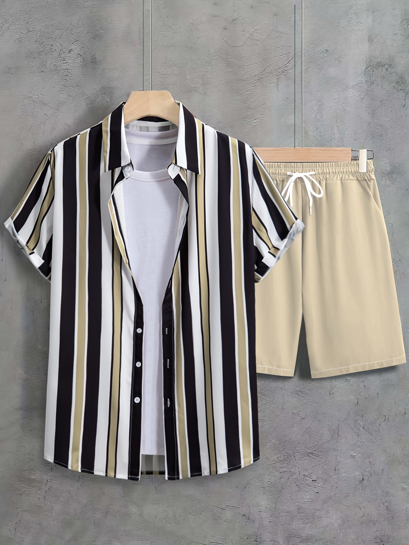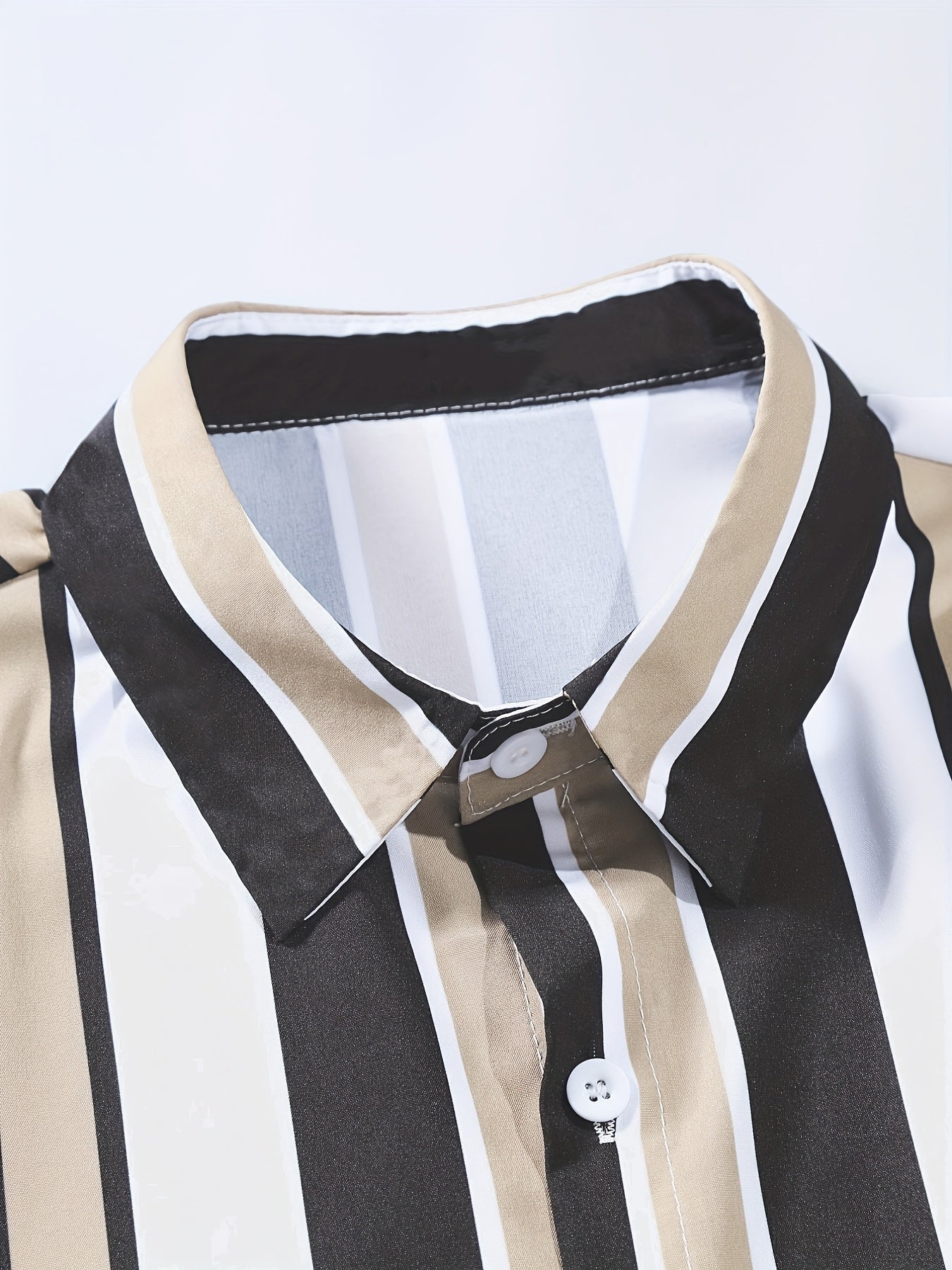 Տղամարդկանց սովորական գծավոր կոճակներով վերնաշապիկ և շորտեր սև, կանաչ և սպիտակ գույներով - թեթև պոլիեսթեր, լվացվող մեքենայում՝ բոլոր սեզոնների հարմարավետության համար