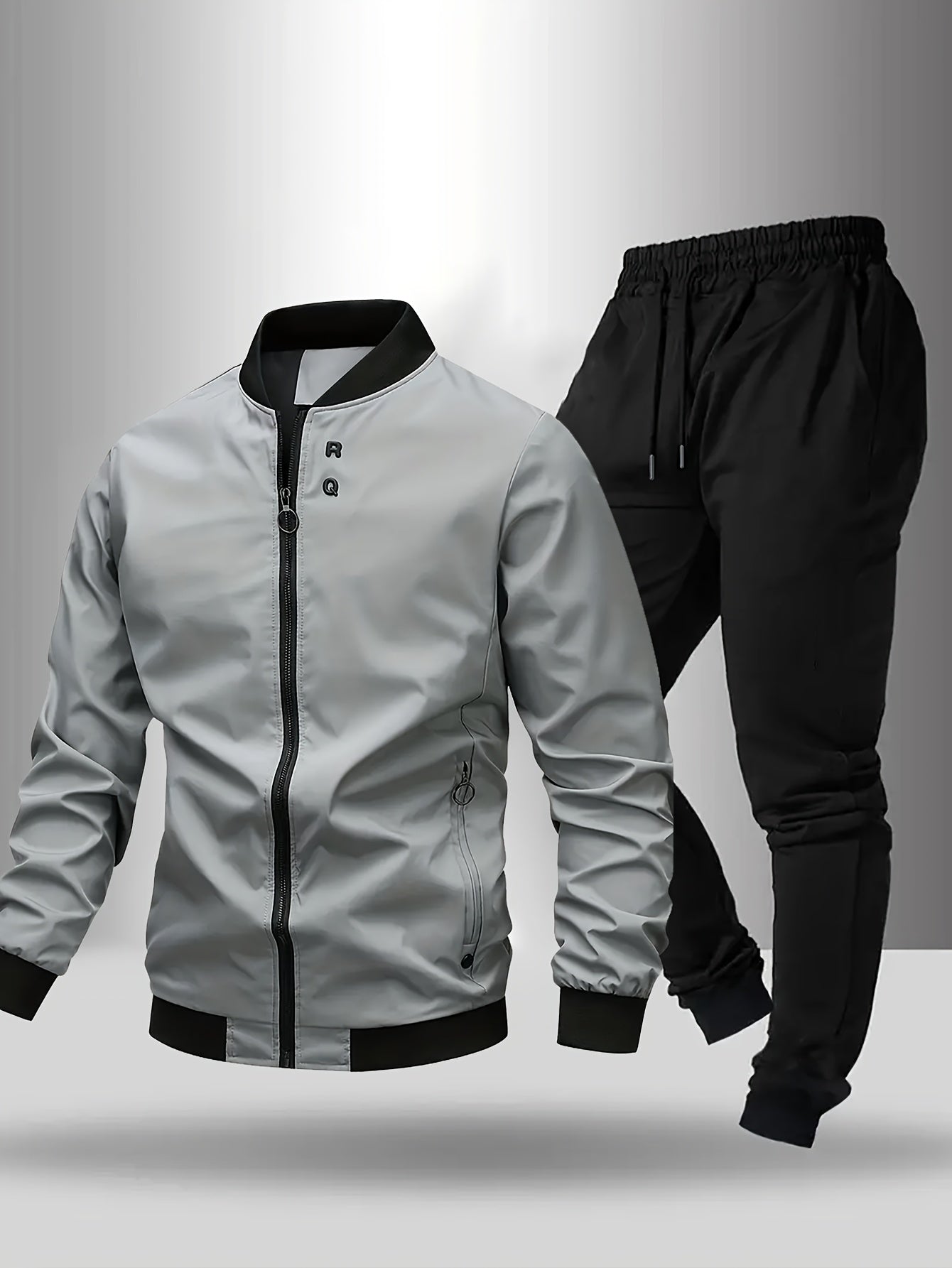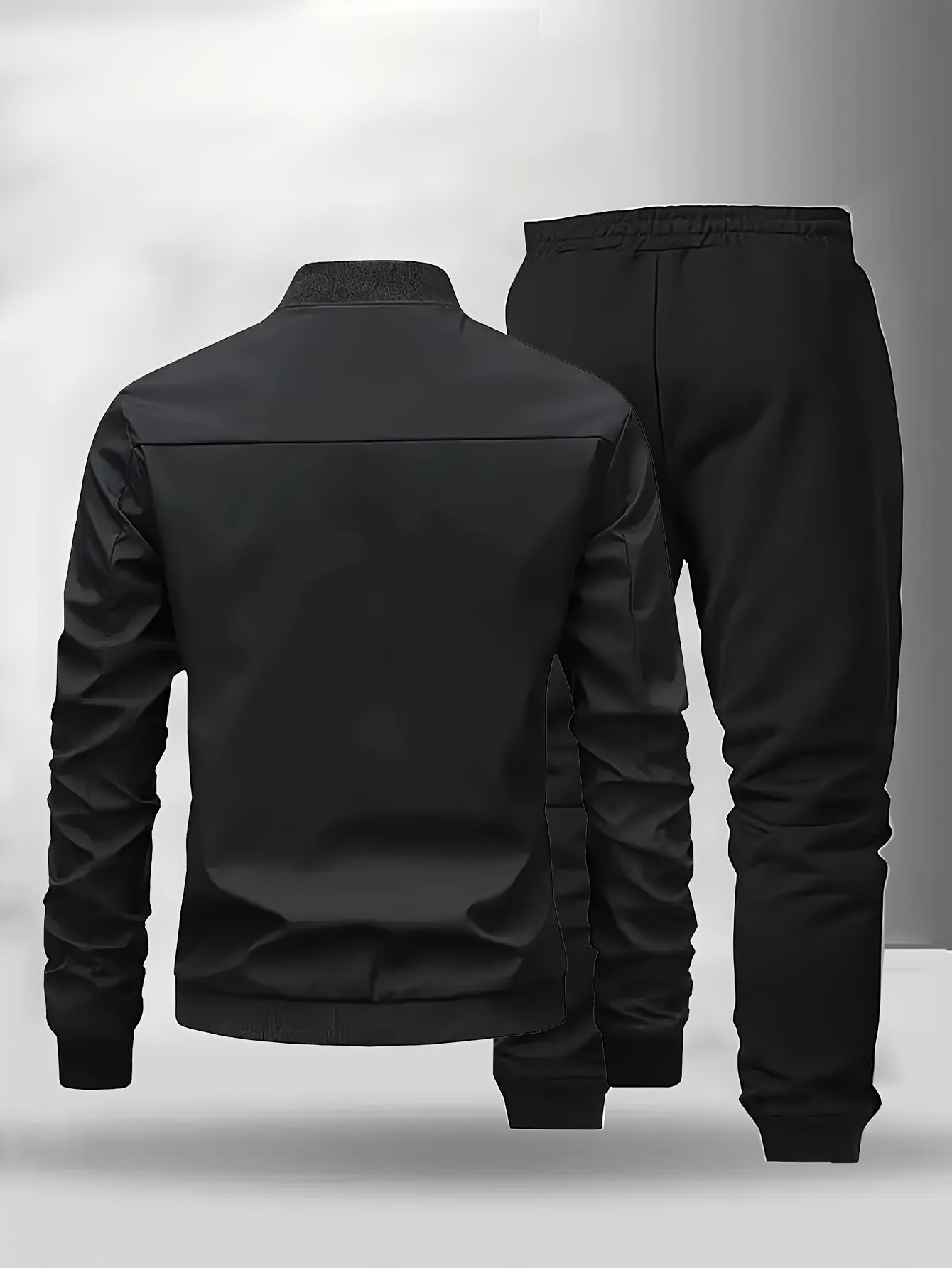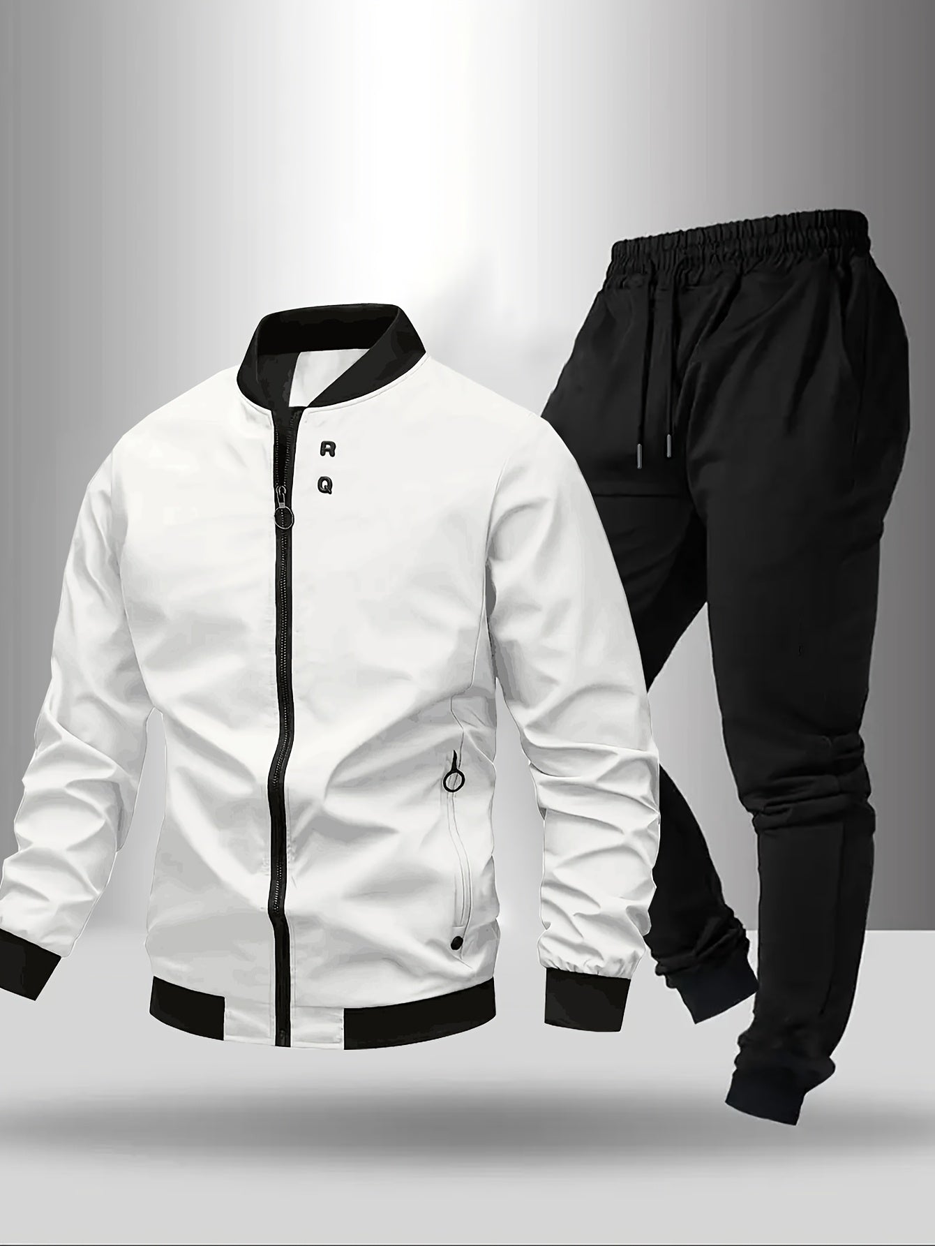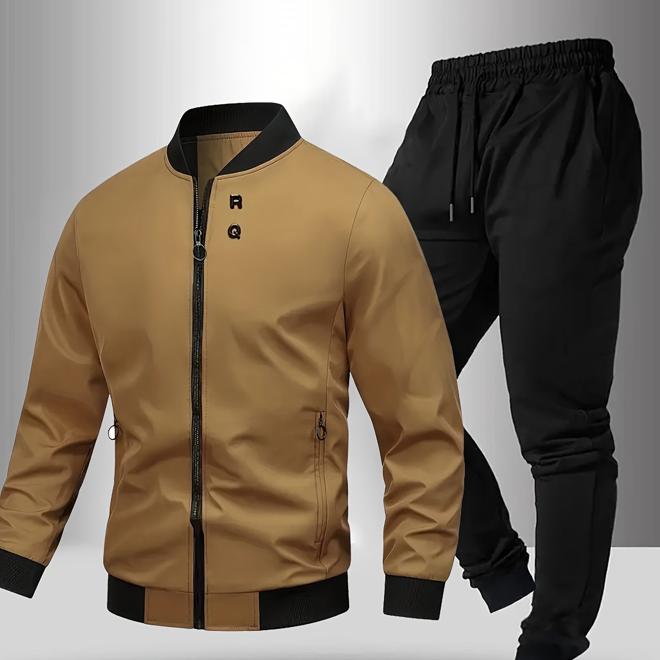 Տղամարդու ամենօրյա երկկտոր սպորտային հավաքածու՝ սև բեյսբոլի օձիքով բաճկոն՝ կայծակաճարմանդով, առաձգական գոտկատեղով տաբատ, սովորական չափսի՝ գարնանային/աշնանային սեզոնի համար, գարնանային վերնազգեստ | Սպորտային ամենօրյա հագուստ | կայծակաճարմանդով բաճկոն