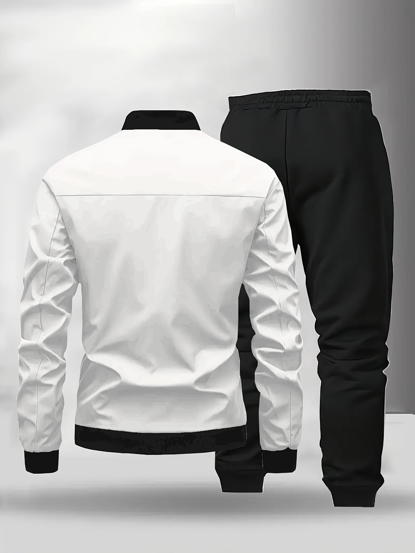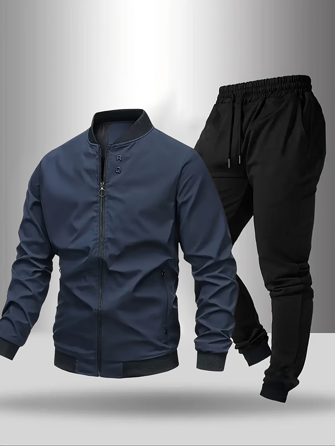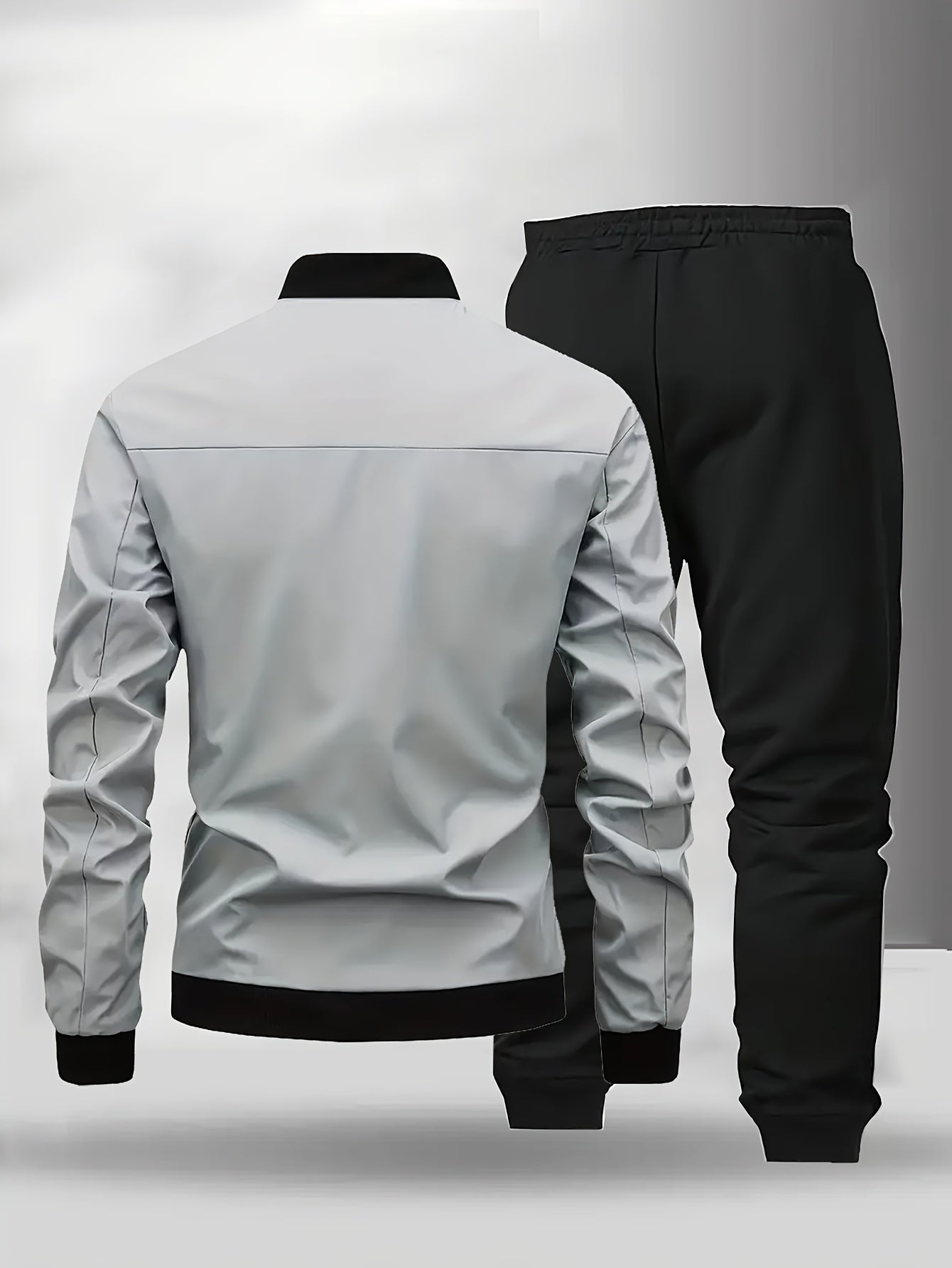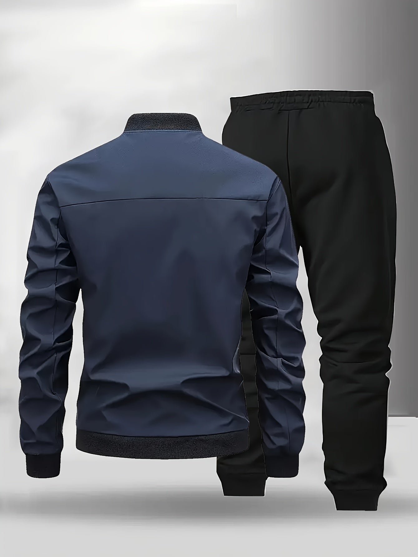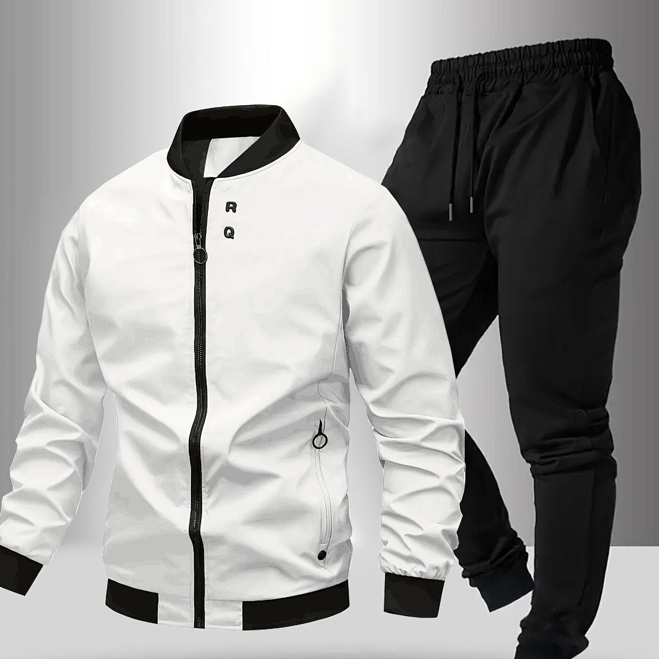 Տղամարդու ամենօրյա երկկտոր սպորտային հավաքածու՝ սև բեյսբոլի օձիքով բաճկոն՝ կայծակաճարմանդով, առաձգական գոտկատեղով տաբատ, սովորական չափսի՝ գարնանային/աշնանային սեզոնի համար, գարնանային վերնազգեստ | Սպորտային ամենօրյա հագուստ | կայծակաճարմանդով բաճկոն