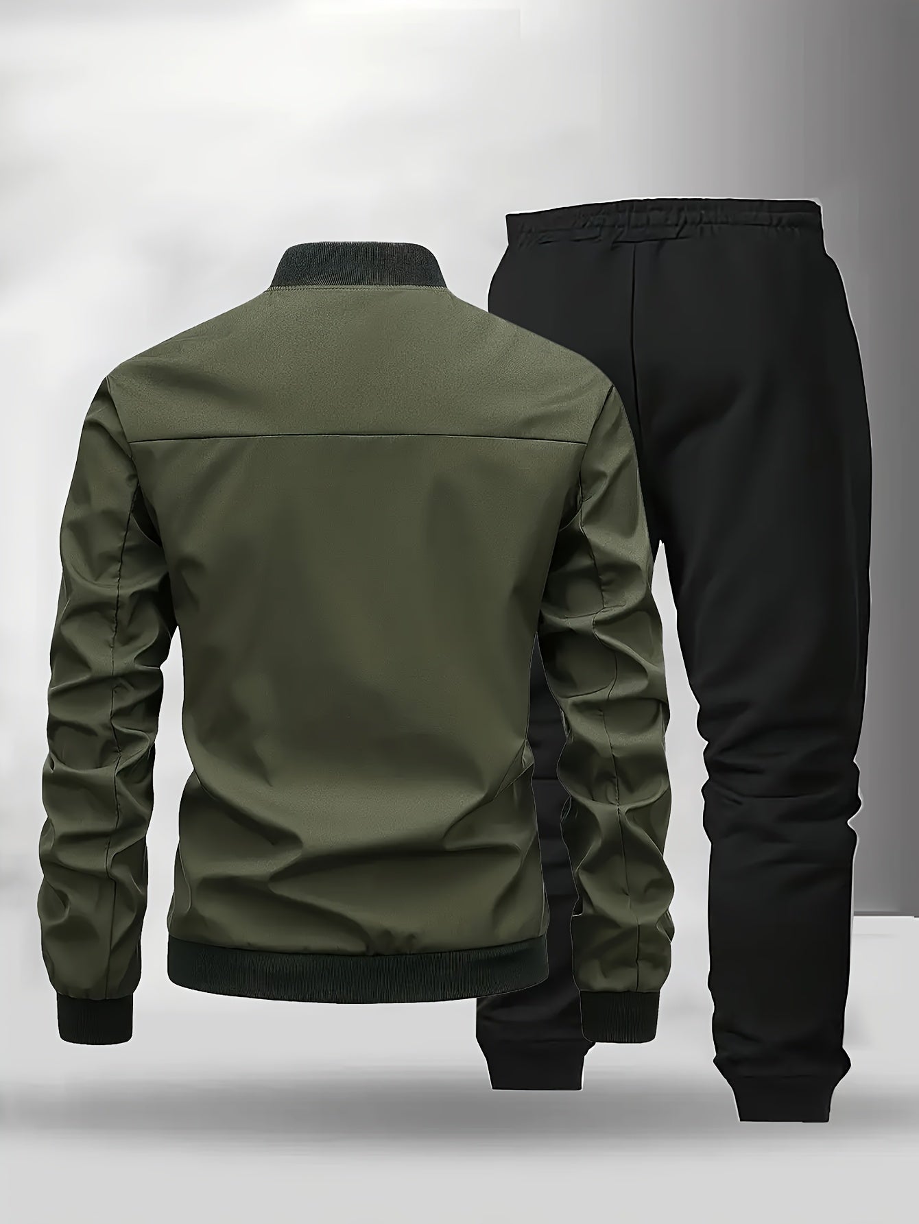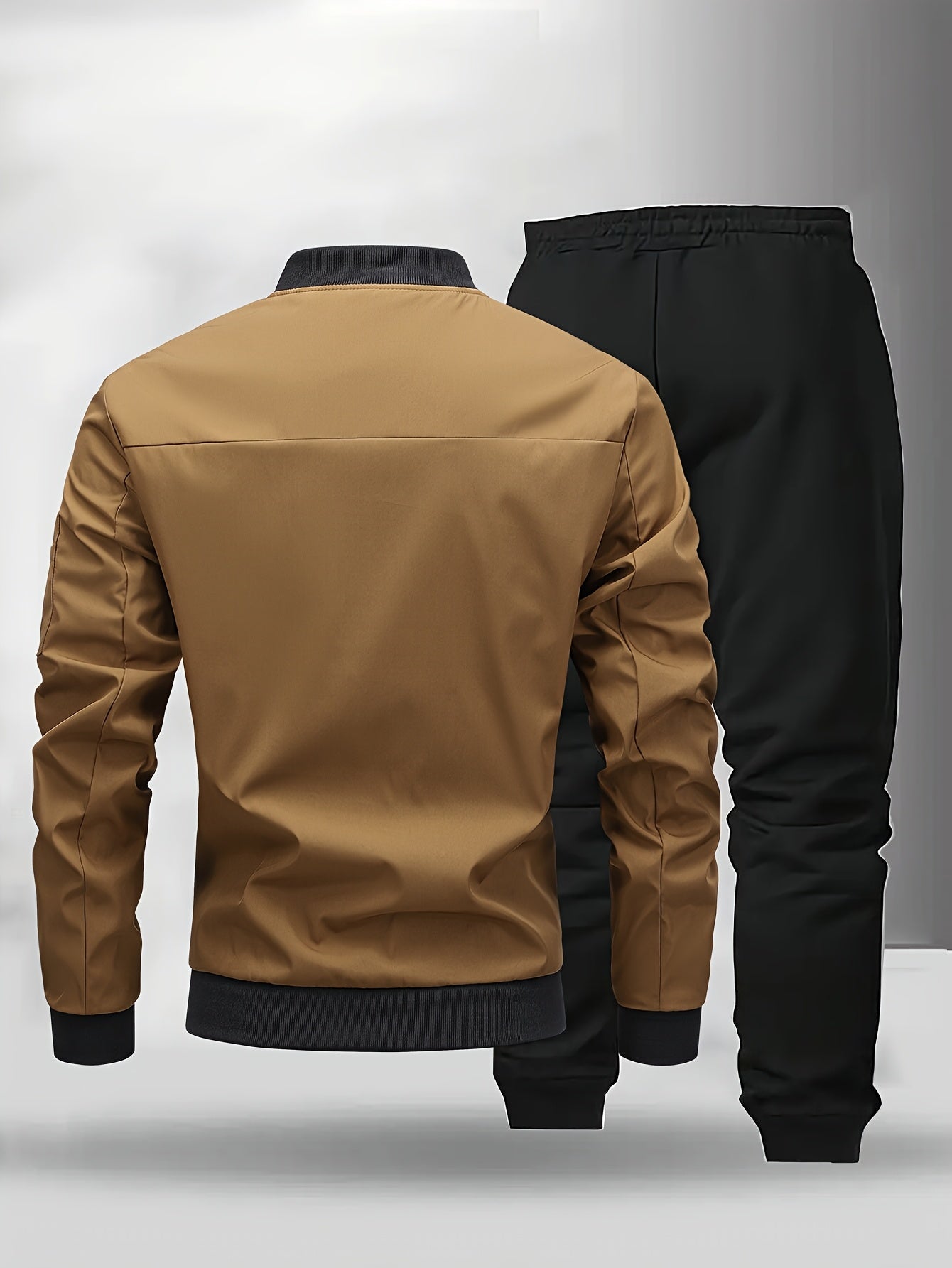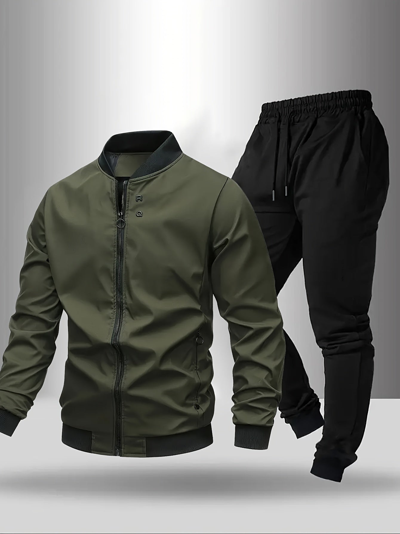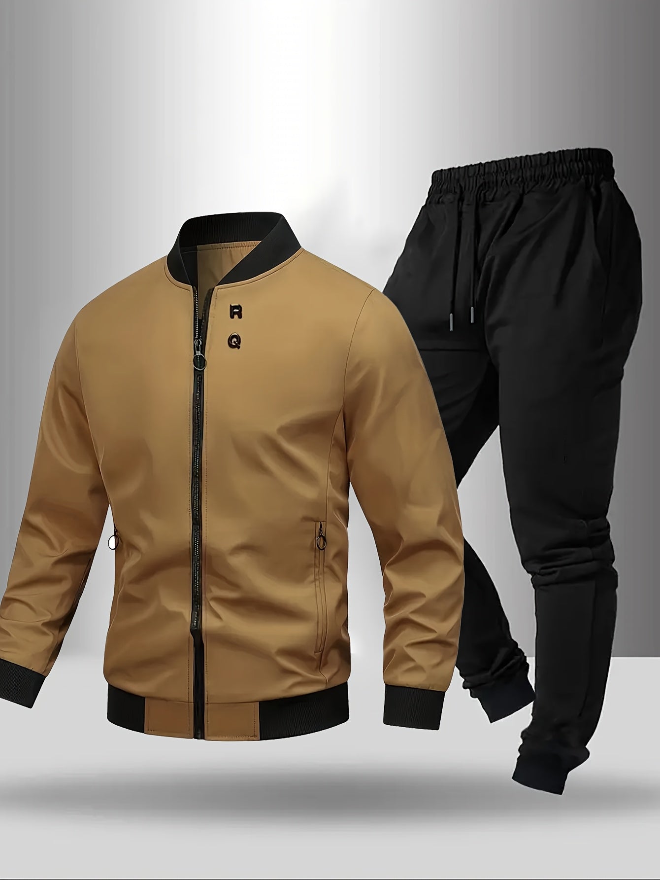 Տղամարդու ամենօրյա երկկտոր սպորտային հավաքածու՝ սև բեյսբոլի օձիքով բաճկոն՝ կայծակաճարմանդով, առաձգական գոտկատեղով տաբատ, սովորական չափսի՝ գարնանային/աշնանային սեզոնի համար, գարնանային վերնազգեստ | Սպորտային ամենօրյա հագուստ | կայծակաճարմանդով բաճկոն