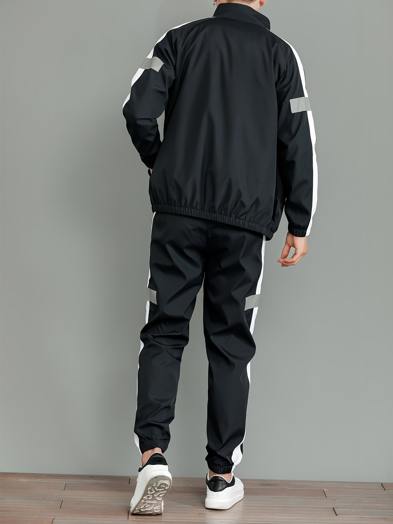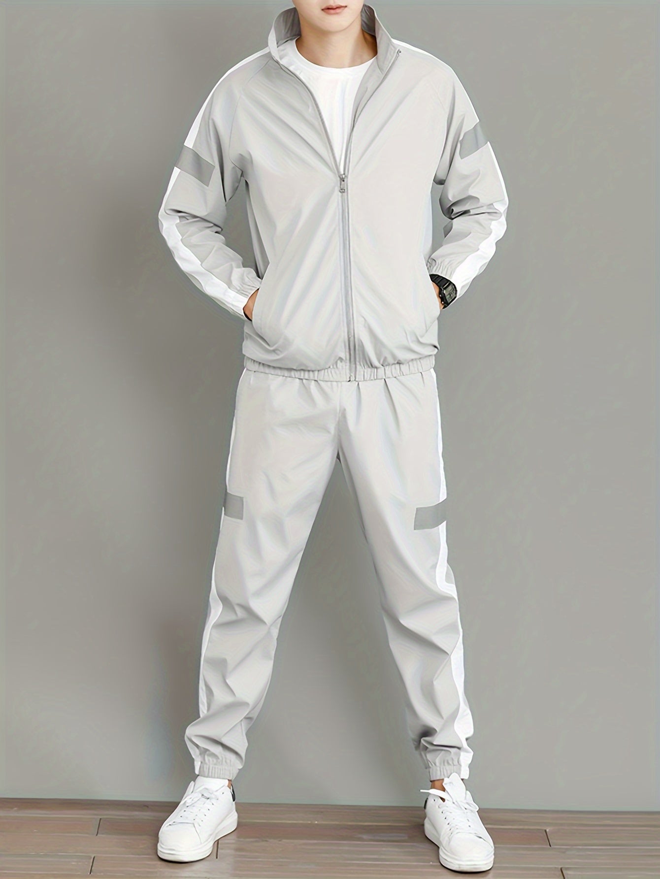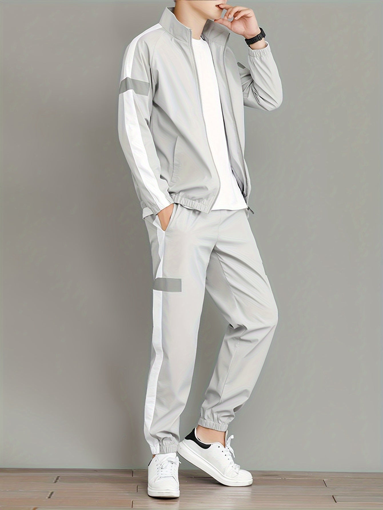 Տղամարդկանց պատահական երկկտոր հավաքածու գարնան և աշնան համար, որն ունի նորաձև բաճկոն և լայն պիտանի տաբատ, որը կատարյալ է վազքի և սպորտի համար: