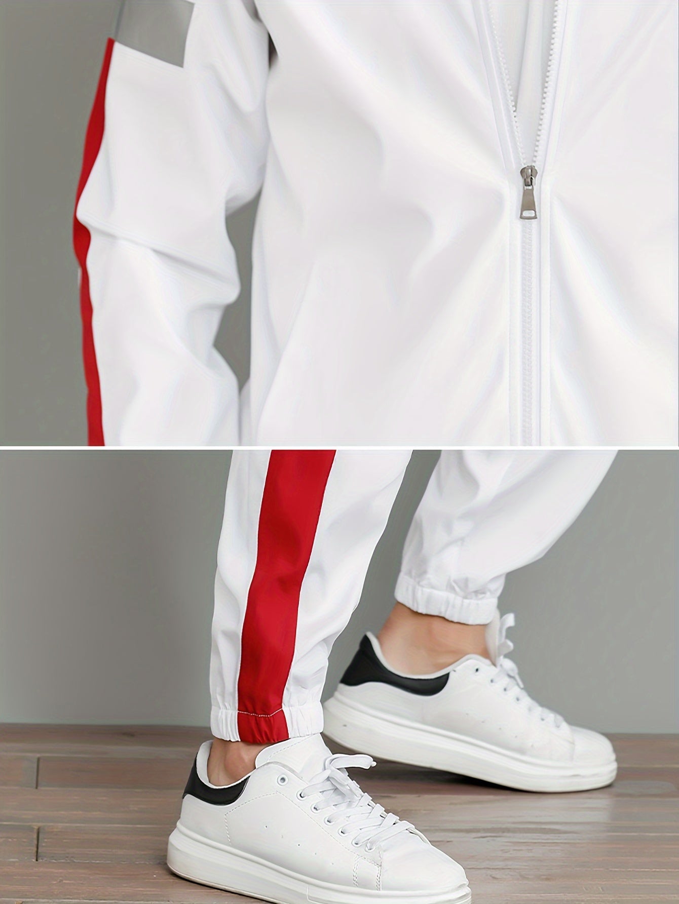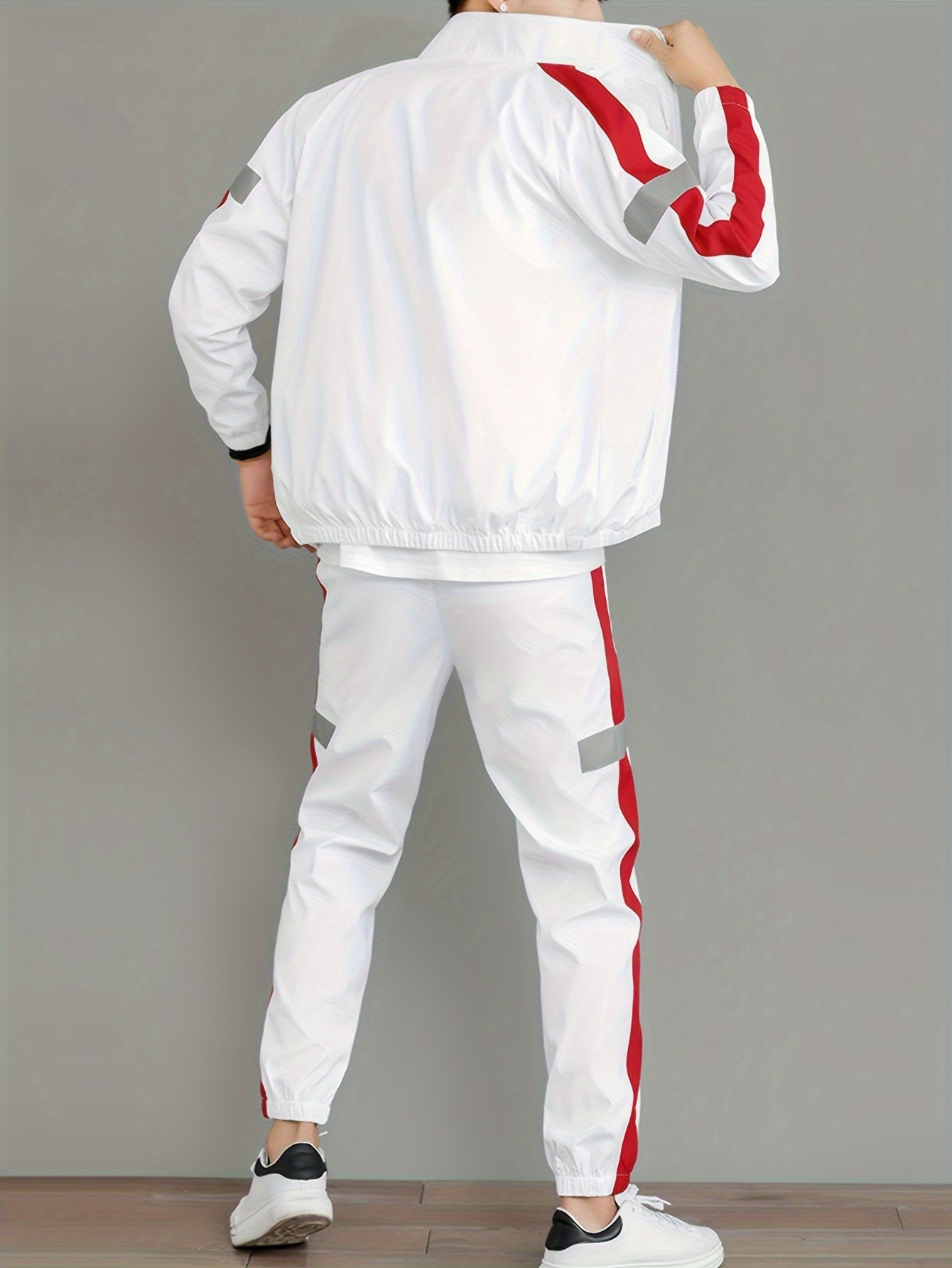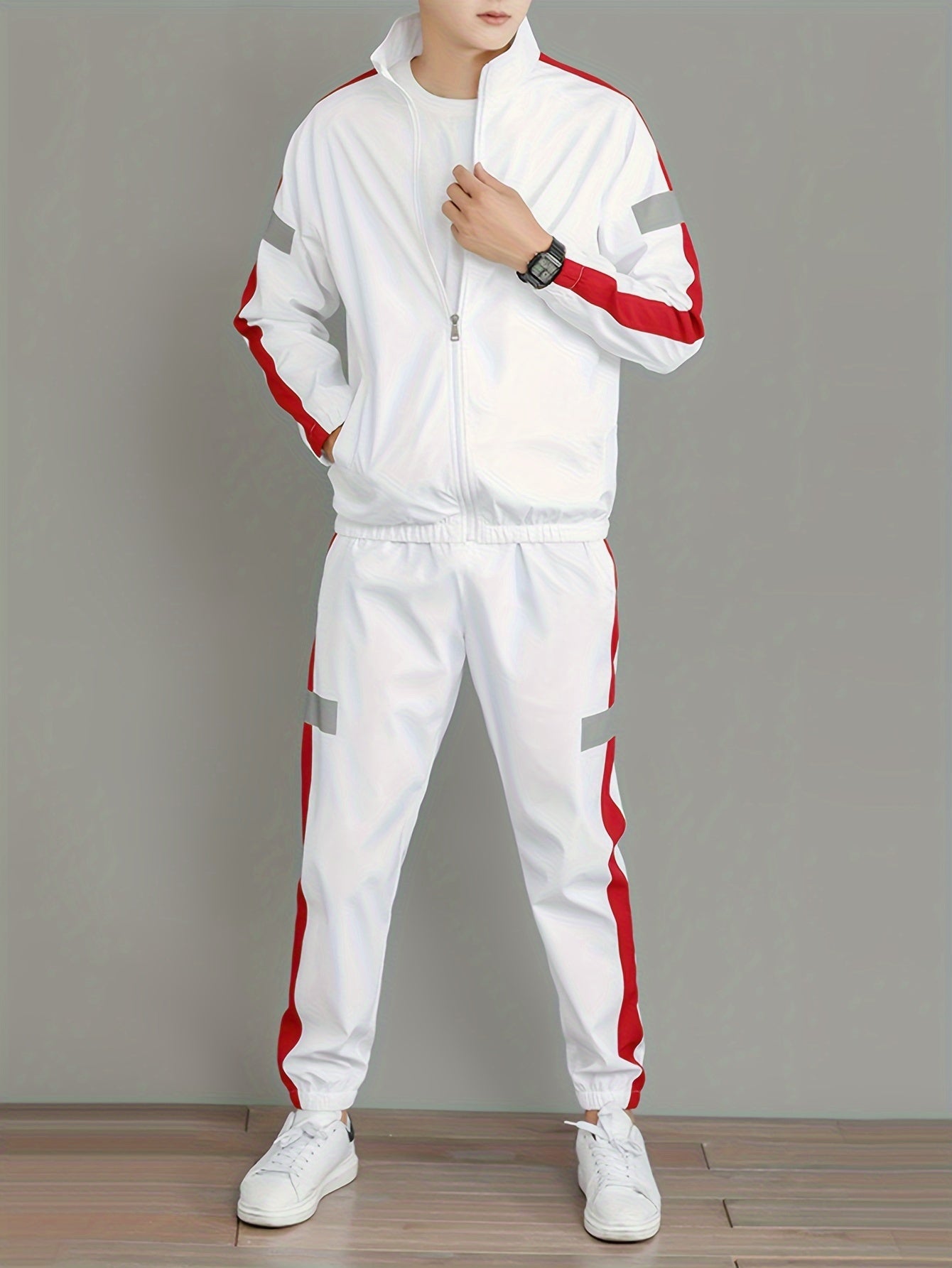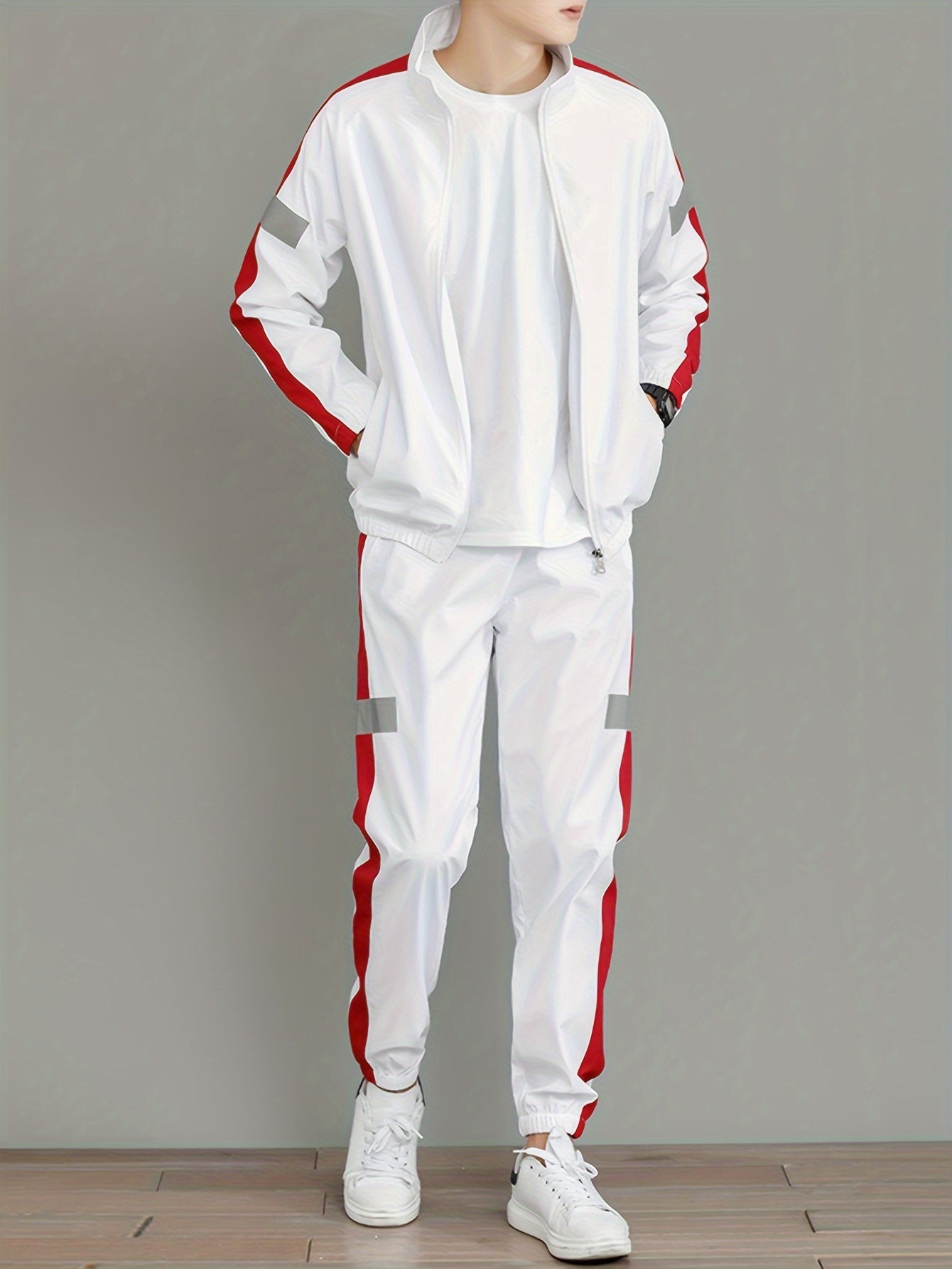 Տղամարդկանց պատահական երկկտոր հավաքածու գարնան և աշնան համար, որն ունի նորաձև բաճկոն և լայն պիտանի տաբատ, որը կատարյալ է վազքի և սպորտի համար: