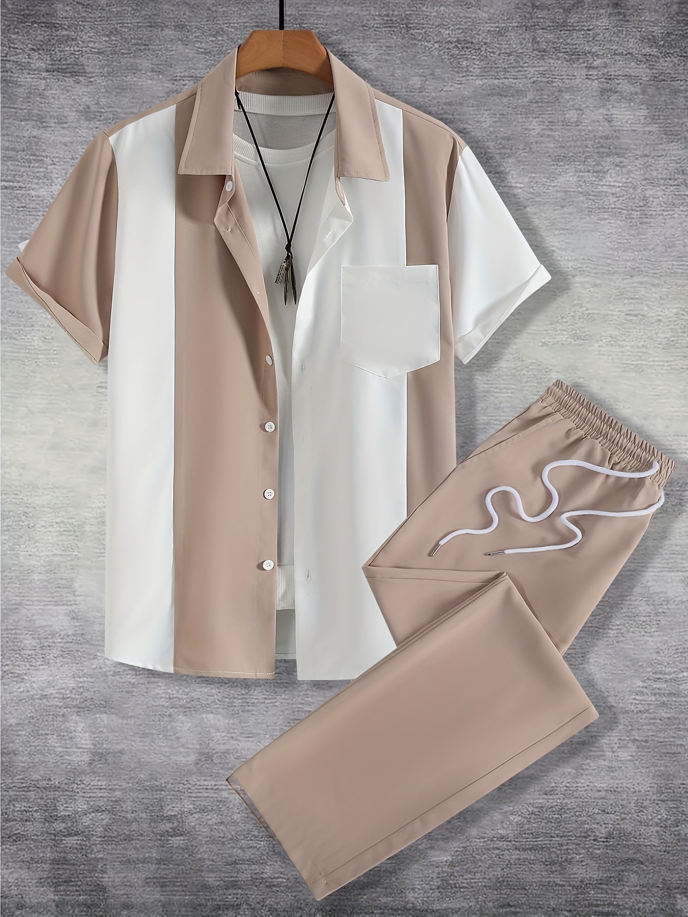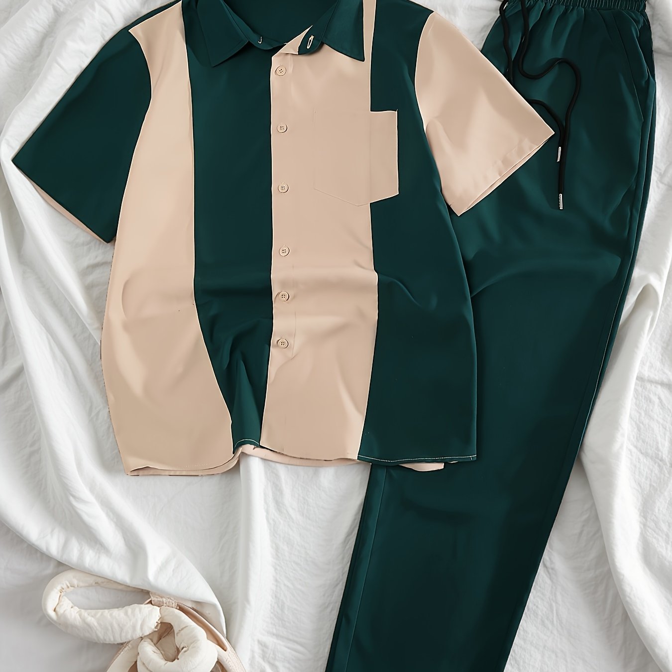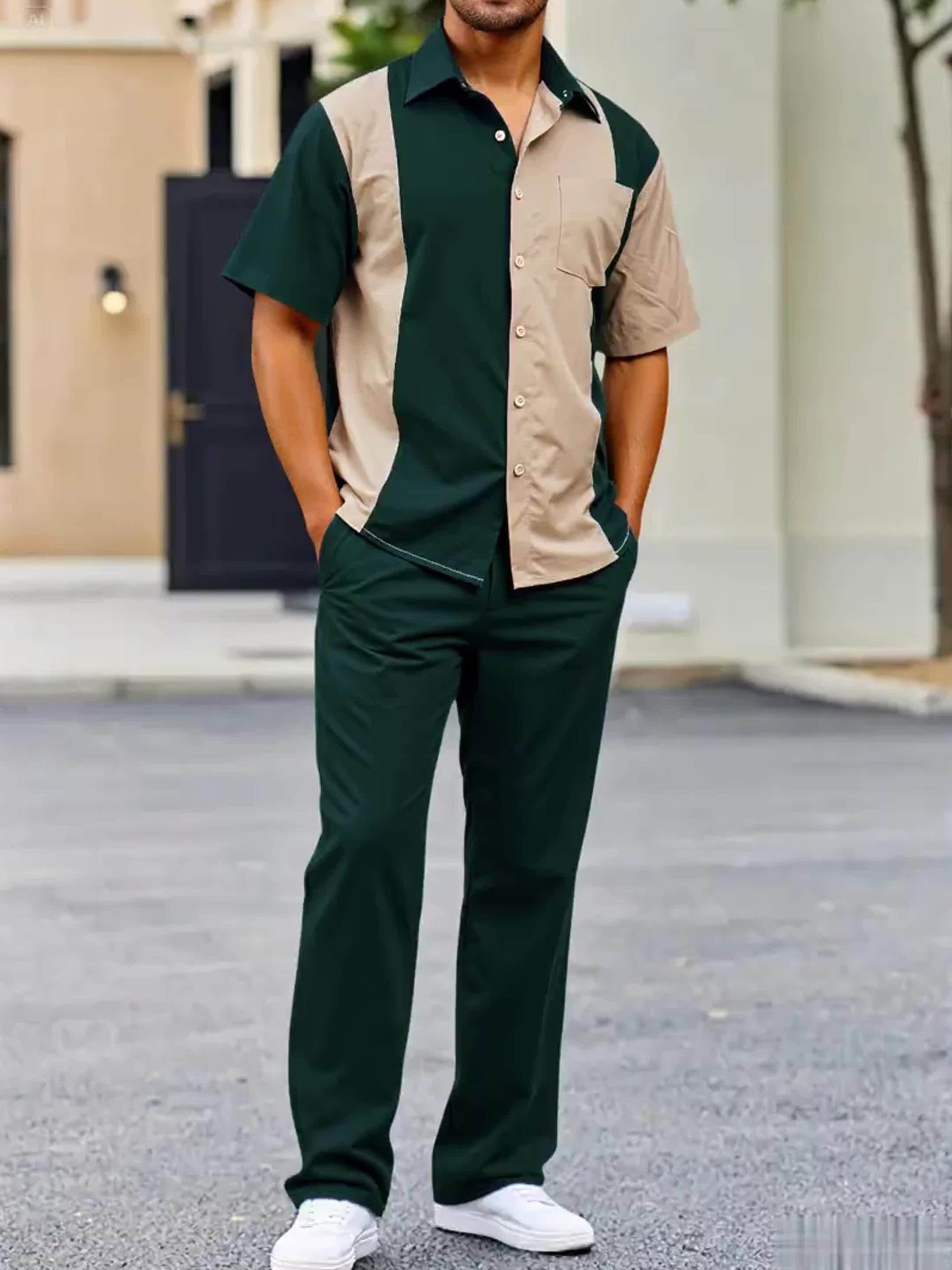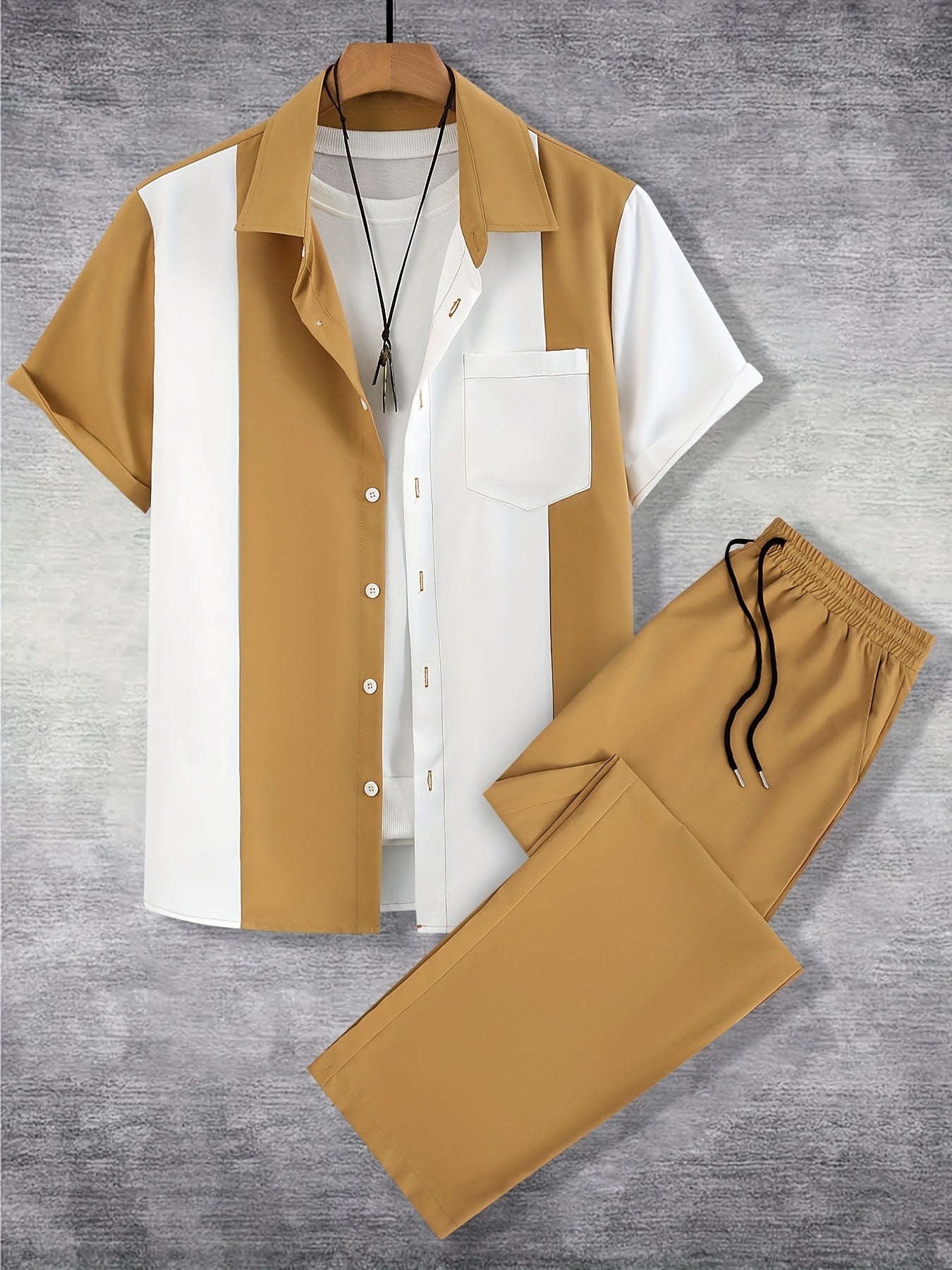 Տղամարդու գարուն/ամառային կարճ թևքերով երկկտորանոց կարճ վերնաշապիկի և տաբատի հավաքածու՝ պոլիեսթերային, սովորական չափսի, կոճակներով և գրպանով, առանց գոտու, բոլոր եղանակների համար, ամենօրյա հագուստ | ամենօրյա ոճ | պոլիեսթերային գործվածք