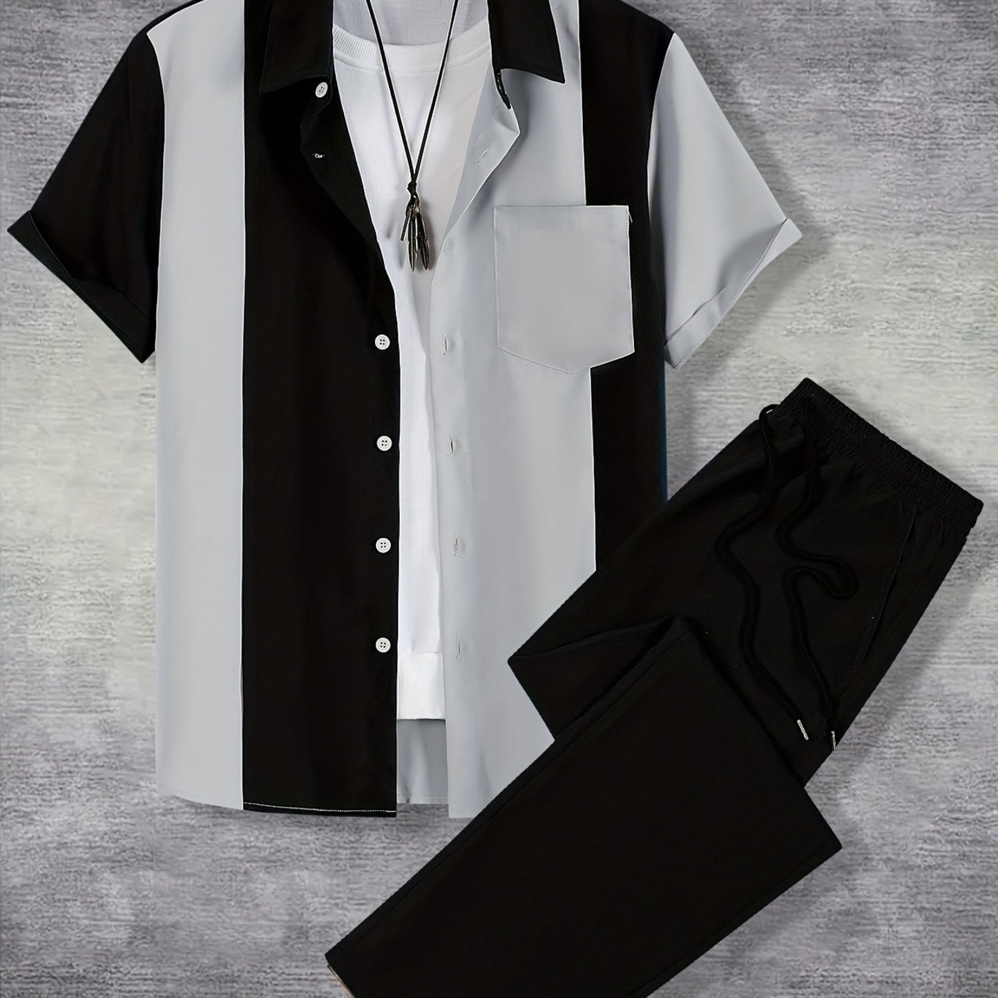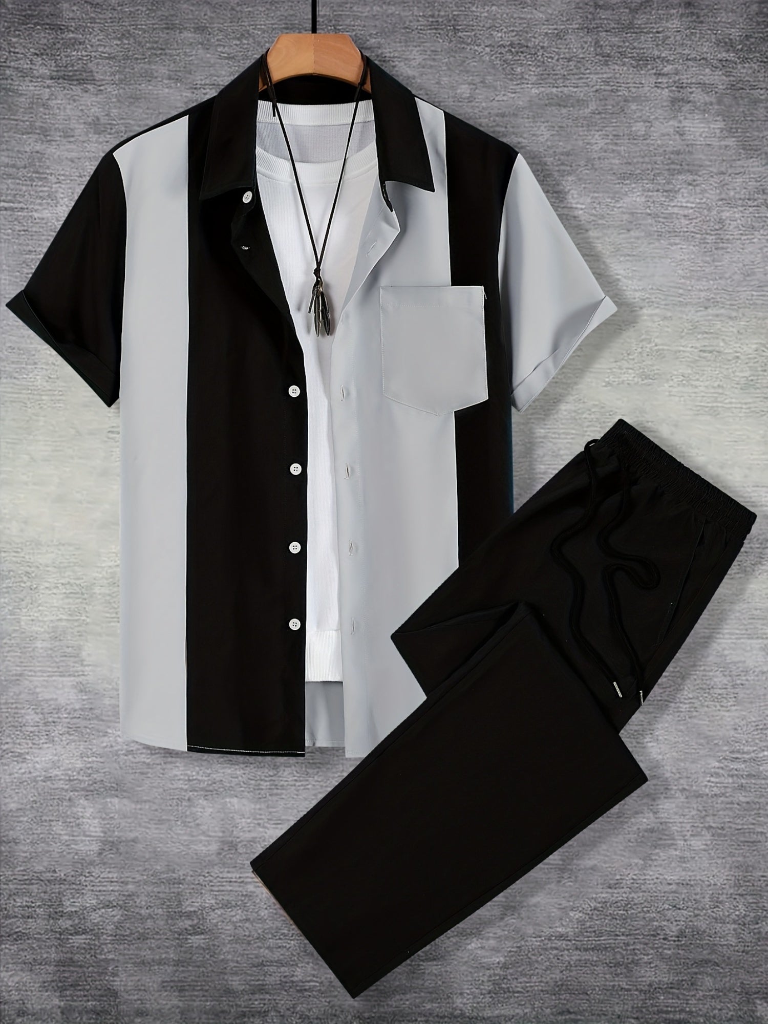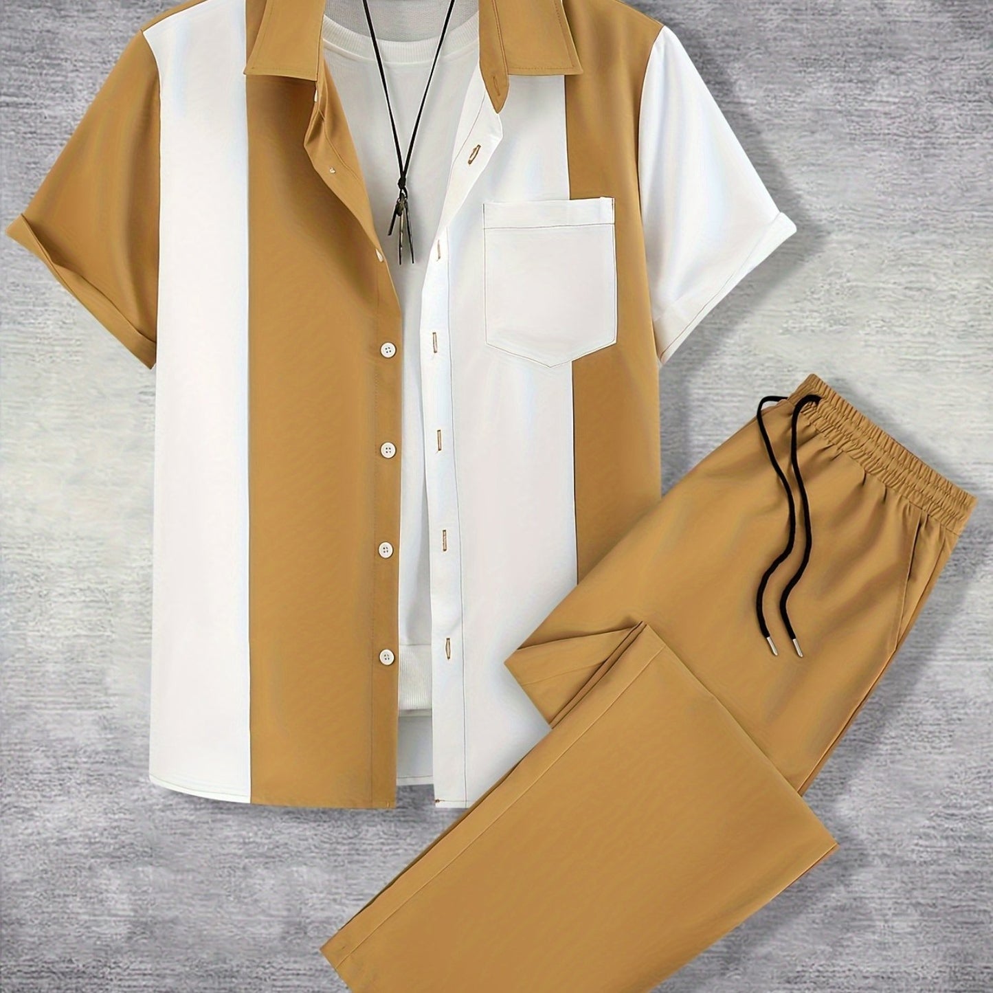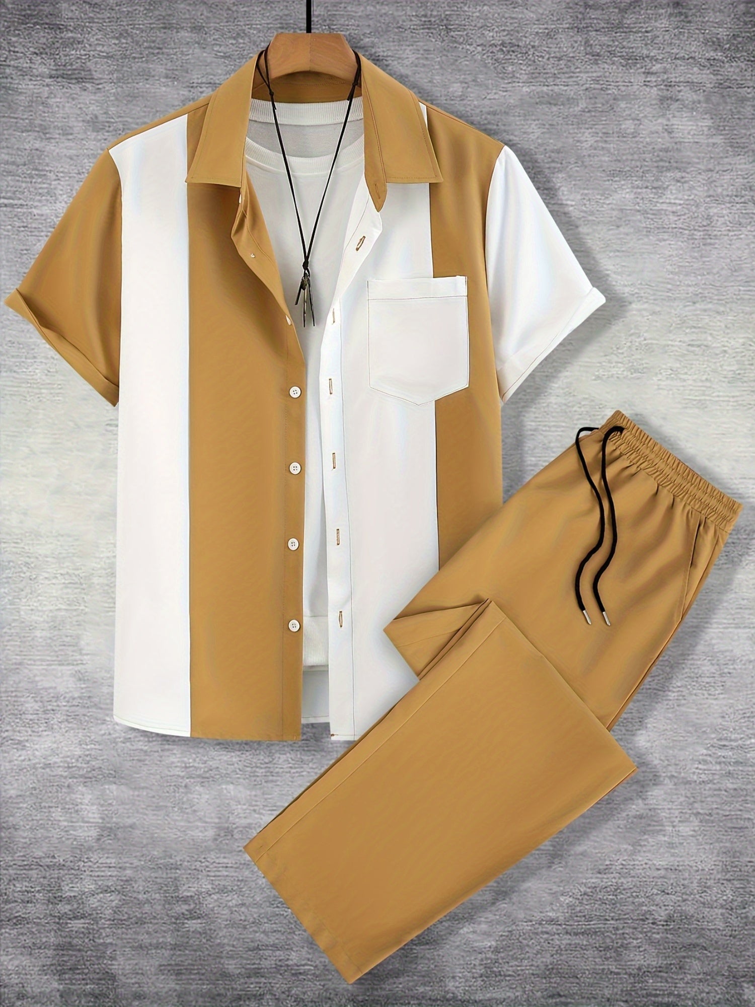 Տղամարդու գարուն/ամառային կարճ թևքերով երկկտորանոց կարճ վերնաշապիկի և տաբատի հավաքածու՝ պոլիեսթերային, սովորական չափսի, կոճակներով և գրպանով, առանց գոտու, բոլոր եղանակների համար, ամենօրյա հագուստ | ամենօրյա ոճ | պոլիեսթերային գործվածք