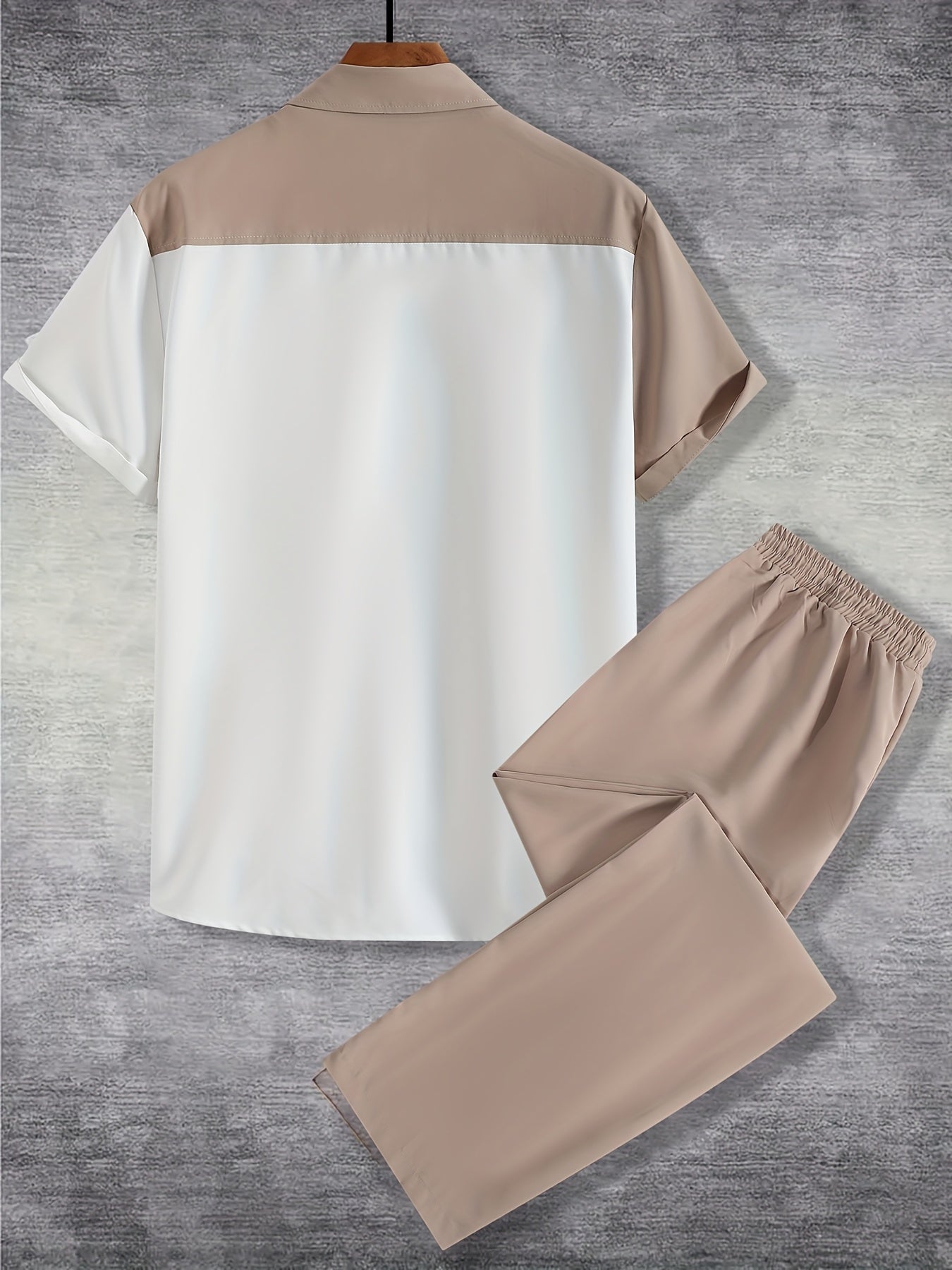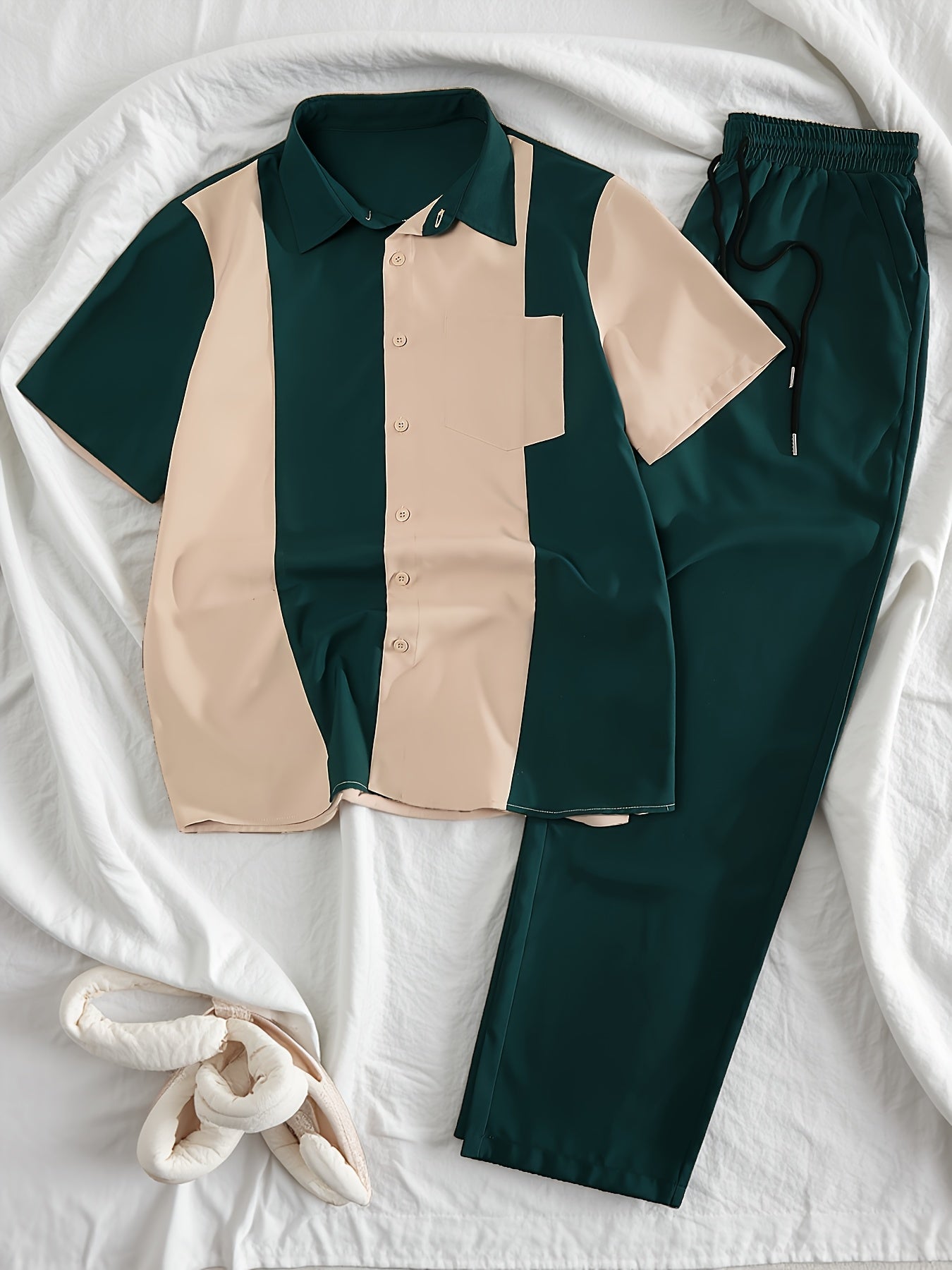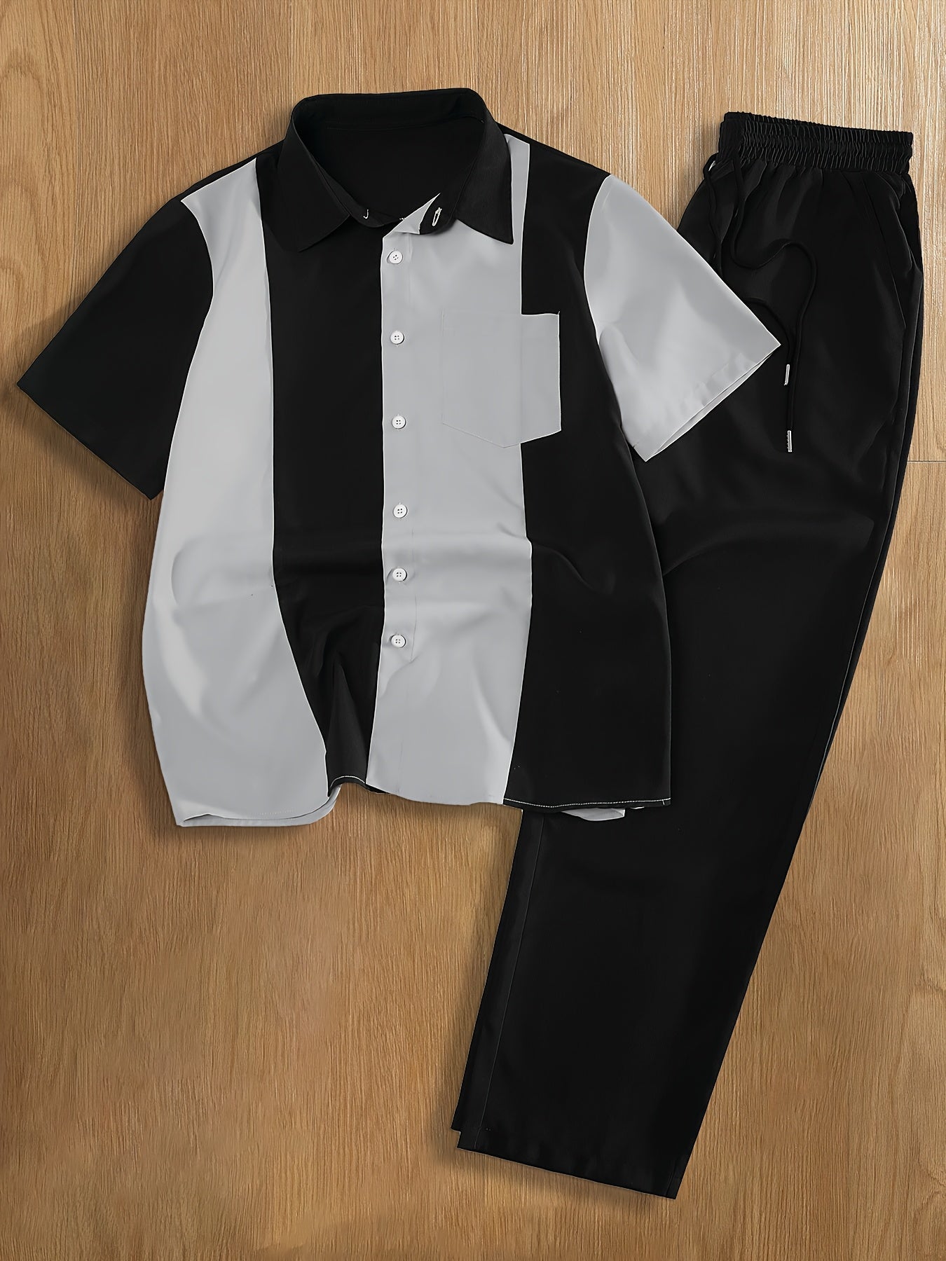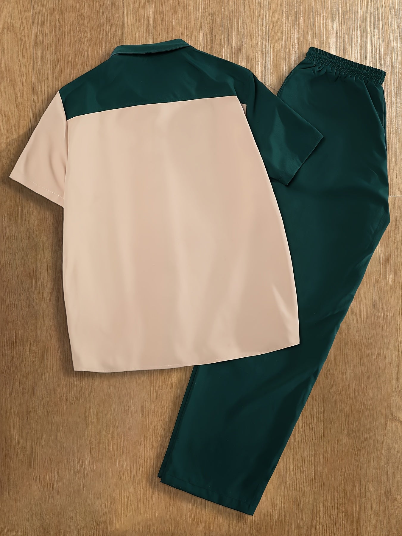 Տղամարդու գարուն/ամառային կարճ թևքերով երկկտորանոց կարճ վերնաշապիկի և տաբատի հավաքածու՝ պոլիեսթերային, սովորական չափսի, կոճակներով և գրպանով, առանց գոտու, բոլոր եղանակների համար, ամենօրյա հագուստ | ամենօրյա ոճ | պոլիեսթերային գործվածք