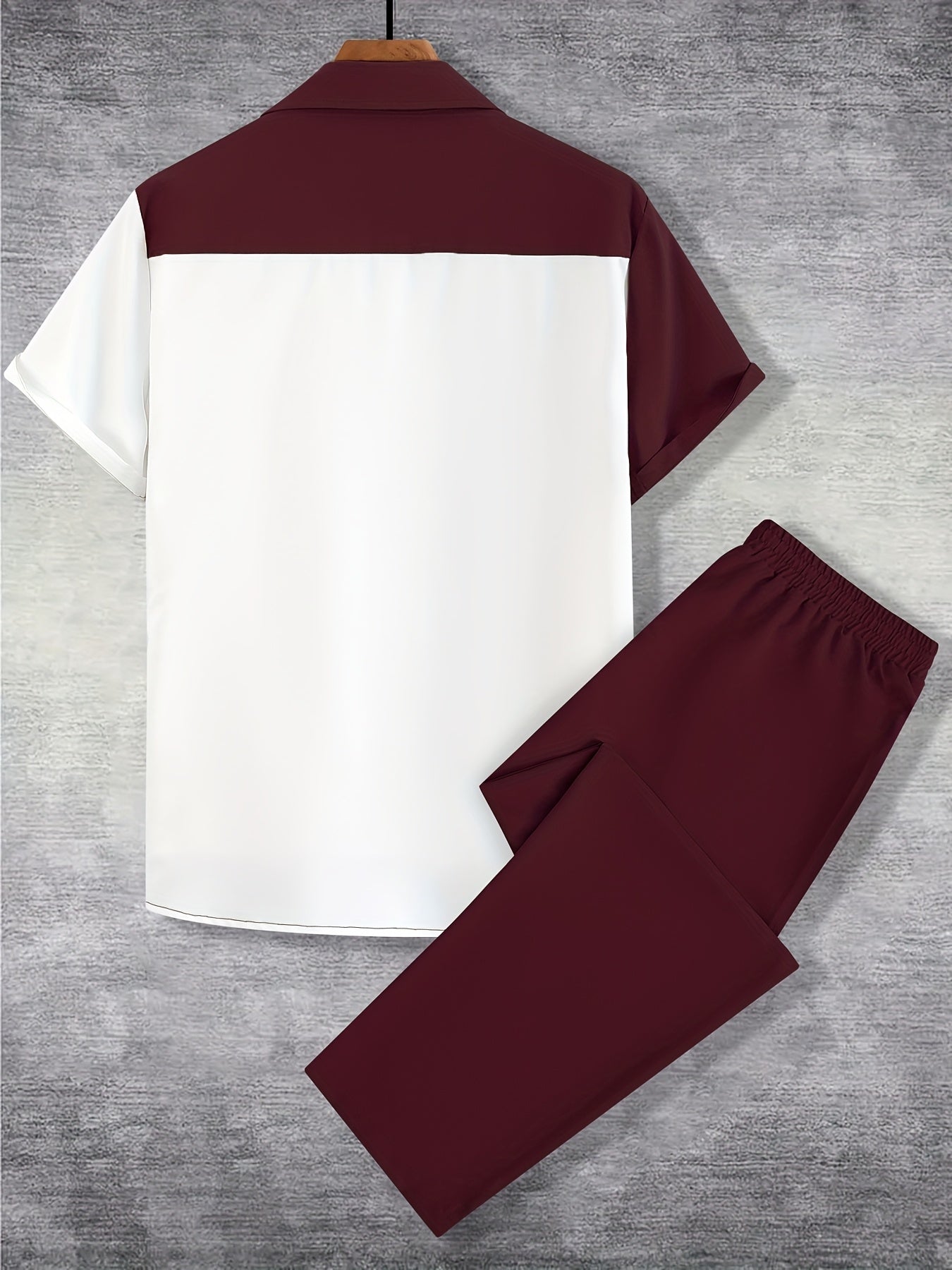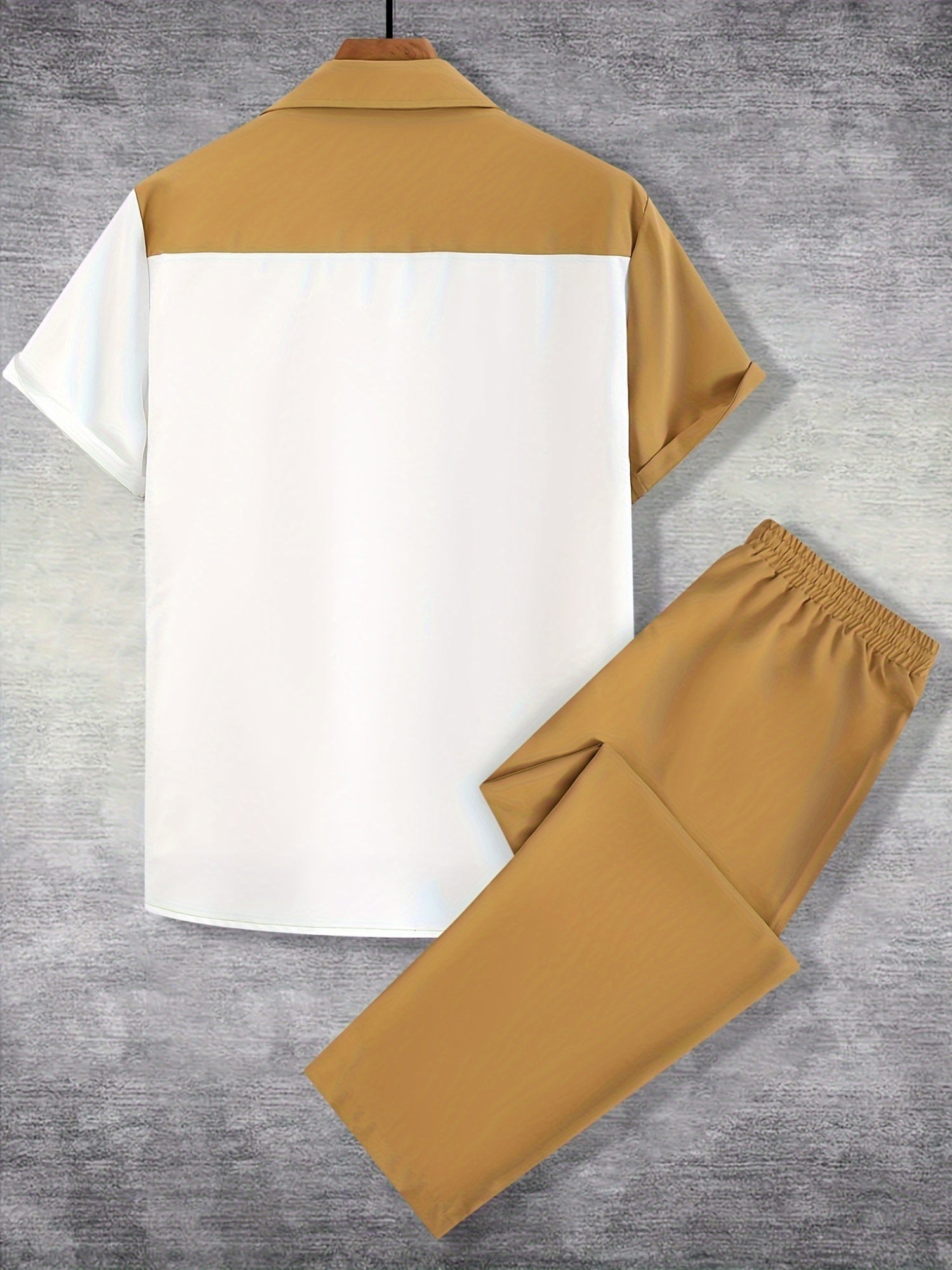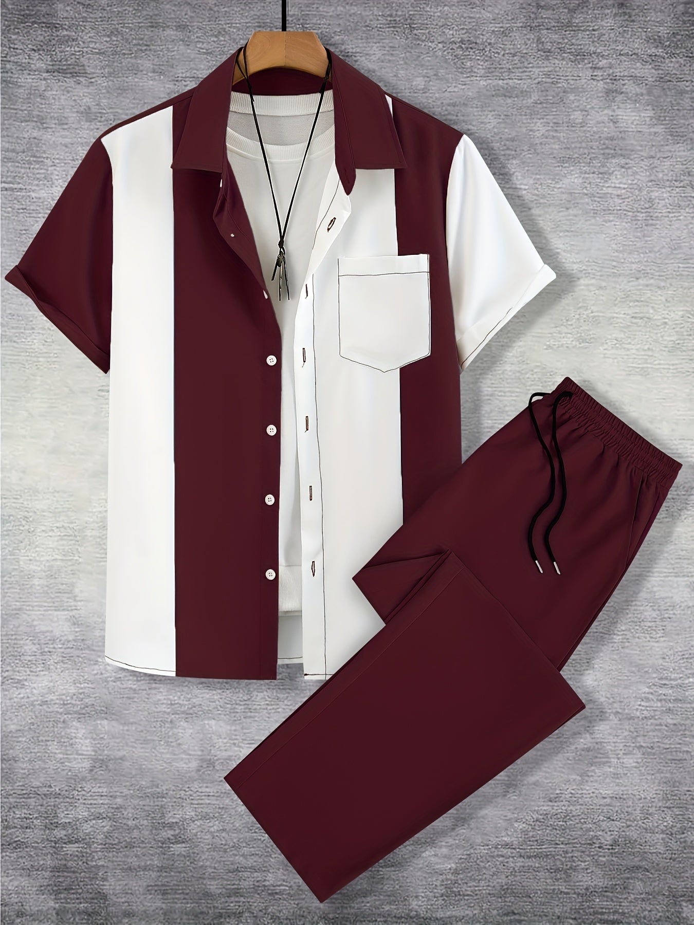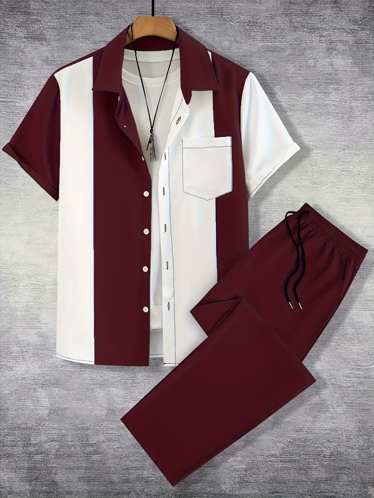 Տղամարդու գարուն/ամառային կարճ թևքերով երկկտորանոց կարճ վերնաշապիկի և տաբատի հավաքածու՝ պոլիեսթերային, սովորական չափսի, կոճակներով և գրպանով, առանց գոտու, բոլոր եղանակների համար, ամենօրյա հագուստ | ամենօրյա ոճ | պոլիեսթերային գործվածք