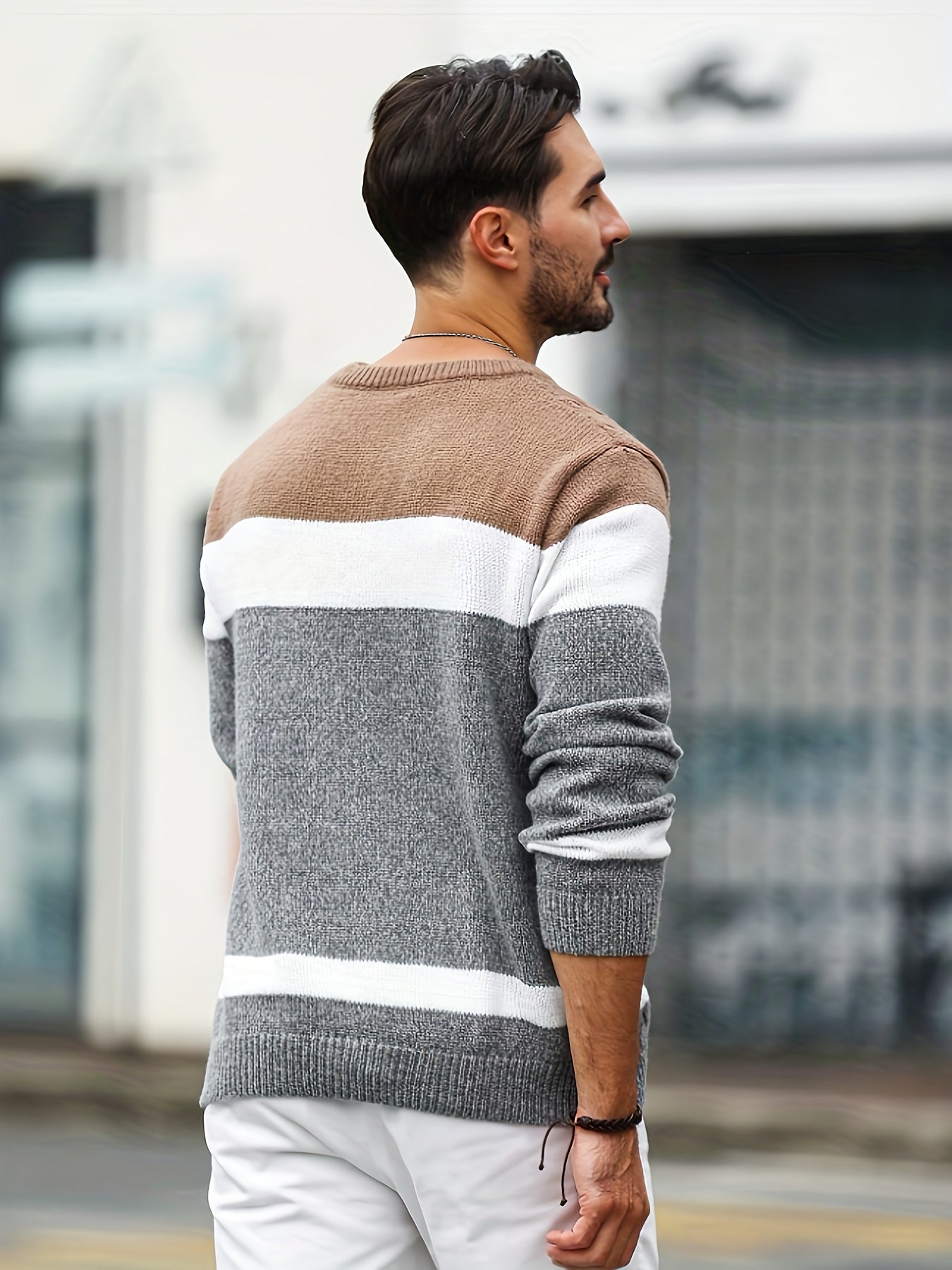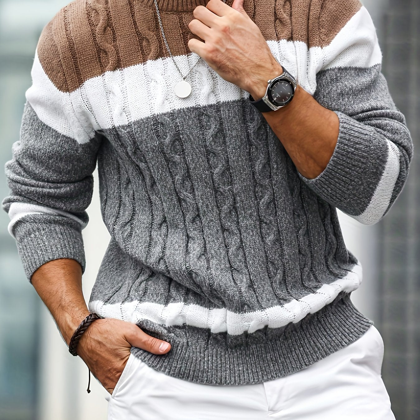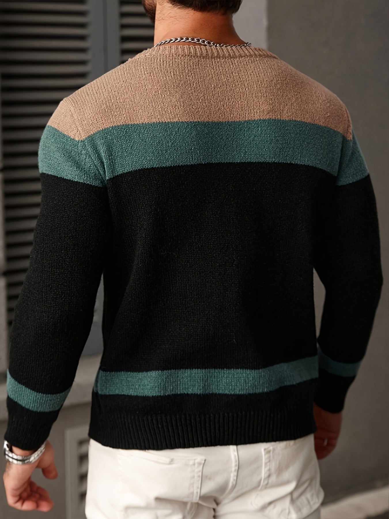 Տղամարդու գունավոր թվիդից տրիկոտաժե սվիտեր, կլոր օձիքով, երկար թևքերով, գունավոր տրիկոտաժե, բաց մոխրագույն՝ գործնական և առօրյա զբոսանքների համար