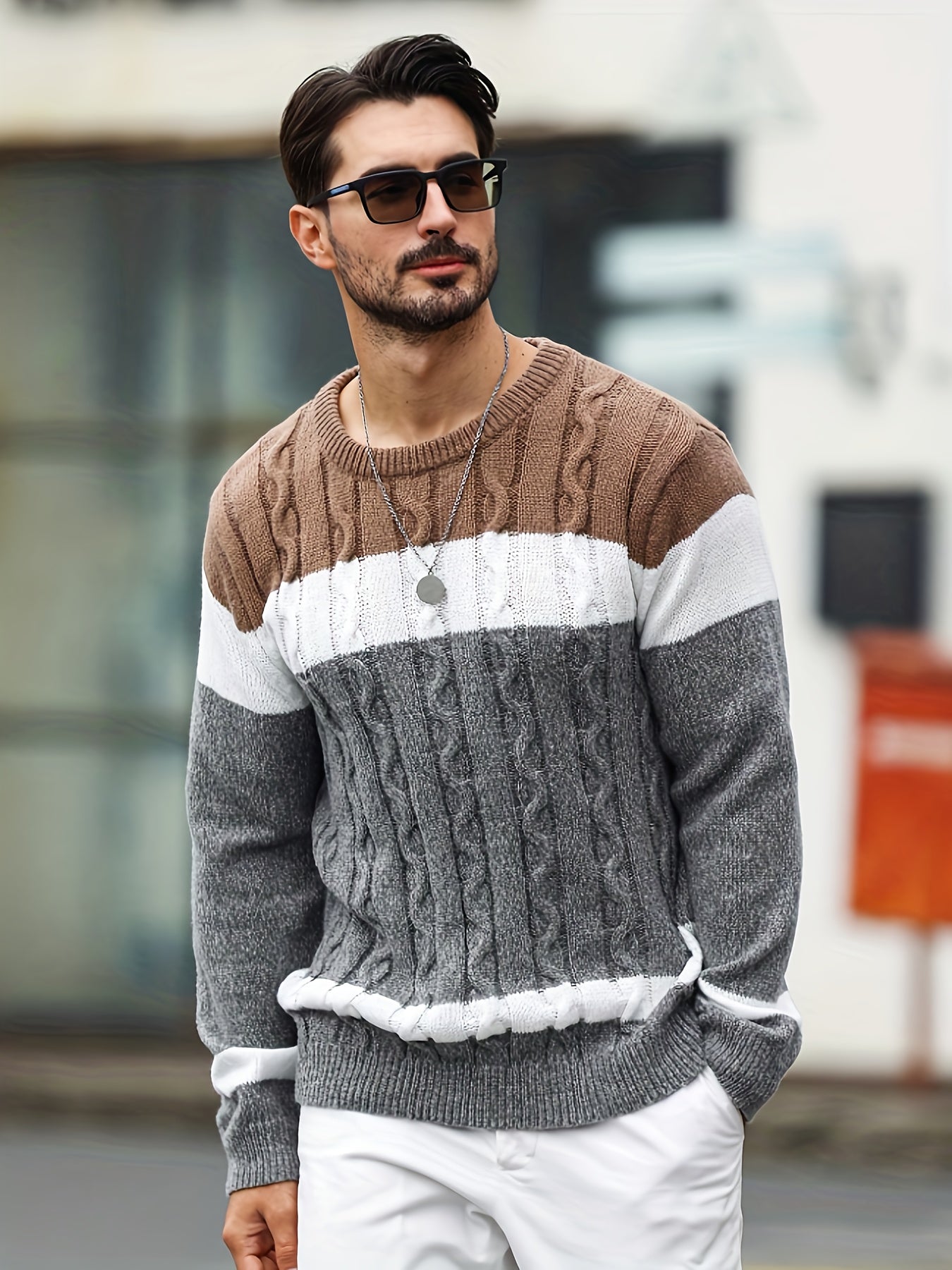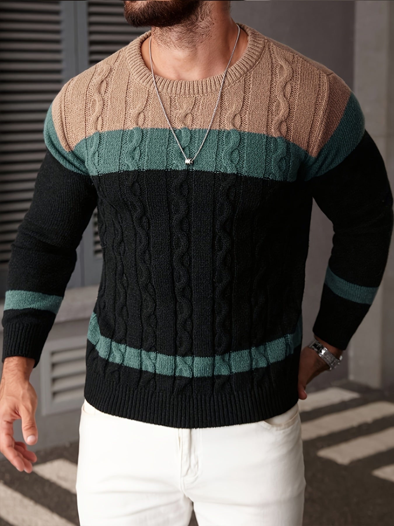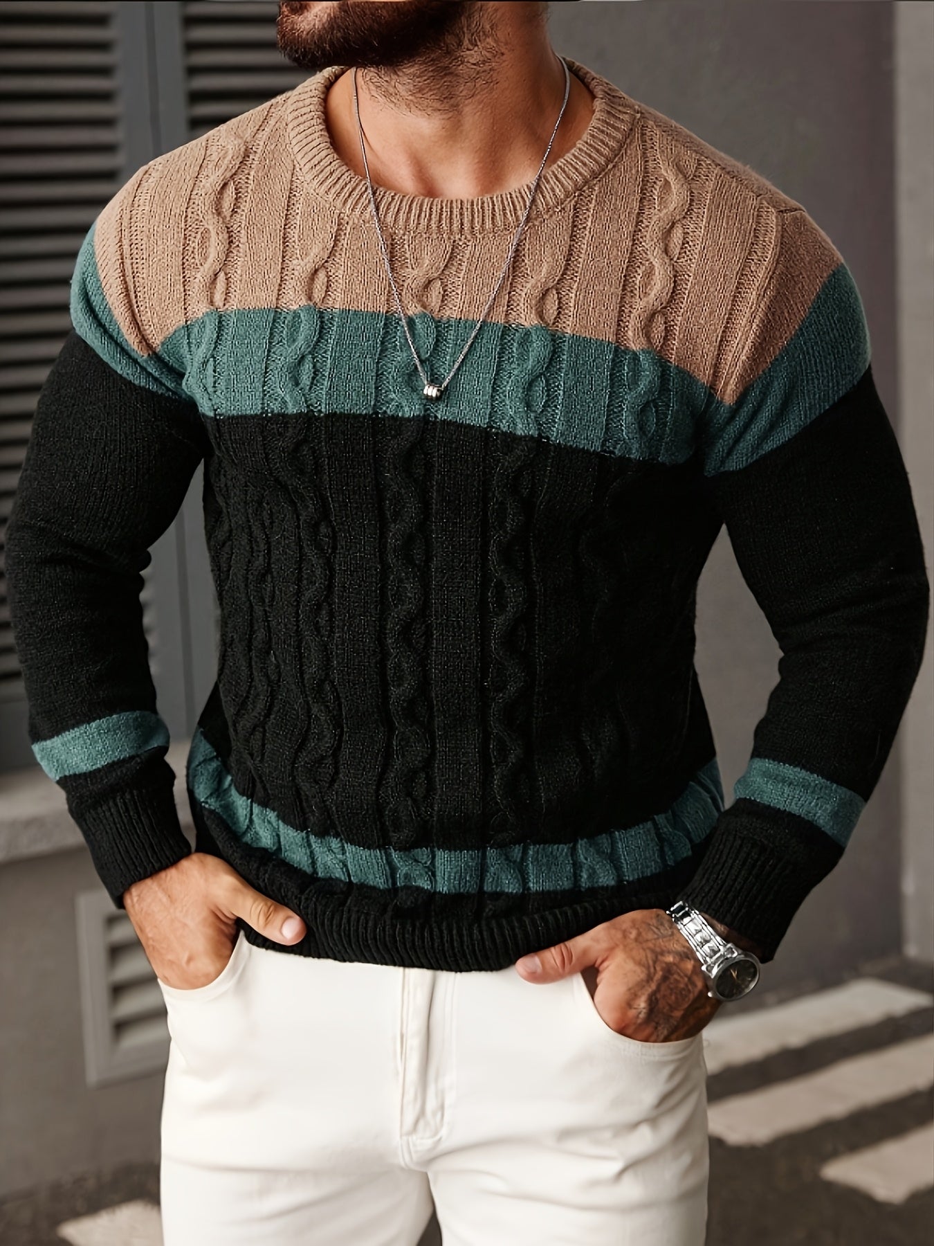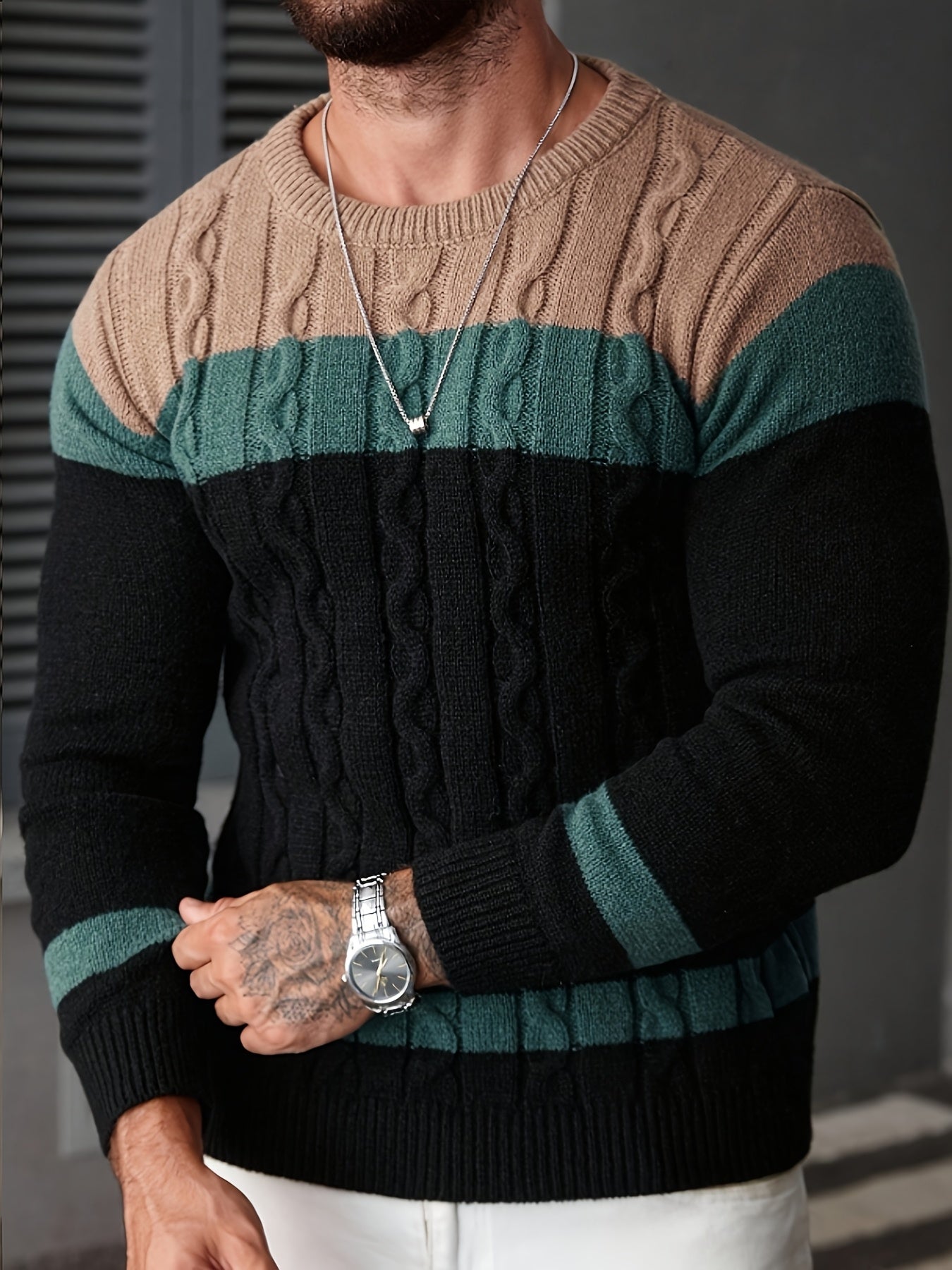 Տղամարդու գունավոր թվիդից տրիկոտաժե սվիտեր, կլոր օձիքով, երկար թևքերով, գունավոր տրիկոտաժե, բաց մոխրագույն՝ գործնական և առօրյա զբոսանքների համար