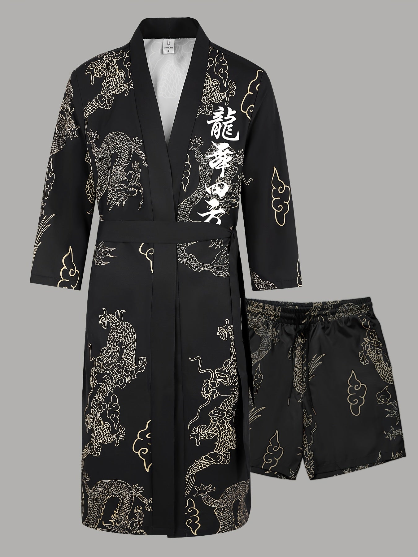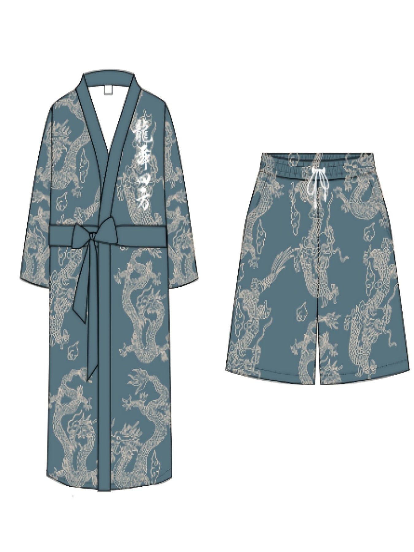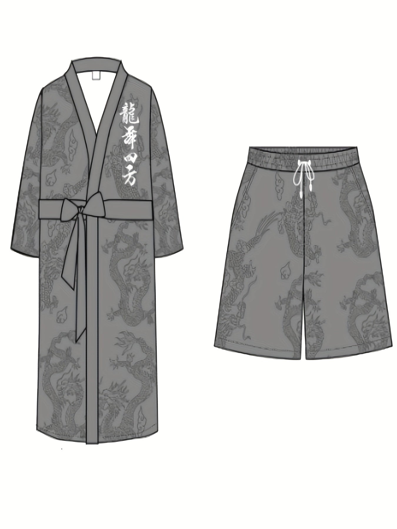 Տղամարդու վիշապի պարի քառակուսի վիշապի նախշերով խալաթի և շորտերի հավաքածու - V-ձև, չձգվող պոլիեսթերից տնային հագուստ գոտու դետալներով, սովորական չափսերով