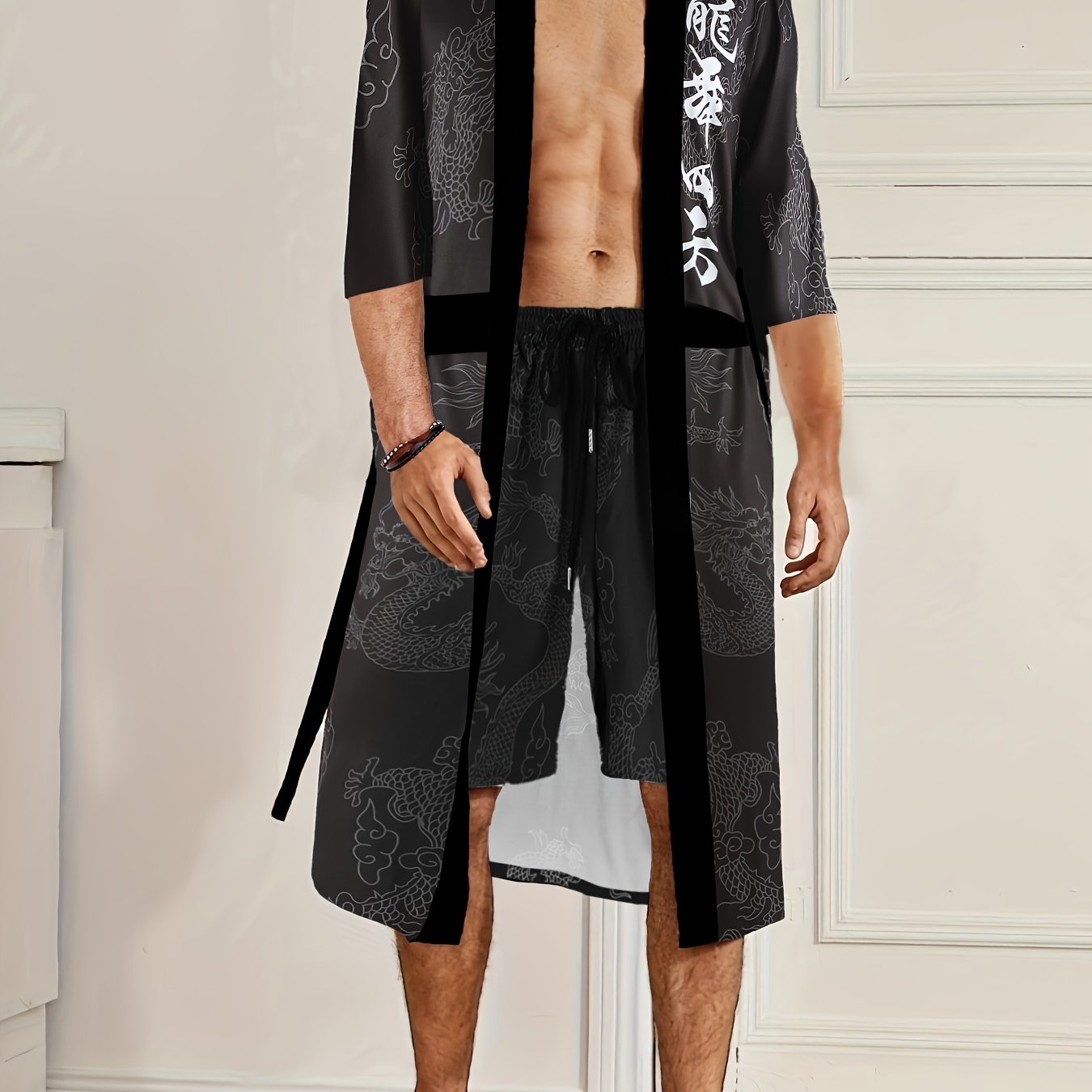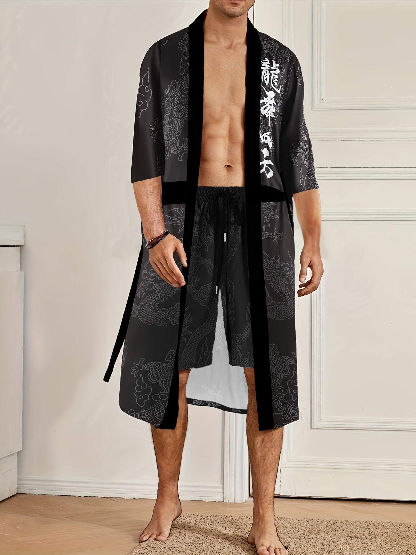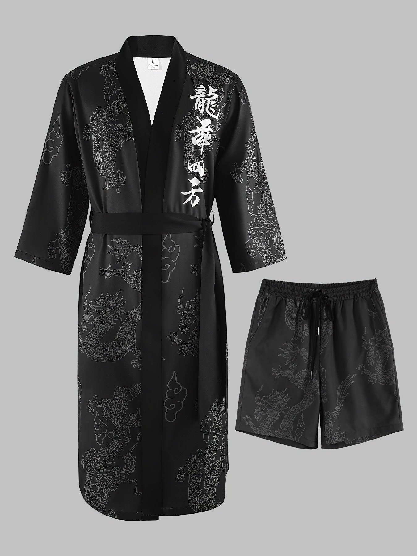 Տղամարդու վիշապի պարի քառակուսի վիշապի նախշերով խալաթի և շորտերի հավաքածու - V-ձև, չձգվող պոլիեսթերից տնային հագուստ գոտու դետալներով, սովորական չափսերով