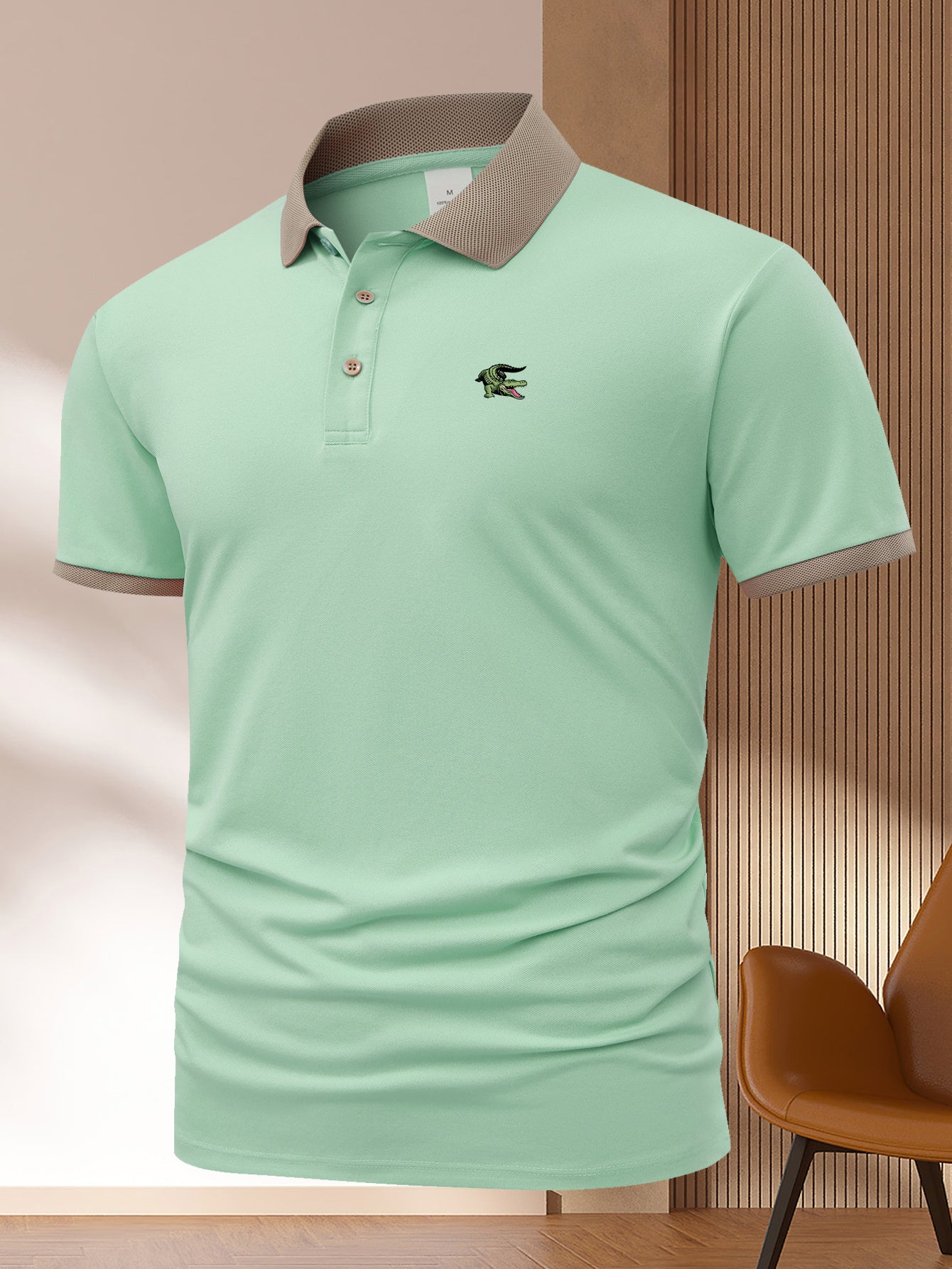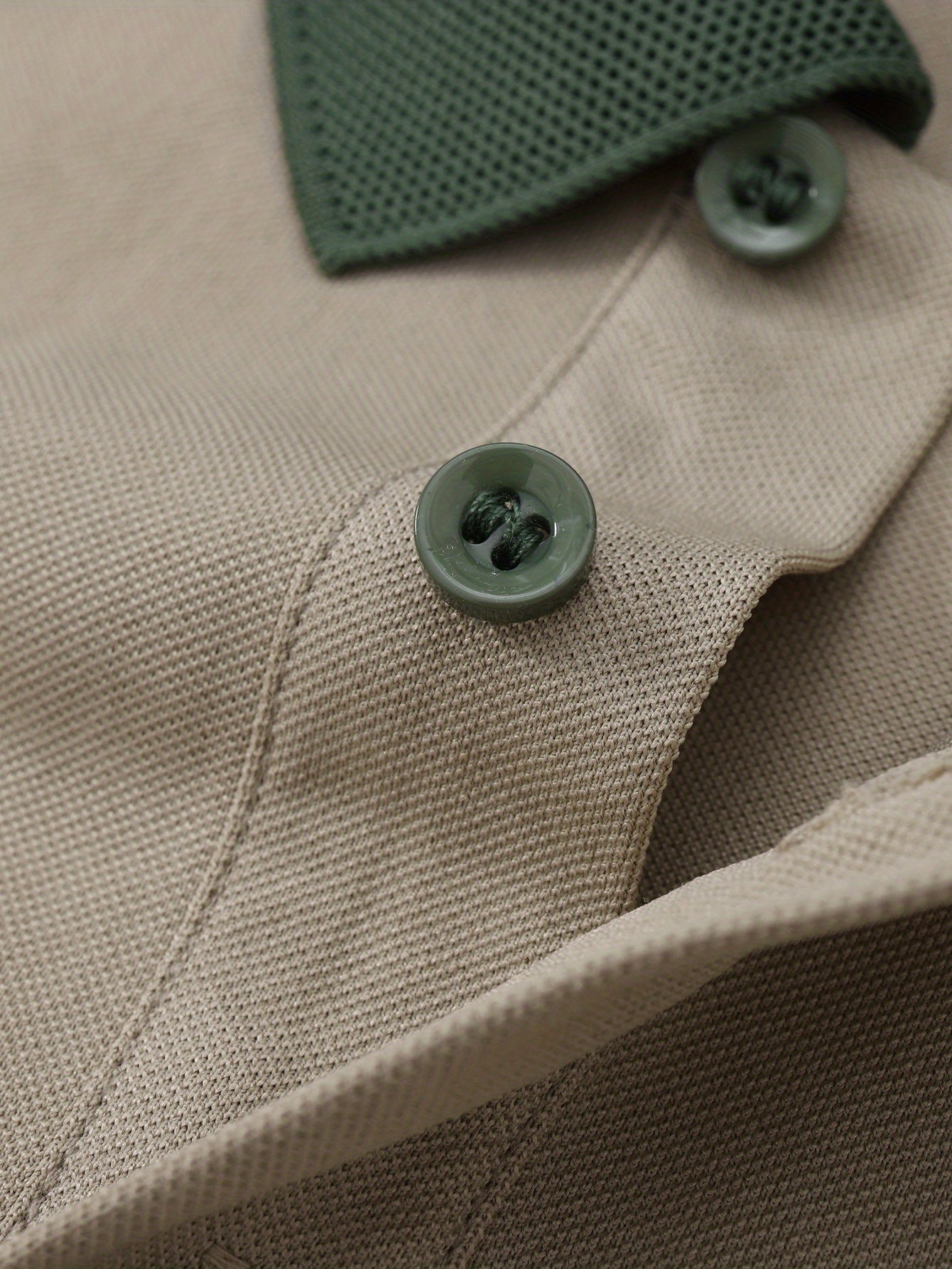 Տղամարդկանց նորաձև տրիկոտաժե գործվածքից պոլիեսթեր պոլո ոճի վերնաշապիկներ՝ սովորական պիտանի, սովորական ամառային գոլֆի վերնաշապիկներ՝ շղթայավոր օձիքով, թեթև ձգվող, կոճակով առջևում, երկրաչափական նախշ՝ մուգ, բաց կանաչ, խակի