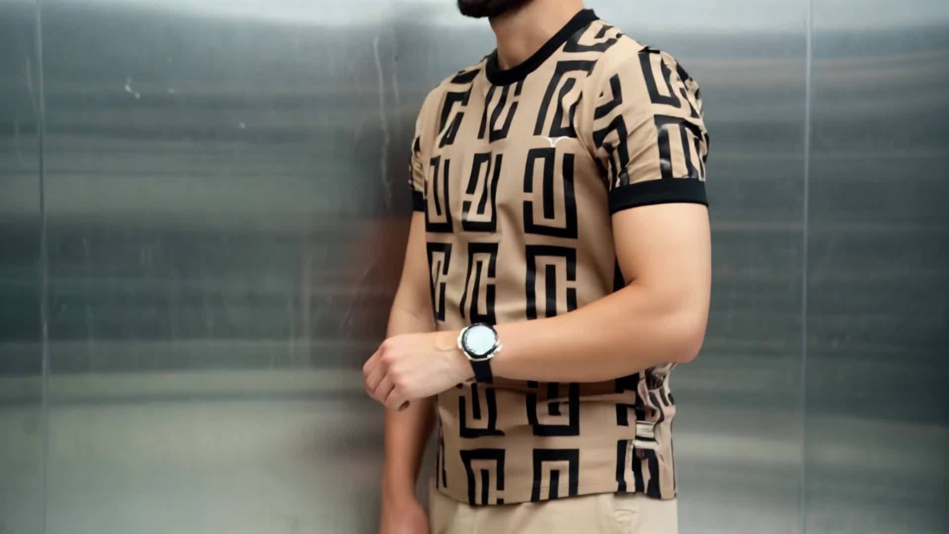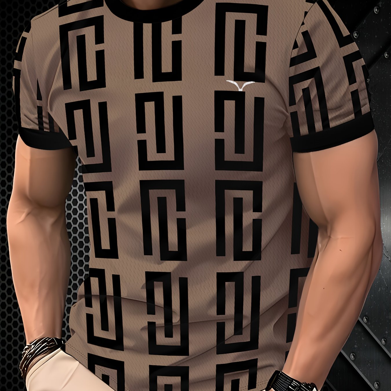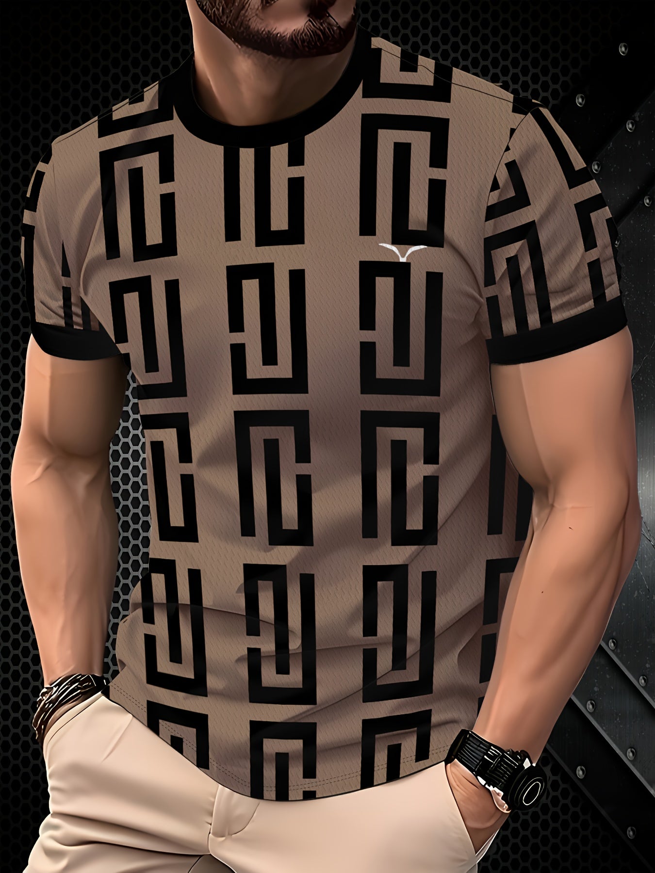 Տղամարդու երկրաչափական նախշերով շապիկ - ոճային սև-մոխրագույն նախշերով, կարճ թևքերով, կլոր վզնոցով, շնչող գործվածքով, իդեալական է ինչպես առօրյա, այնպես էլ պաշտոնական հագուստի համար, բազմակողմանի հագուստ, ժամանակակից տեսք, հարմարավետ չափսեր