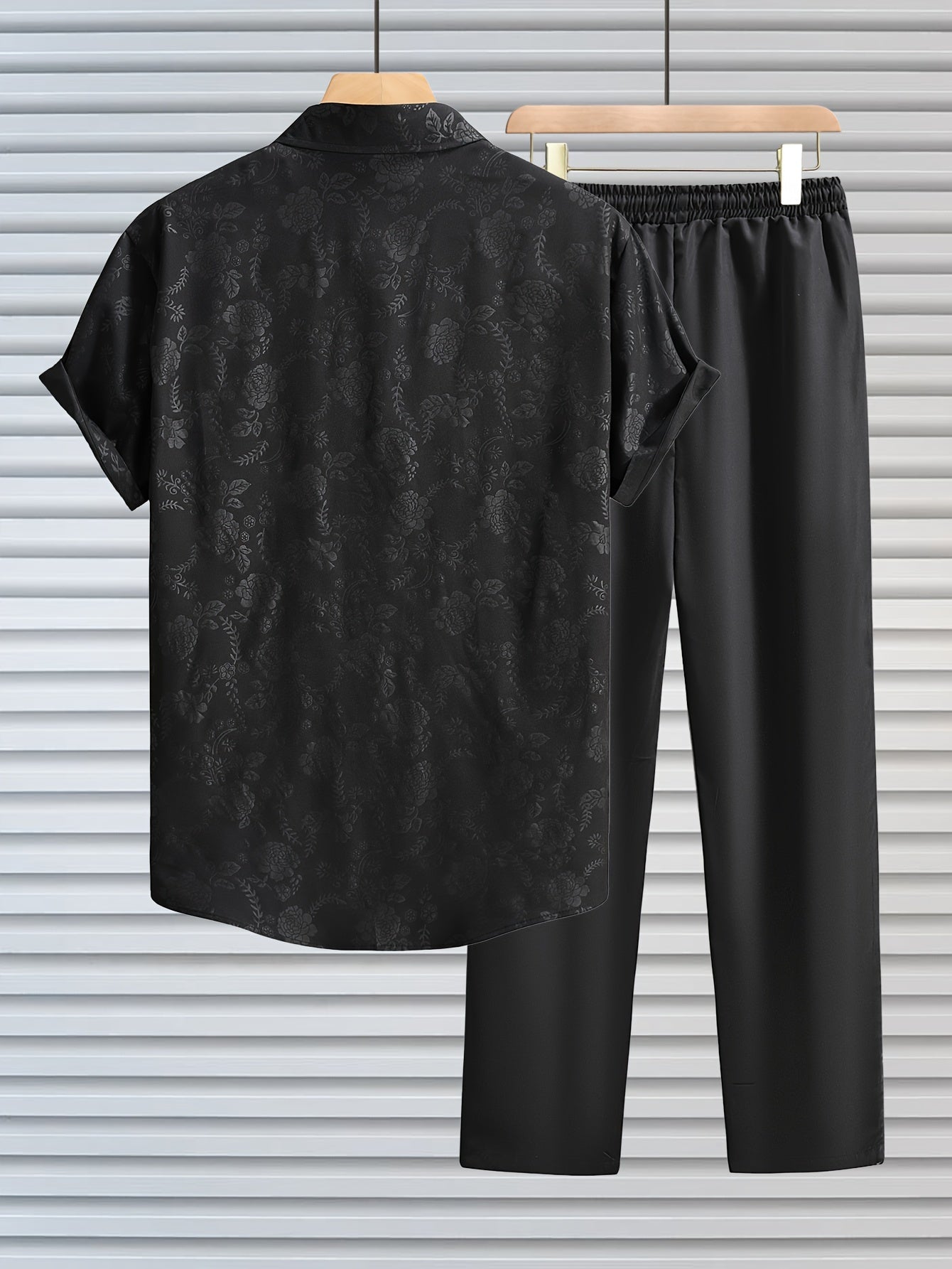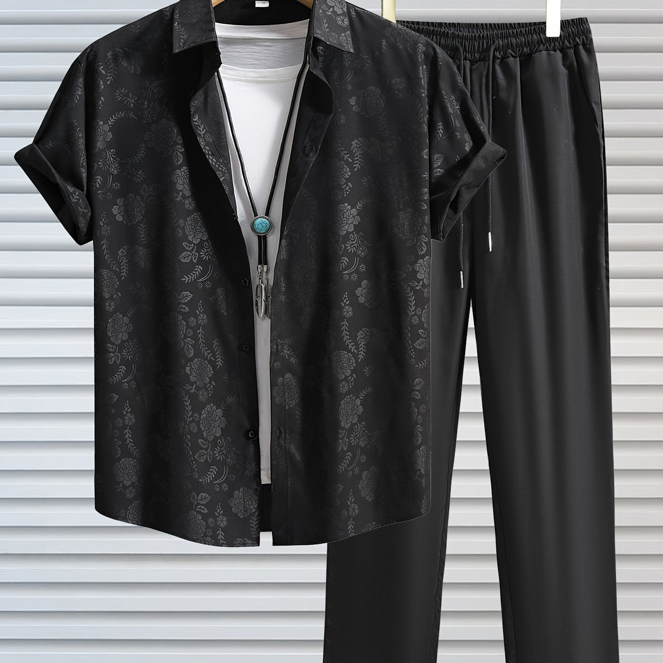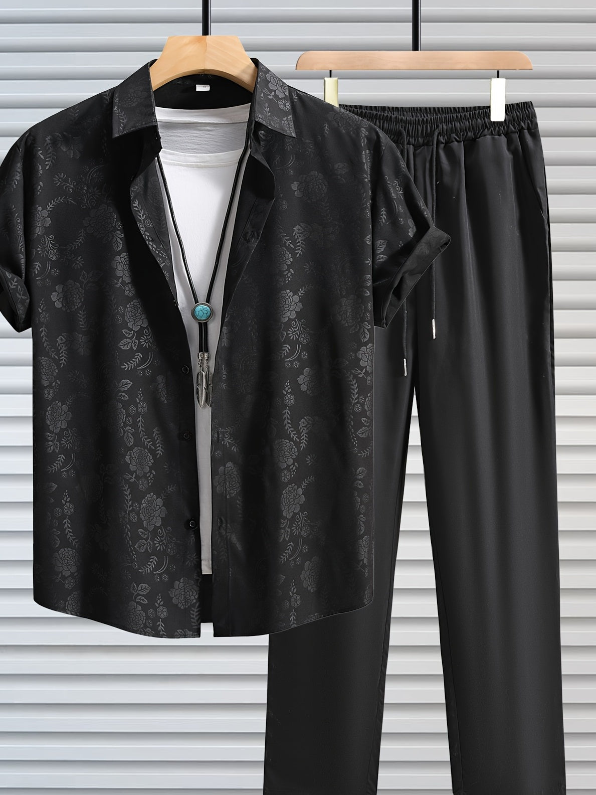 Տղամարդու հագուստ, ծաղկային գրաֆիկական նախշերով կարճ թևքով, կոճակներով վերնաշապիկ և լարով տաբատ, 2 մասից բաղկացած հավաքածու՝ բացօթյա գործունեության համար